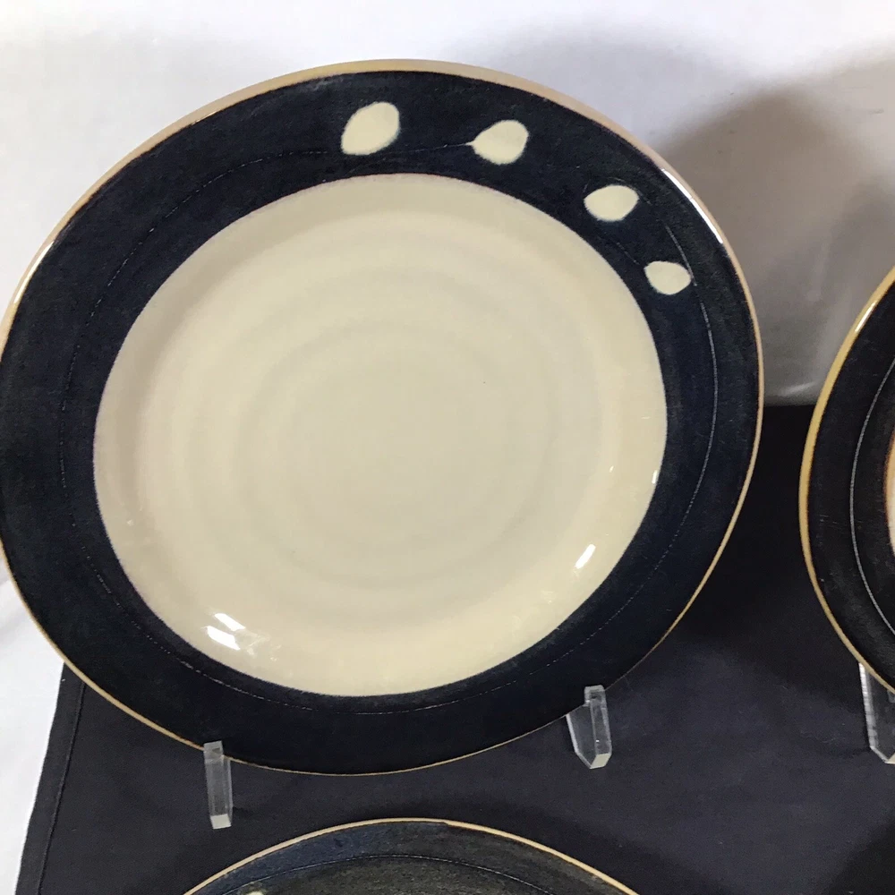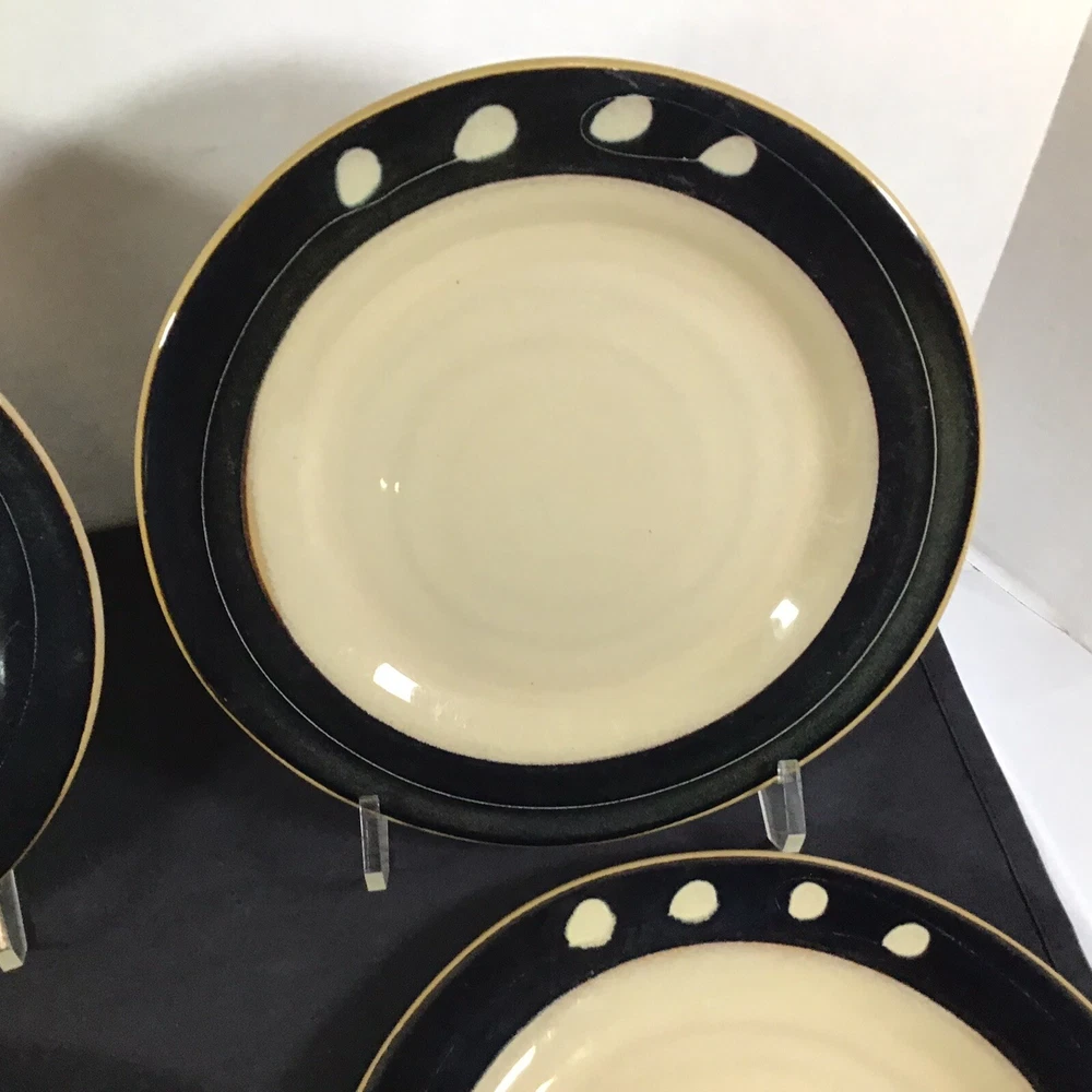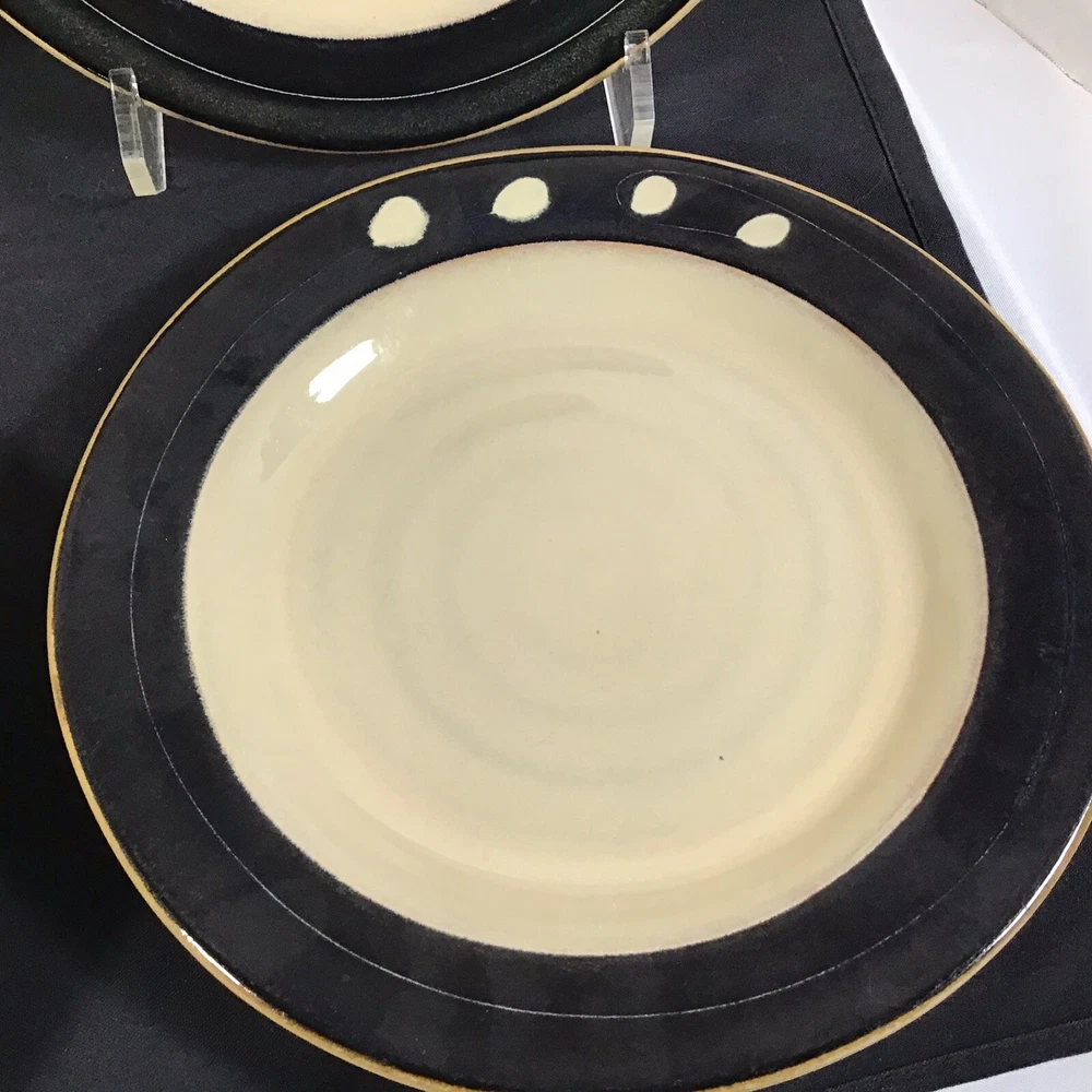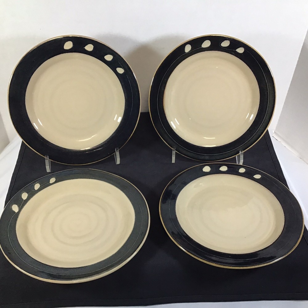 Up for your consideration is this lot of 4 Pier 1 Imports WHITE BLOSSOM Salad Plate 9" Beige Tan With Black Rim and four blossoms. Plates were used frequently and show normal wear and tear for a daily user. The Pier 1 back stamp has worn off due to frequent washings. No chips, cracks or crazing. As with all my listings if you’re not satisfied with your purchase or my described condition, please take advantage of my return policy. Plates are packaged and ready to mail today or the next business morning. Thanks for looking at my listing. jba-