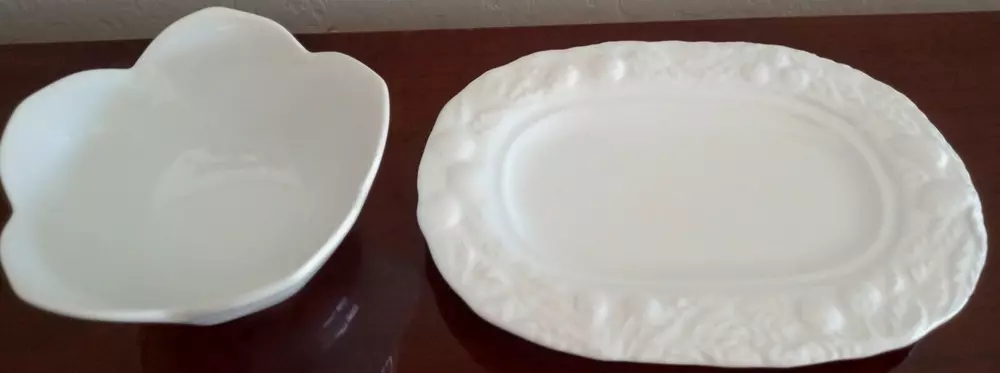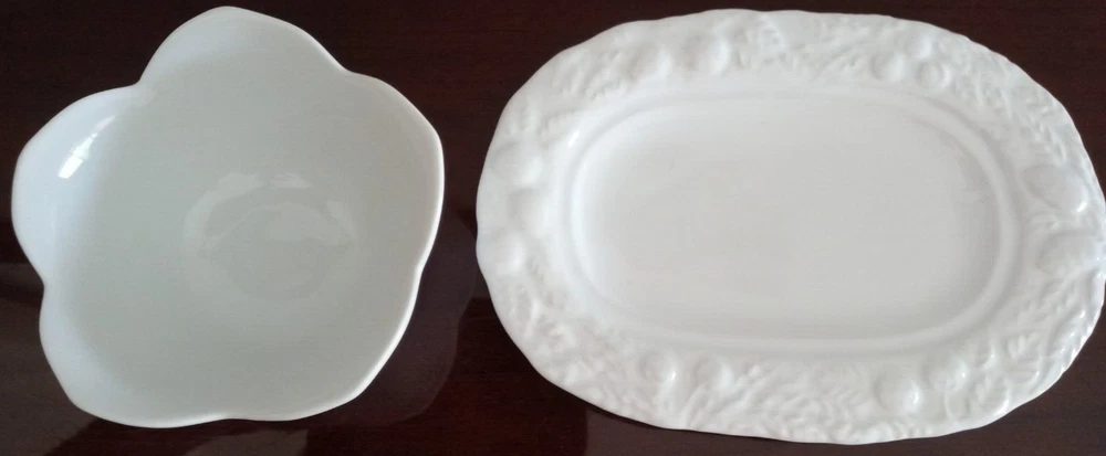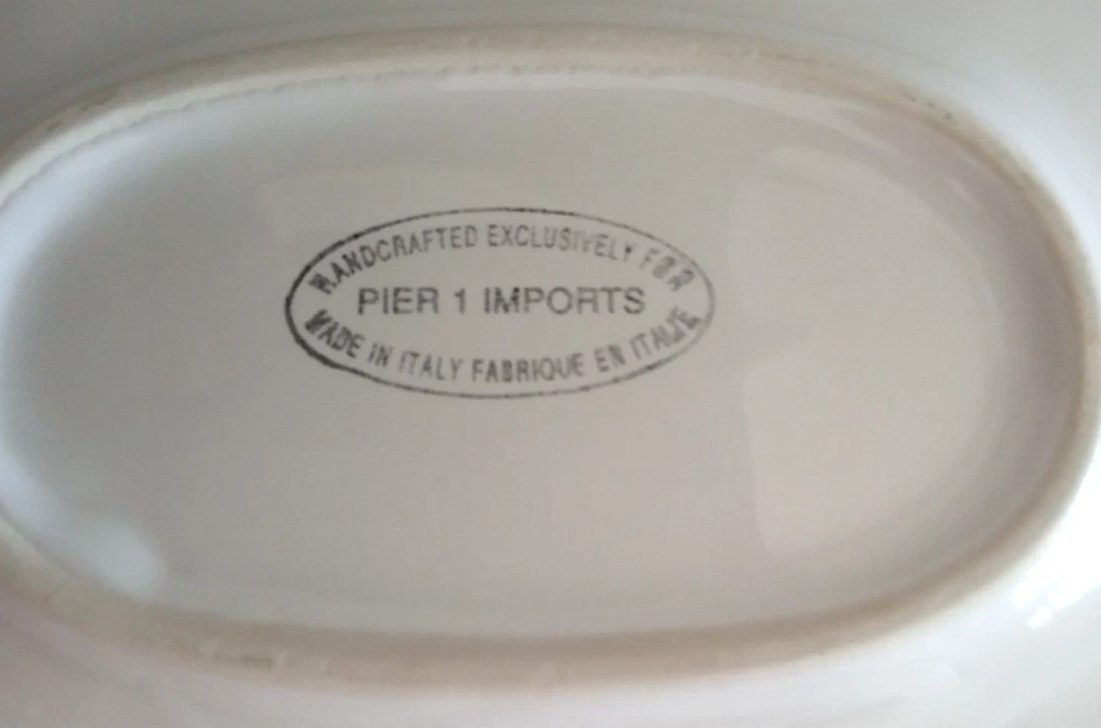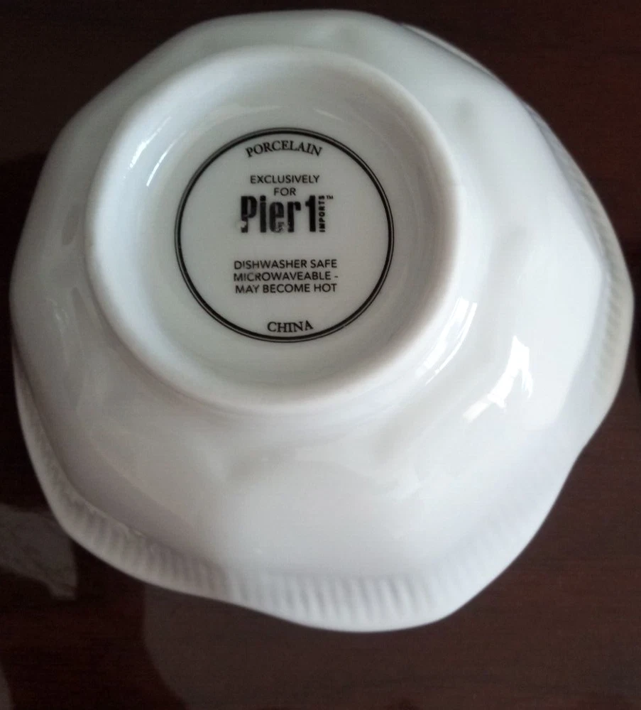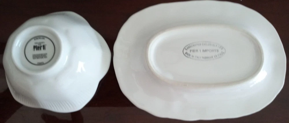 Add a touch of elegance to your dining table with this beautiful two-piece set remekin and relish plate from Pier 1 Imports. The porcelain remekin and ceramic relish plate feature a subtle floral pattern in white. The remekin is round at the base extending up and outward in a the fashion of a flower. The 7.5" relish plate is a rounded rectangle in equal solid white color trimmed with subtle flower arrangement. These items are both dishwasher and microwave safe making them perfect for everyday use and easy to clean. They have a glossy finish and are printed with the Pier 1 backstamp. The set weighs 15 oz and is perfect for serving fruits or other small dishes. Add a touch of sophistication to your dining experience with this exquisite set from Pier 1 Imports.