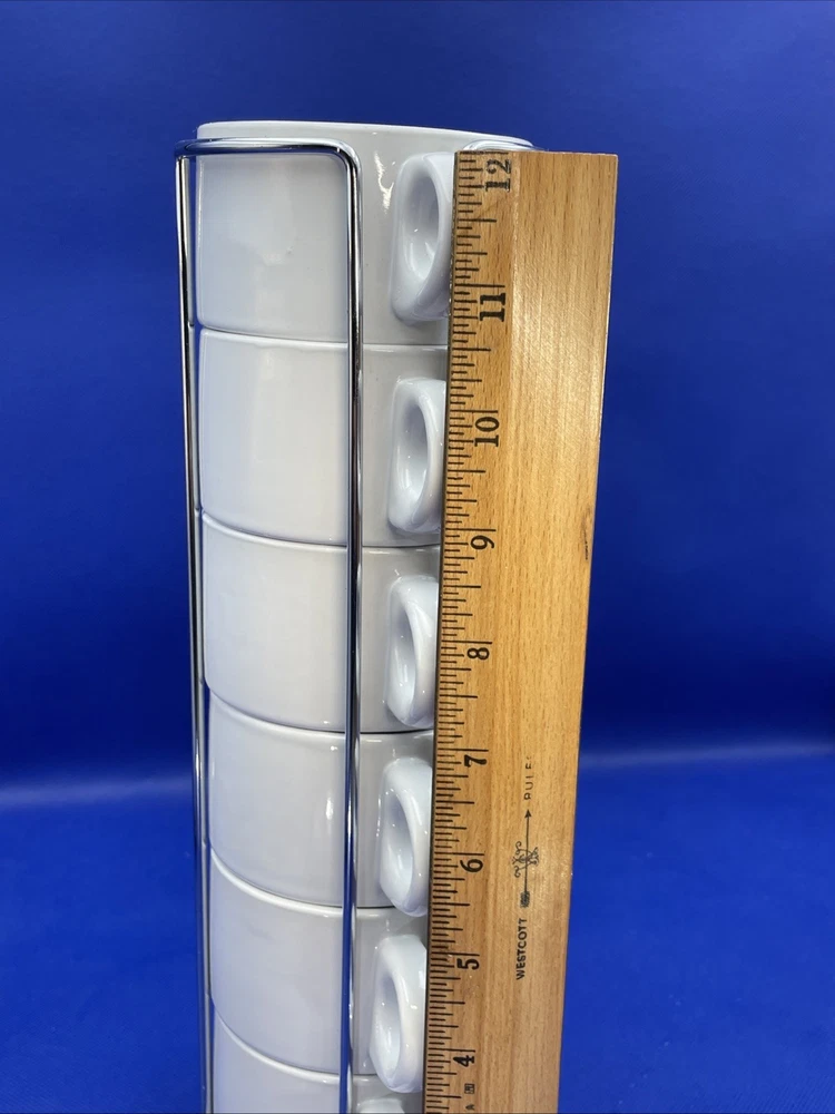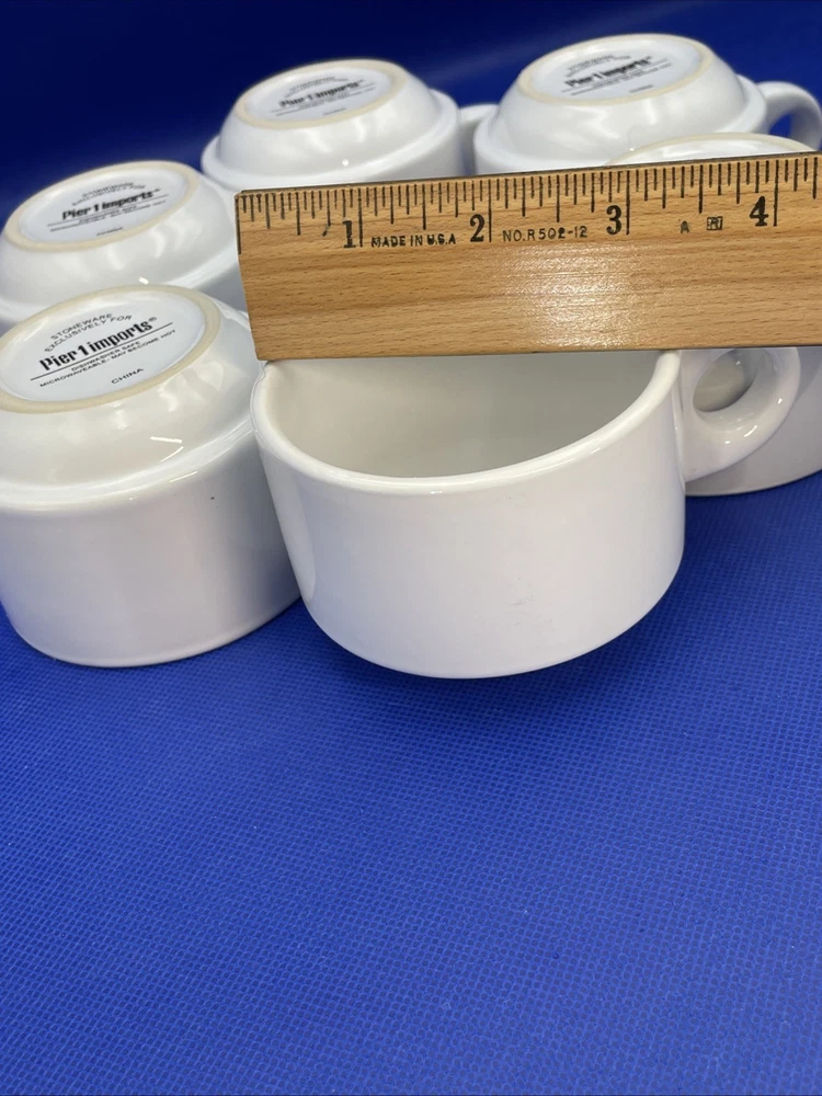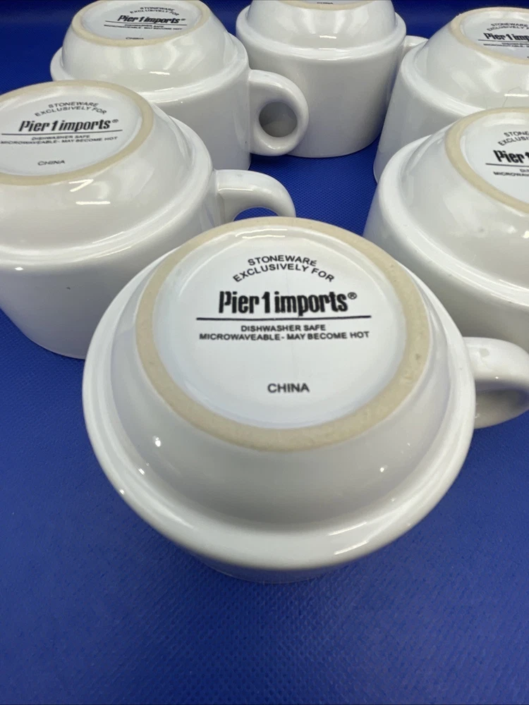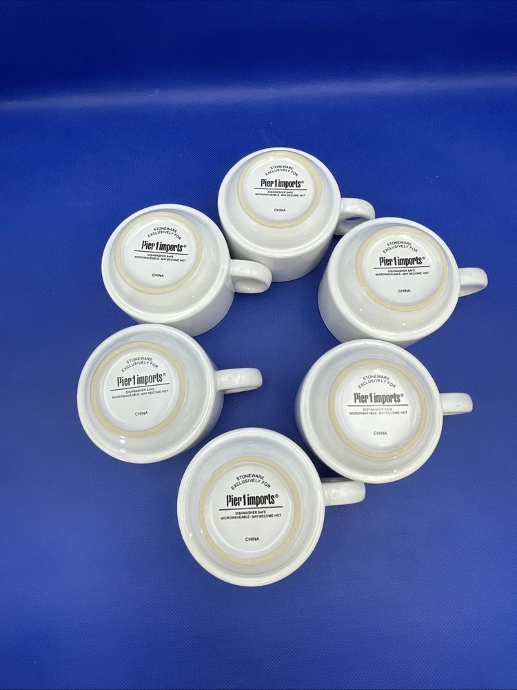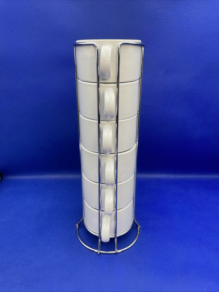 Elevate your morning routine with the sleek Pier 1 Imports White Stoneware 6 Coffee Mugs Set. Metal rack tower included. Each 8-ounce at full cup features a smooth, glossy finish and a versatile white color that complements any table setting. Designed for space saving contemporary living, these mugs are both dishwasher and microwave safe, simplifying your daily care instructions. The set's stackable design allows for convenient storage and organized saving you space without compromising on style. Complete with a matching metal rack, this seven-piece collection - six mugs and one rack - measures an impressive 12.5 inches in height, making it a striking display piece for all occasions. The set is in excellent condition appearing rarely used per our inspection. No stains. Backstamps clear and readable for care instructions. Some very random faint use marks/mold marks on the bottom rims only. Metal rack is excellent, stands straight, and not bent either. Please see pics and note condition standards within this description. Thank you for visiting! Excited to sell what we know and love! Offering a legacy of quality possessions of life. Our background has been the love of memorable gatherings and family times around the table! We marvel at the artistry, skill in craftsmanship, and gorgeous designs of fine china, dinnerware, and flatware which we know as tableware! We think of Items worthy to own or even pass on for generations. Enjoy your purchase! We are working hard to provide vivid professional photos, describe items as we would want to know if we were the buyer, and work to offer only what passes our inspection! For instance, we check for defects such as cracks, chips, or crazing. We check flatware for spoon edge dents, bent fork tines, or bent knife tips too. Please feel free to easily communicate with us via “message” seller for questions. Our condition standards are as follows: Vintage Good - Age use marks present. NO damage such as NO chips, cracks, crazing, edge dents, bent tines, or tips. Very Good - Minor use marks present. NO damage such as NO chips, cracks or crazing, edge dents, bent tines, or tips. Excellent - Very faint minor use marks present. NO chips, cracks, crazing or in flatware no edge dents, bent tines, or tips. Near mint. Pristine Mint - NO use marks. NO damage such as NO chips, cracks, crazing, edge dents, bent tines or tips. Rarely used or new. We list top quality items in passed inspection condition. We absolutely care about our customer satisfaction with every purchase. Please feel free to communicate with us via “message” seller for questions. Positive “feedback” is appreciated and thank you for your time in doing this. Take Note: *We take pride in “quality”packing with the successful intent your items arrive in excellent shape! We as sellers deliver to the “shipper” within eBay required shipping window. Keep in mind, projected arrival times to the address of your item can be either ahead or delayed by the shipper once package is in transit. Tracking is provided. Please DOUBLE CHECK before ordering that your “ship to” address is the way you want it! *All our fine tableware items are washed and cleaned before listing so what you see in the pics is the representation at its best *We are absolutely committed to an awesome customer experience. Thank you again for your positive feedback and know we appreciate your decision to buy from us.