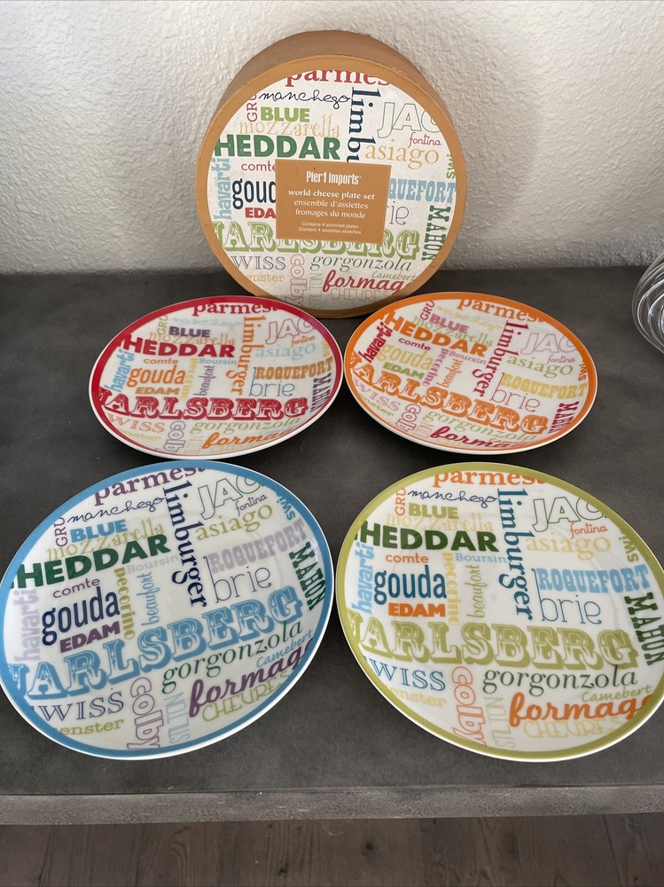 Pier 1 Imports World Cheese Plate Complete Set 4 Assorted Plates Appetizers 6.5". In original packaging...