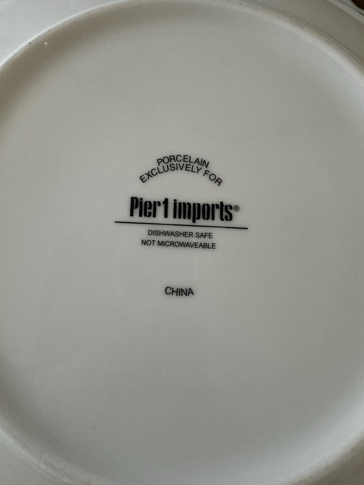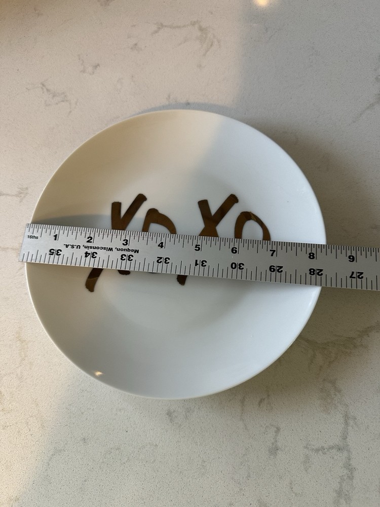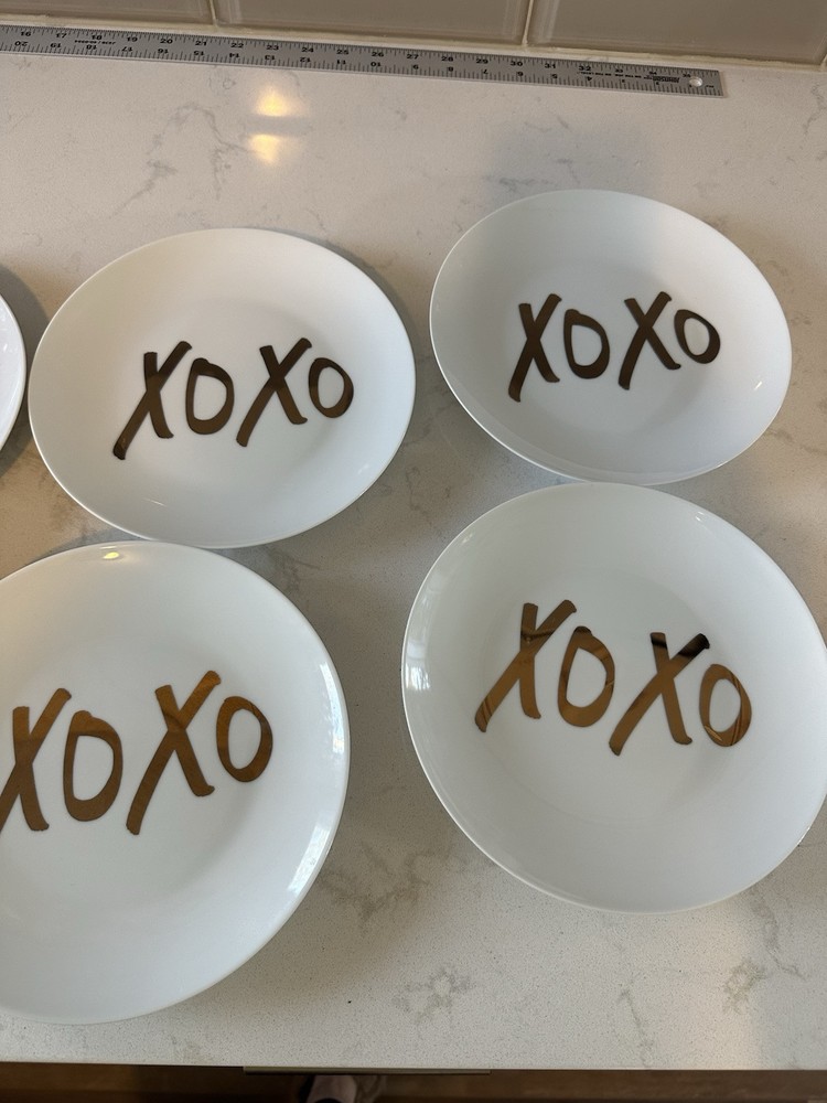 The Pier 1 Imports XOXO Dessert Plates Set features six round porcelain plates with a charming XOXO pattern in white and gold tone letters, each measuring 8 inches in length. Perfect for all occasions, these contemporary style plates can be used for dessert, salad, or as decorative pieces. Dishwasher safe for convenience, they bring a touch of love with a kiss and hug theme to your table setting. Ideal for adding a stylish and playful element to your dining experience. Excellent condition