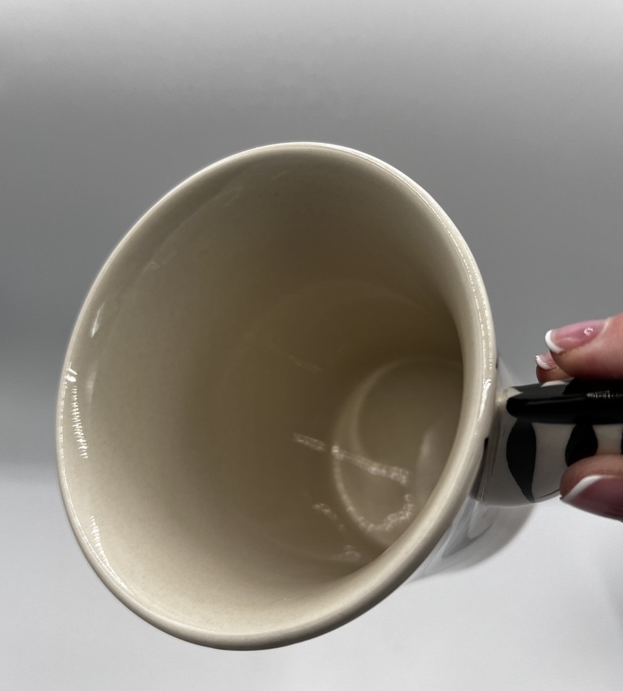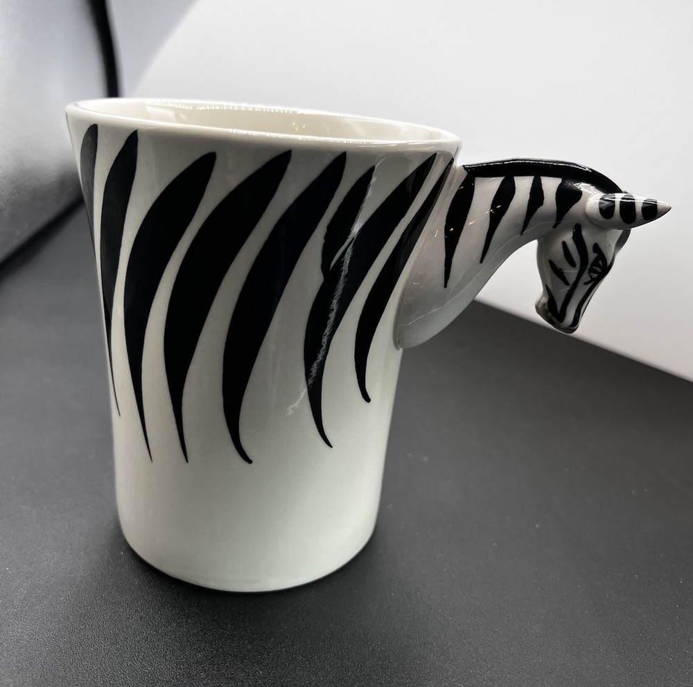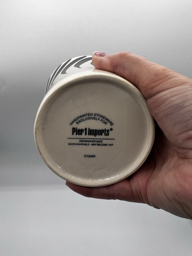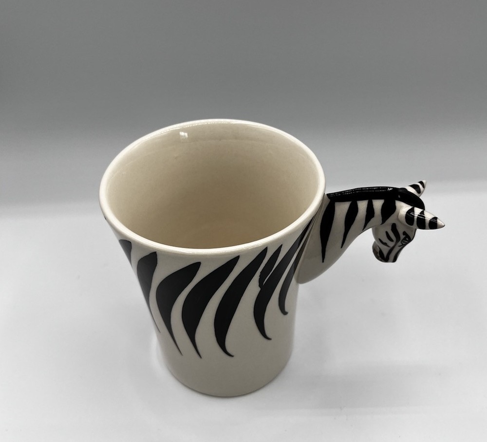 This Pier 1 Imports Zebra Mug features a unique 3D zebra head handle and a tapered shape, perfect for enjoying hot or cold beverages. Handmade from stoneware with a hand-painted design, this contemporary mug has a 16 fl.oz. capacity and is dishwasher and microwave safe. The black and white zebra print pattern adds a touch of wild animal flair to any drinkware collection, making it a stylish choice for all occasions.