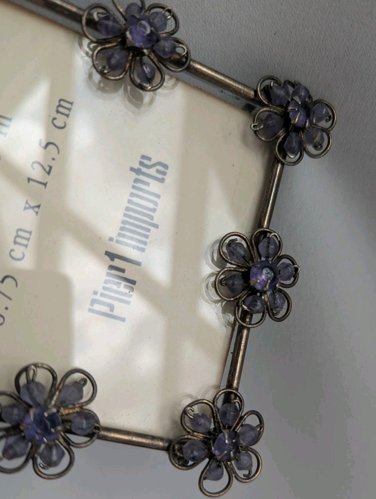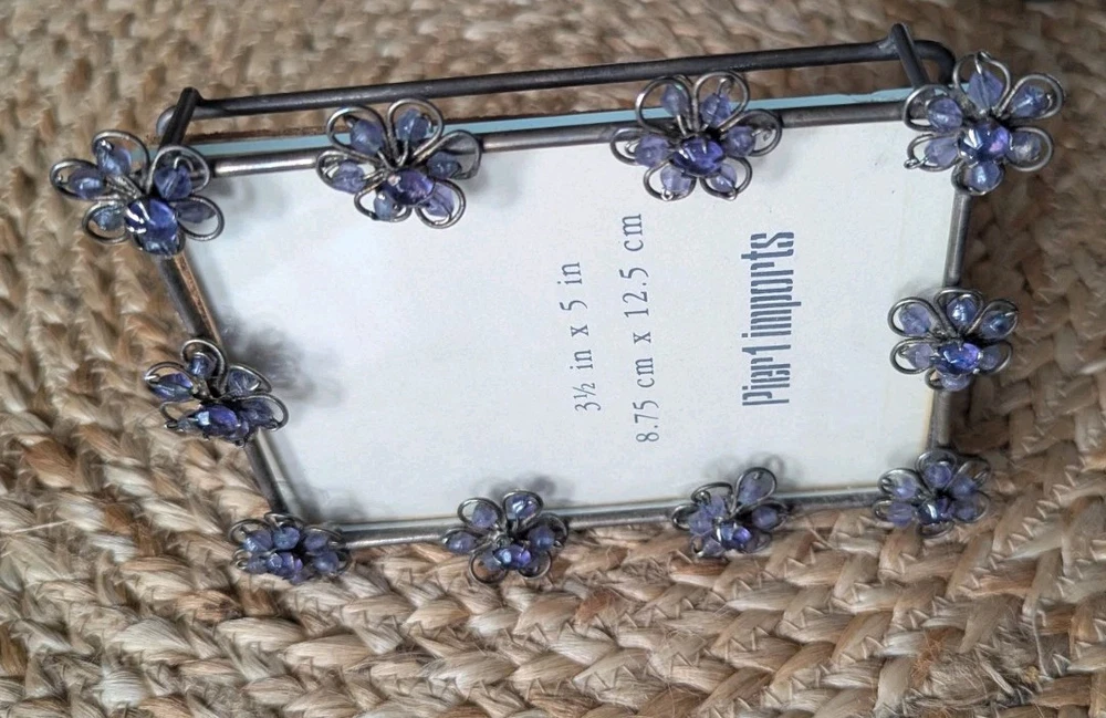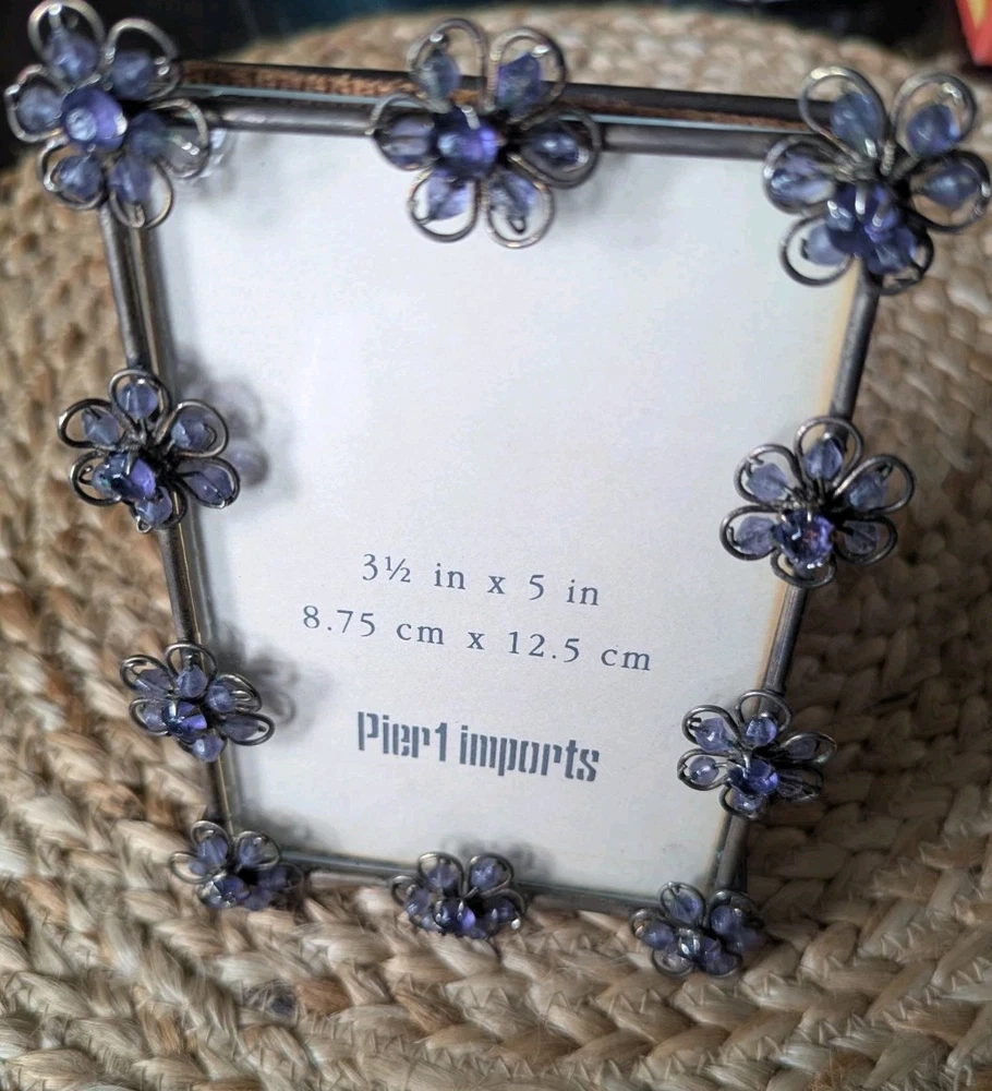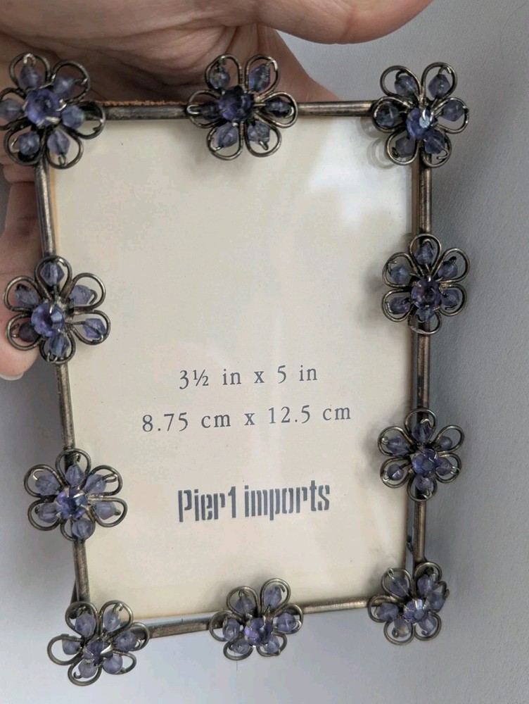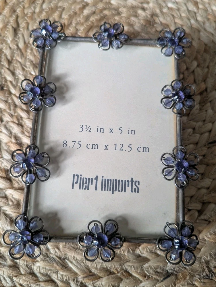 With the design that's on the back you can smash flowers in it . Key details beautiful Design: It has a rustic metal frame adorned with decorative flowers featuring purple-colored accents. Style: The frame's design is described as vintage and ornate. Material: It is made of metal. Retailer Status: Pier 1 Imports transitioned to an online retailer after previously operating as a retail chain.