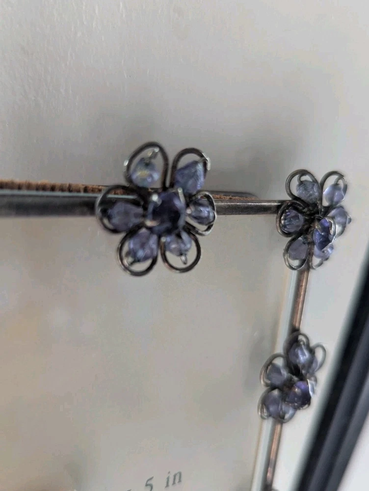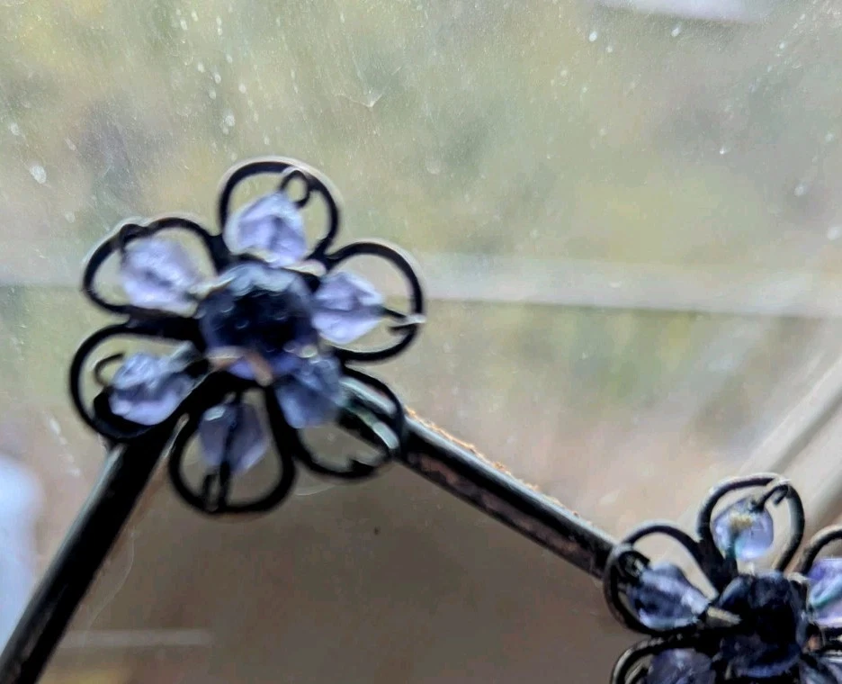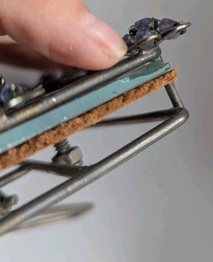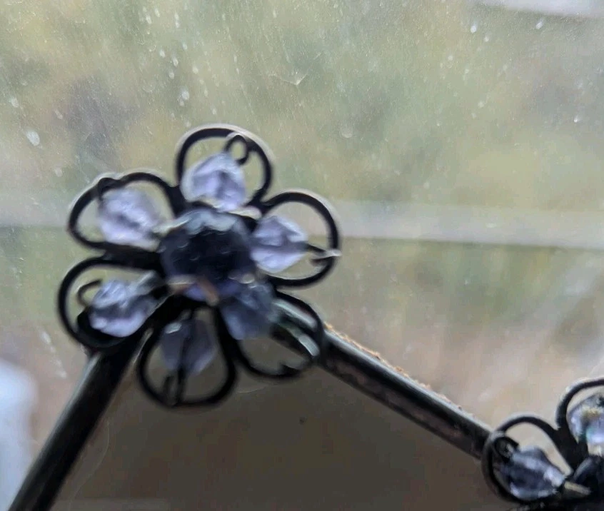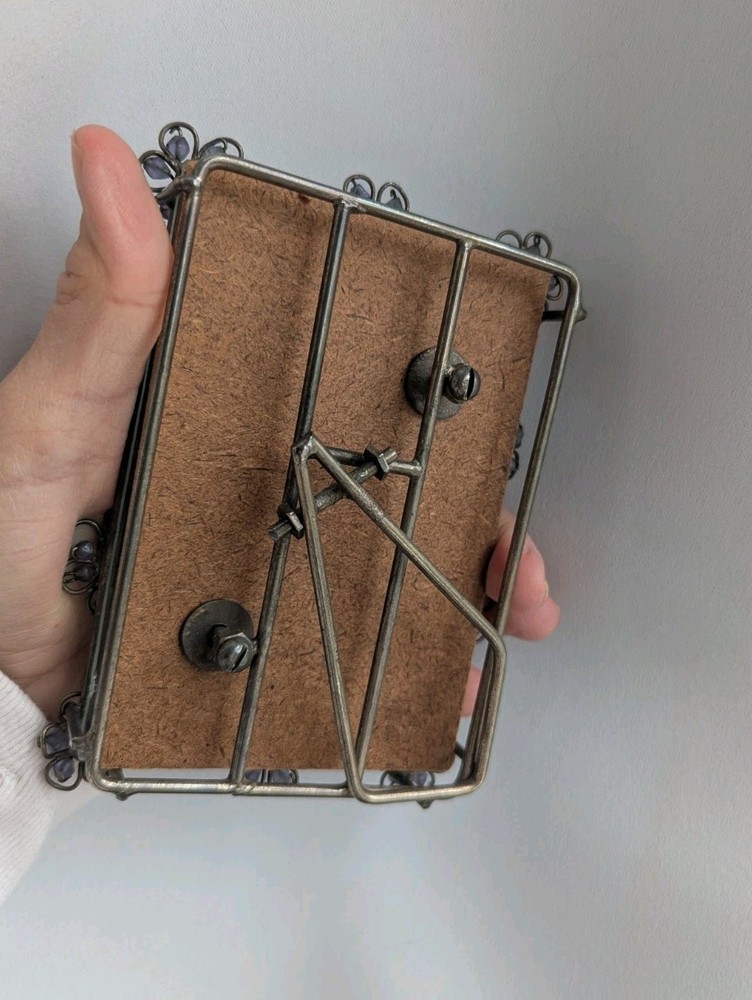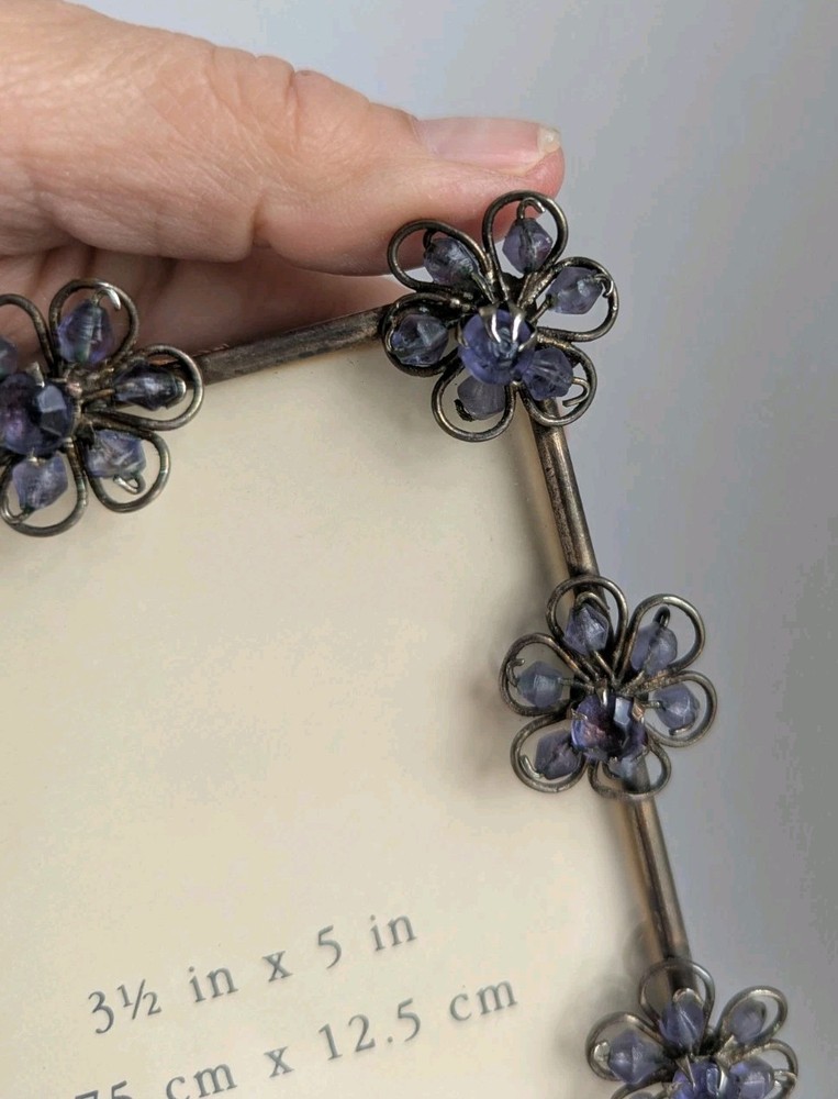 With the design that's on the back you can smash flowers in it . Key details beautiful Design: It has a rustic metal frame adorned with decorative flowers featuring purple-colored accents. Style: The frame's design is described as vintage and ornate. Material: It is made of metal. Retailer Status: Pier 1 Imports transitioned to an online retailer after previously operating as a retail chain.