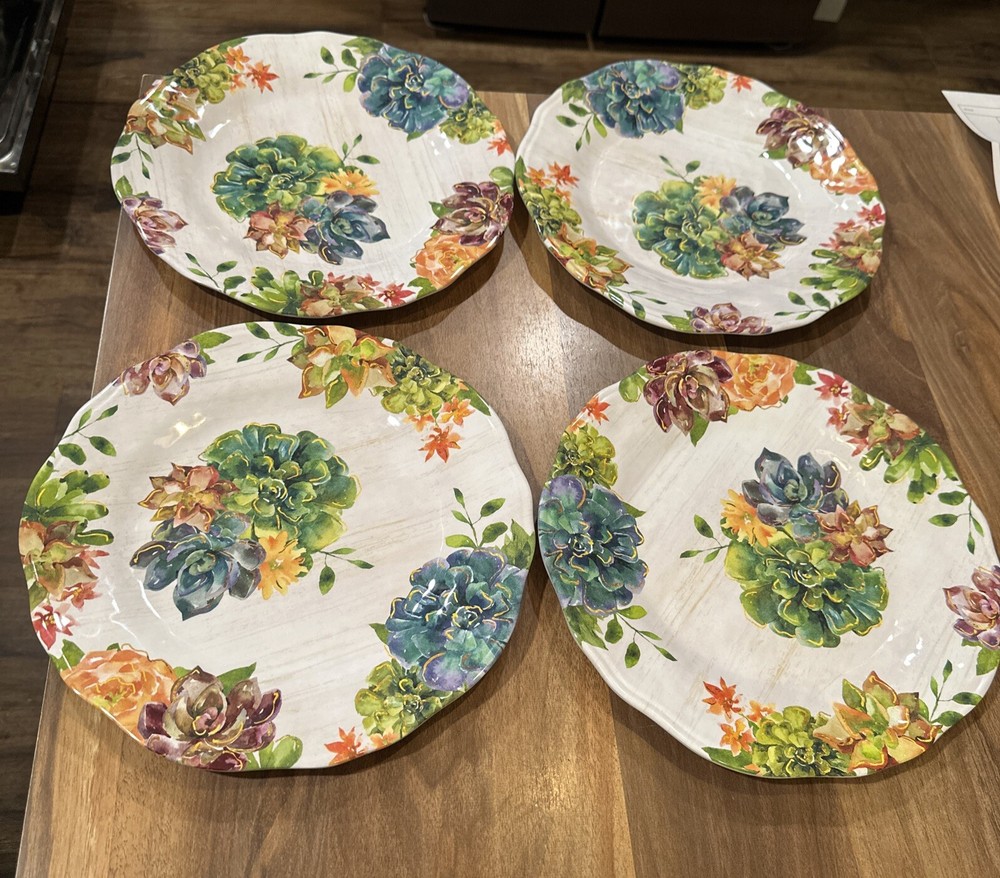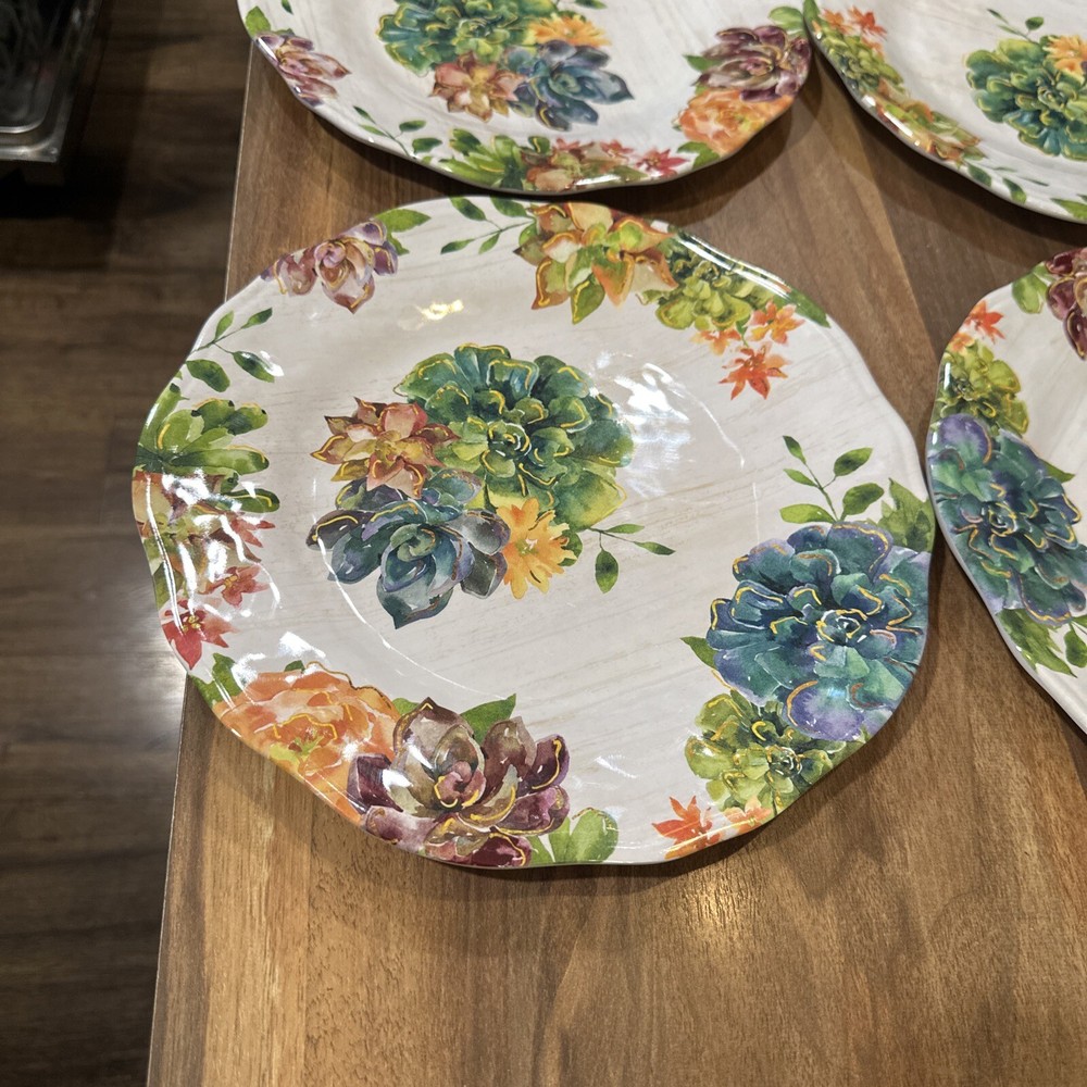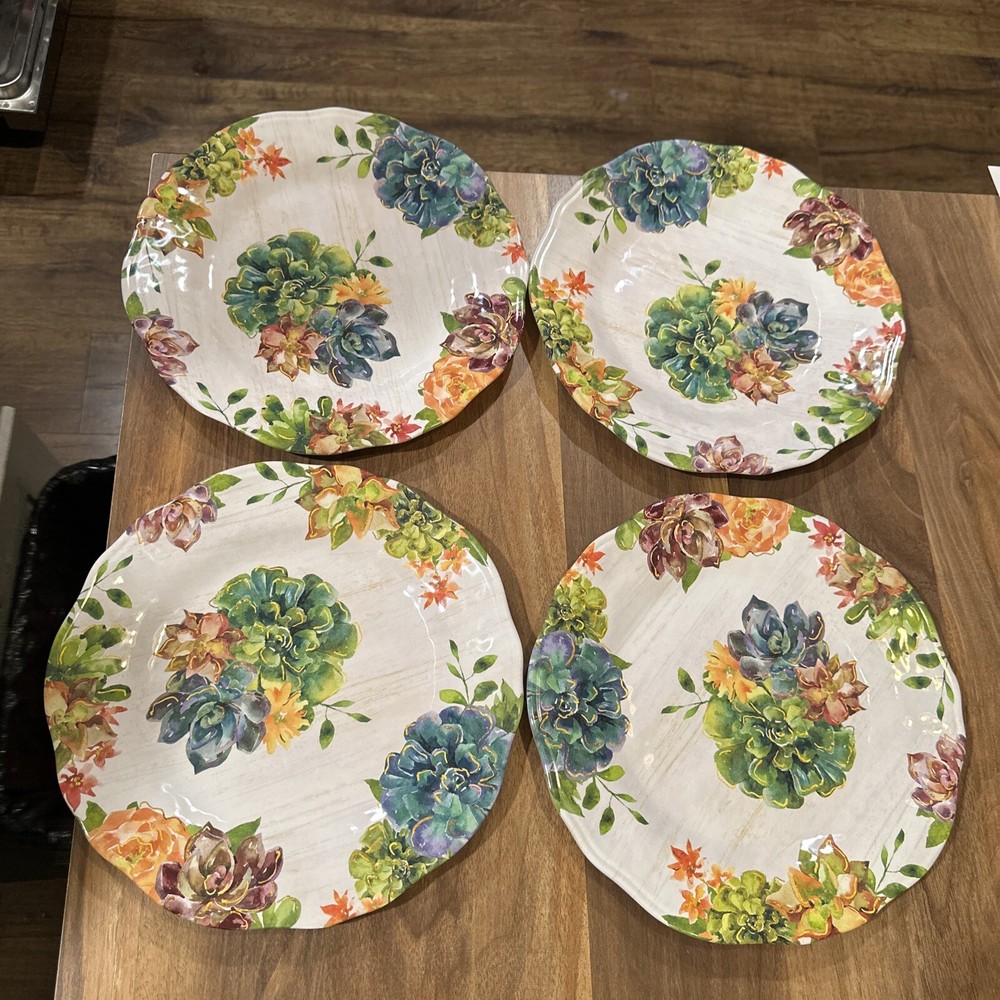 Each plate measures approximately 11" diameter Like new condition no utensil marks. Will be carefully packaged and promptly shipped with tracking number. I have other pieces in this Pier 1 Succulents pattern. More than Happy to combine for shipping and Bundle discount! Ships same or next day from a clean, smoke free home.
