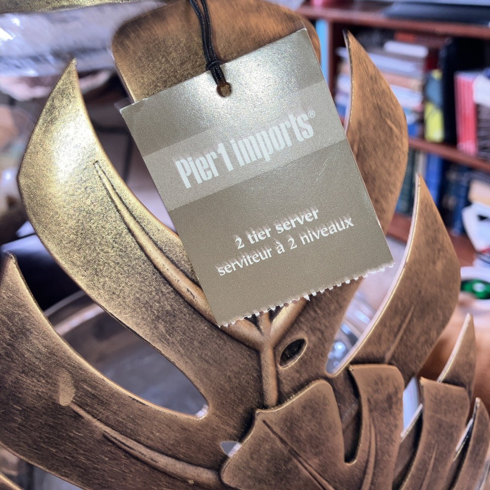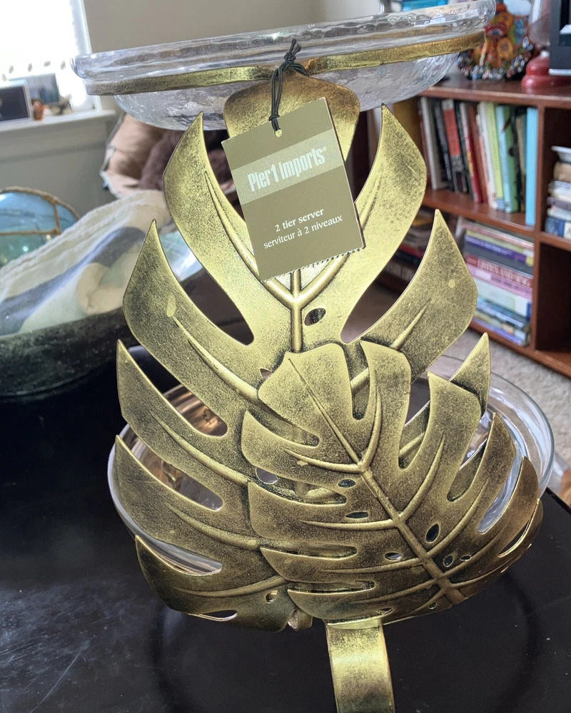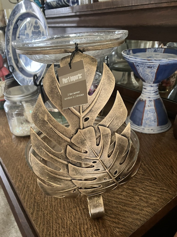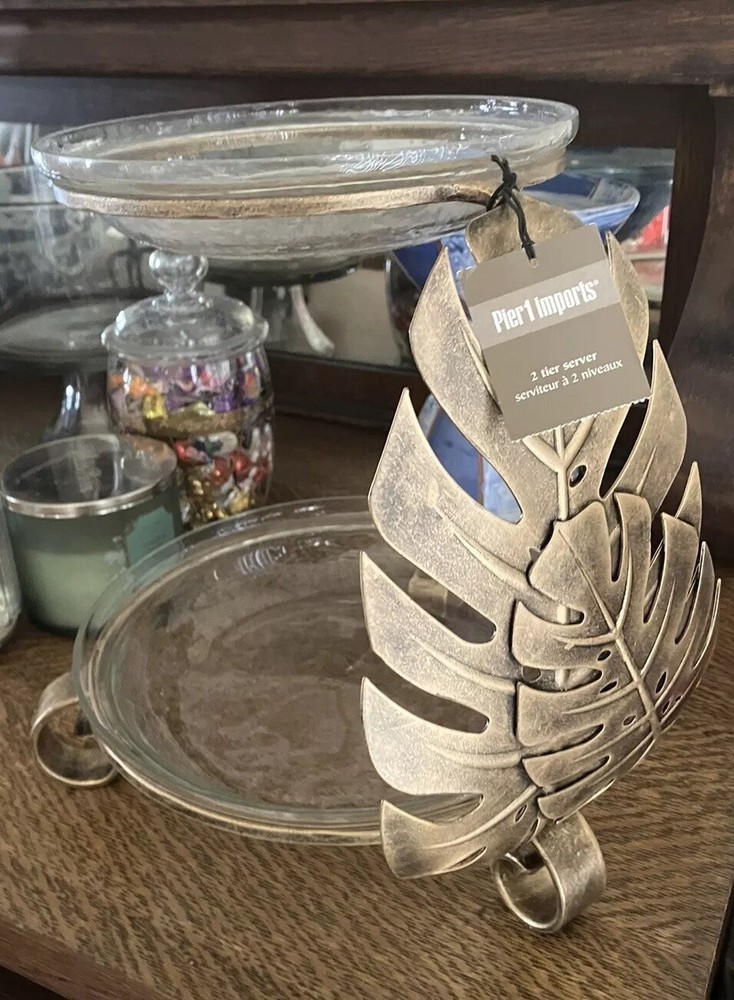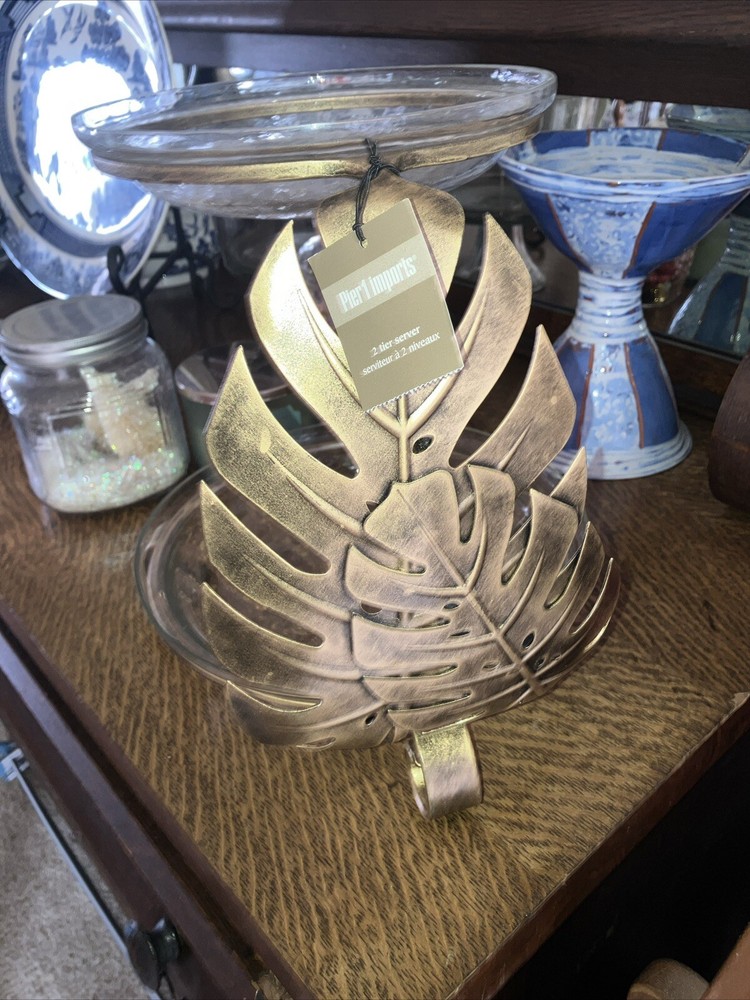 This Pier 1 Imports serving platter features a tropical design in antiqued gold. It has two tiers with a contemporary style and a matte finish. The platter is 12 inches long and includes a stand for display. Made from mixed materials, this large platter is perfect for serving hors d’oeuvres at any occasion. Originating from India, this new item showcases a unique and elegant design. Top glass plate is 8in and bottom plate is 12