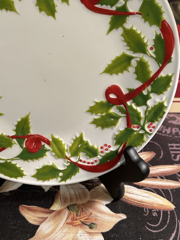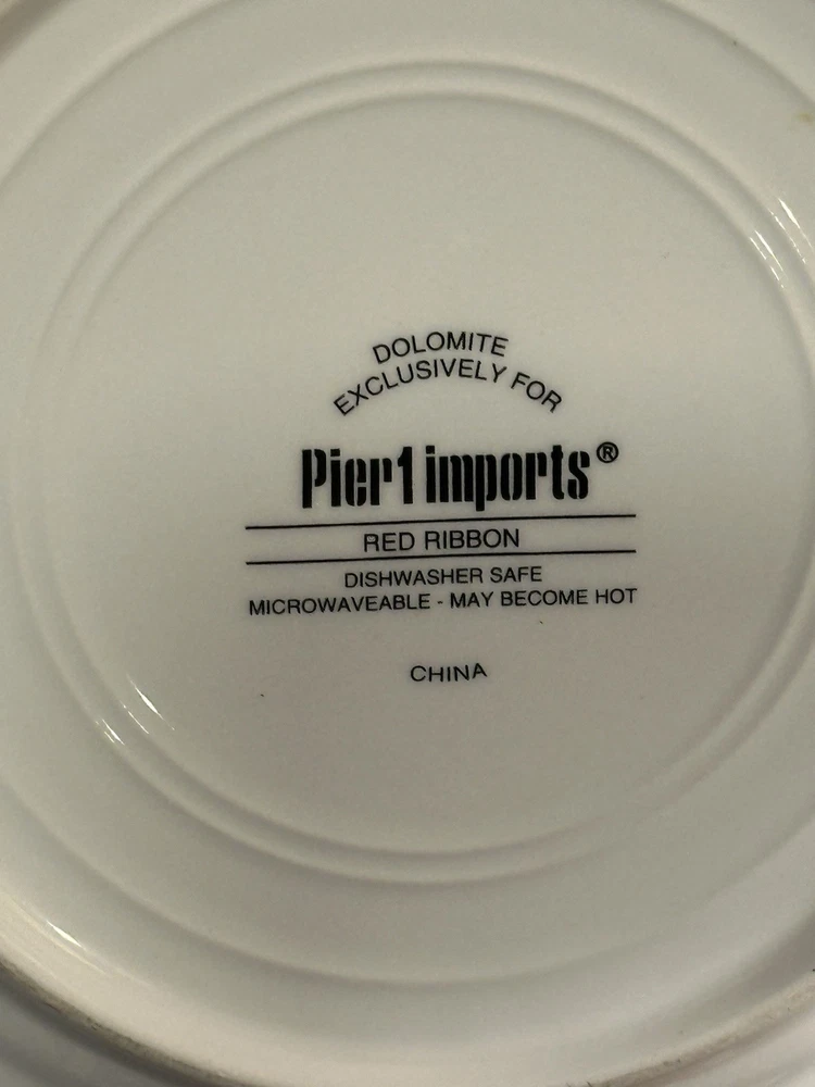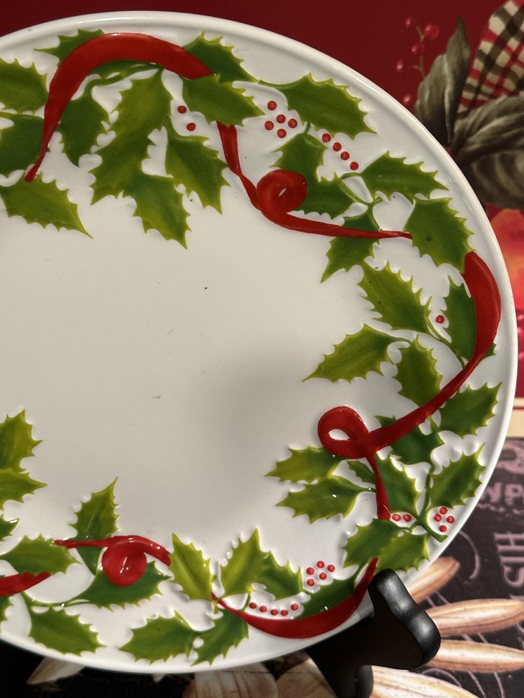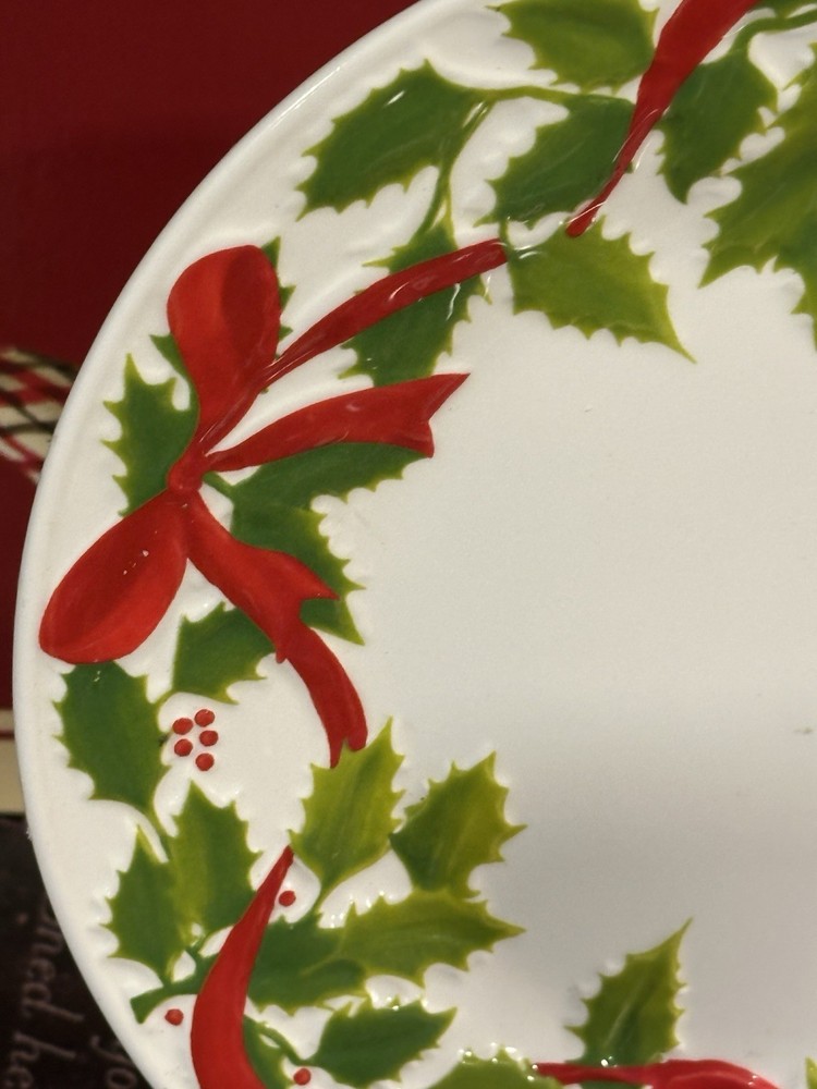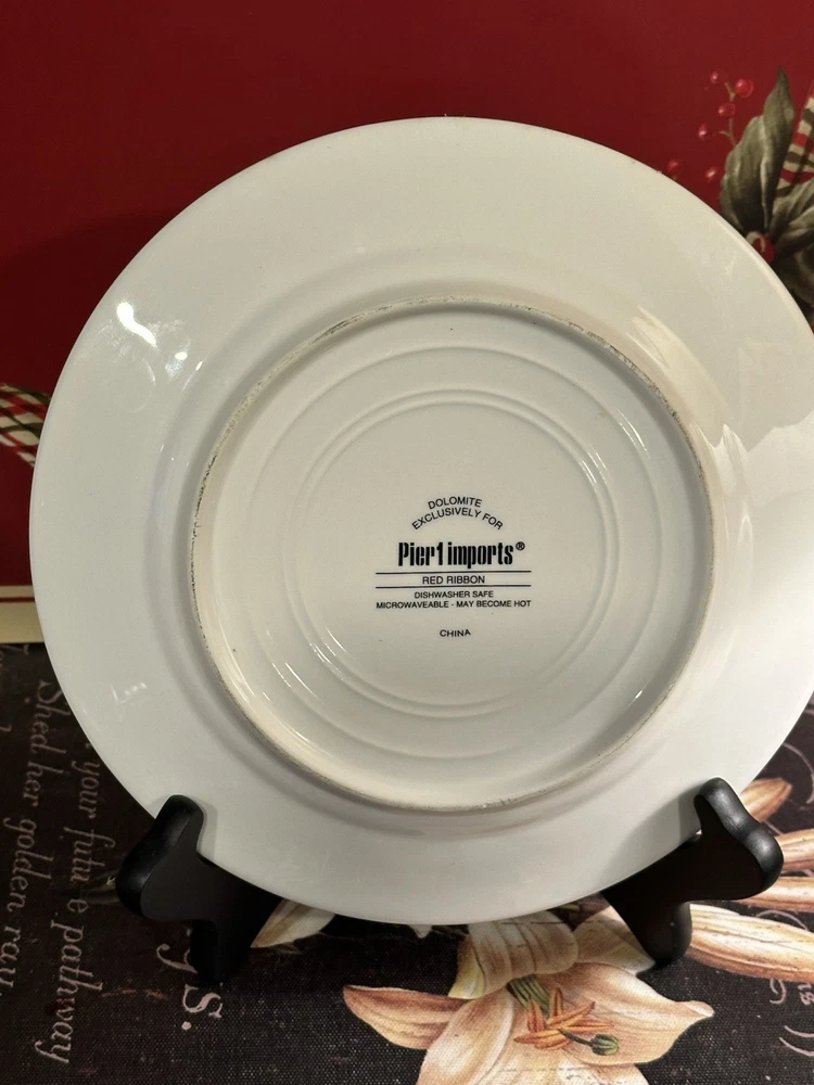 Add a festive touch to your holiday table with this beautiful 8" salad plate from Pier 1 Imports. The plate features a classic red ribbon and holly pattern, perfect for Christmas dinner. The plate is made of durable dolomite and is both dishwasher and microwave safe. This decorative plate is handmade in China and is a great addition to your holiday decor. The plate diameter is 8" and the item height is also 8". The care instructions are simple, as it is machine washable up to 100°F. This original Pier 1 Imports plate is a great choice for your holiday table setting. It’s in excellent condition, no issues Inventory code #8913 FREE SHIPPING to continental continuous USA 🇺🇸 Love ❤️ other items in our store? We will gladly combine shipping We reserve the right to ship via USPS Ground Advantage, FedEx or UPS depending on where you live, weight and size of the package 📦 All sales are final. We don’t do buyers remorse, but we do take care of our clients. Buy with confidence THANK YOU for looking at our beautiful finds