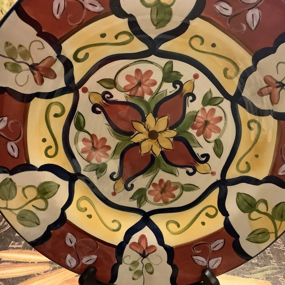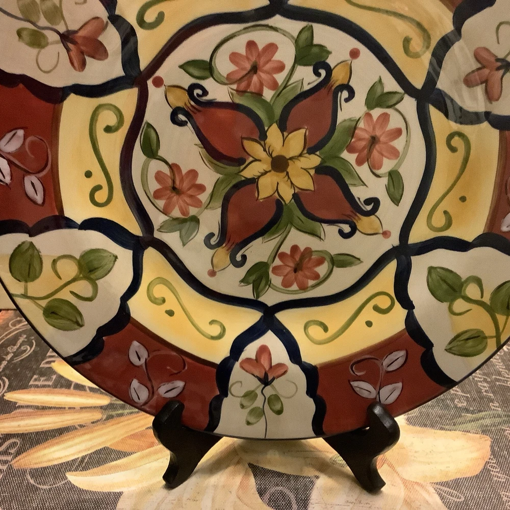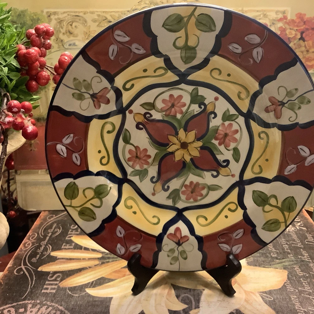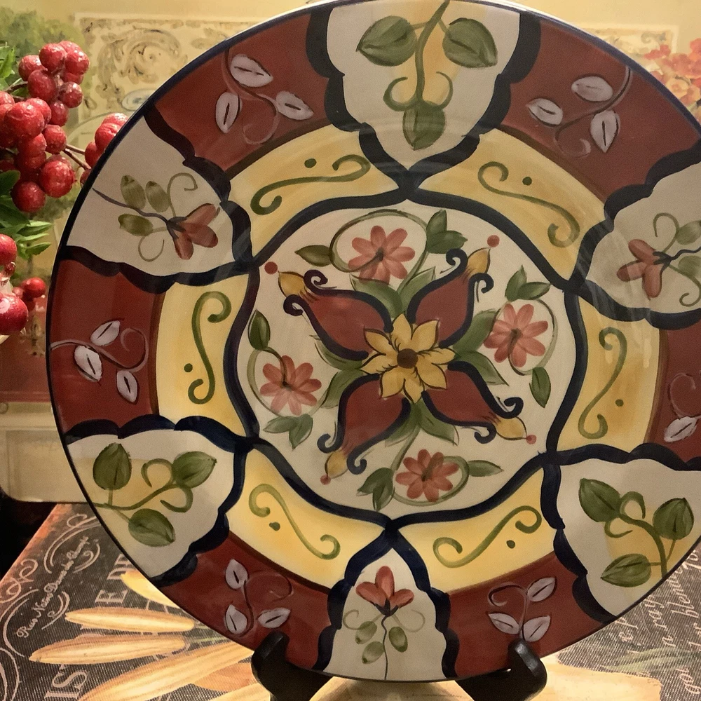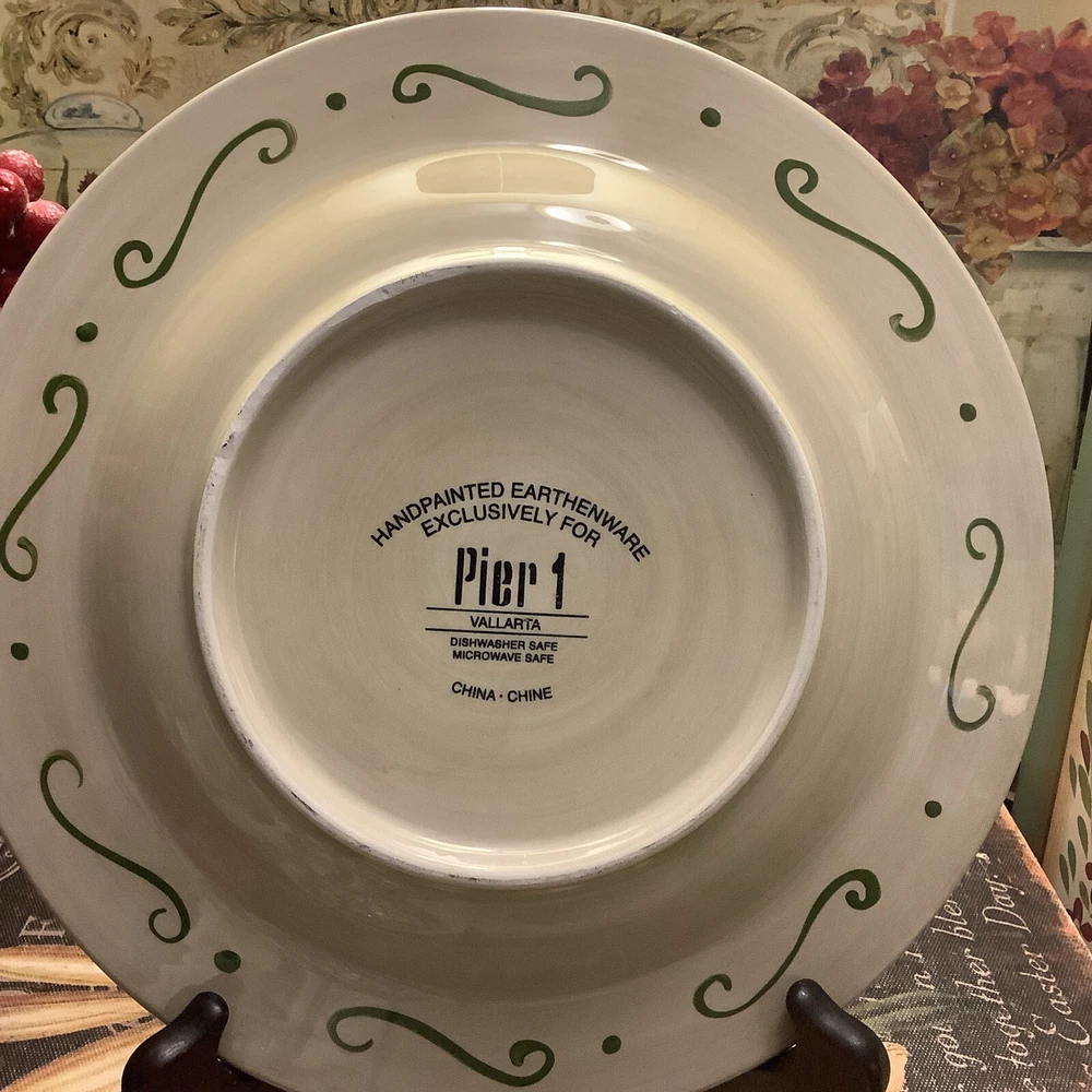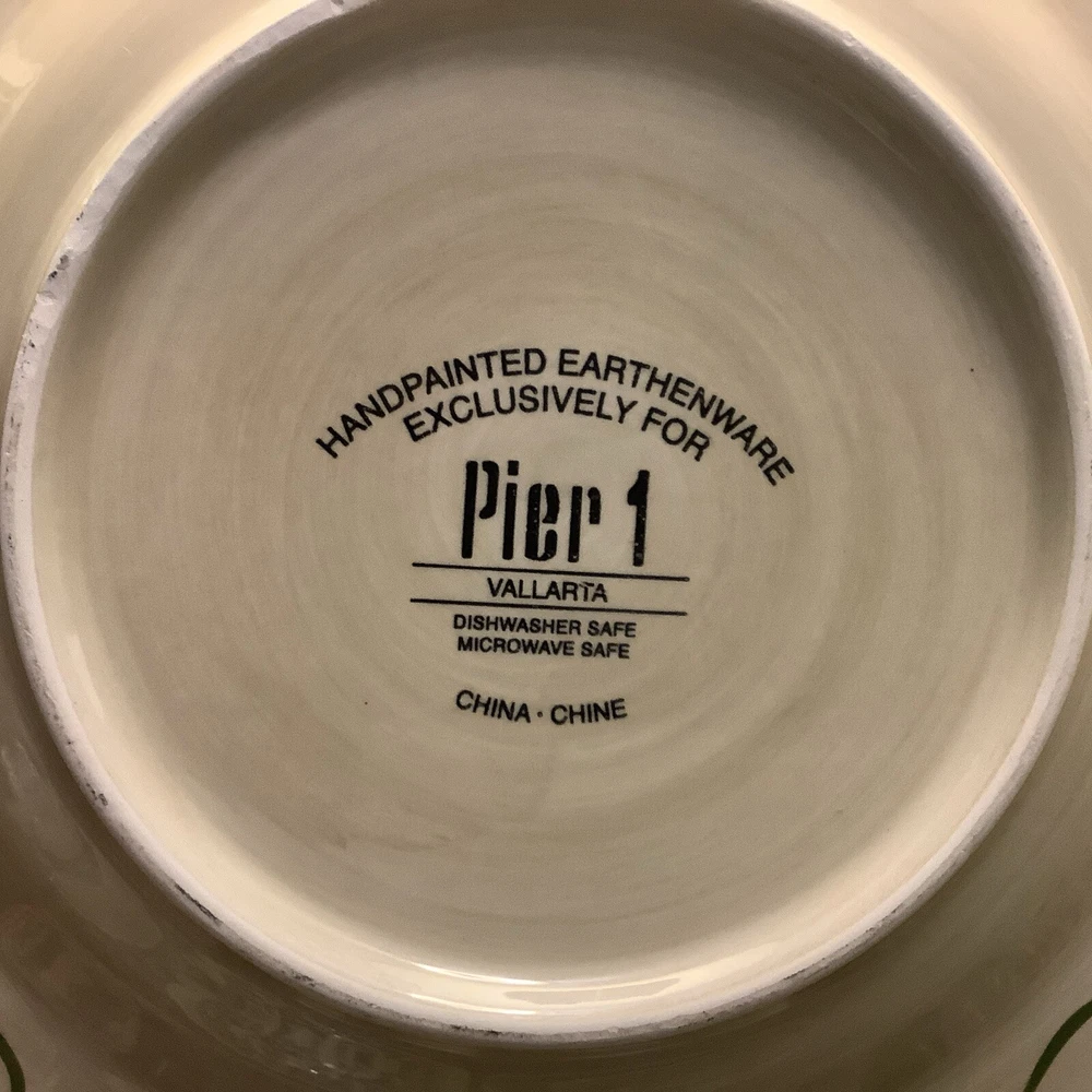 Add a touch of Mexican pottery to your dining table with this beautiful 9" salad plate from Pier 1 Imports. The hand-painted earthenware plate features a glossy finish and a colorful multicolor design, making it perfect for all occasions. The plate is microwave and dishwasher safe, and can be machine washed up to 100Β°F. It's a original piece from the Vallarta product line, manufactured in China using traditional pottery techniques. The plate has a round shape and measures 9" in diameter, 9" in height, and 9" in width. The backstamp is printed and the set includes one salad plate. This vintage piece is perfect for collectors and those who appreciate unique and beautiful diningware. Itβs in excellent, A++ condition, like new! Inventory code #7479 FREE SHIPPING to continental continuous USA πΊπΈ Love β€οΈ other items in our store? We will gladly combine shipping~ We reserve the right to ship via USPS Ground Advantage, USPS Priority Rate, UPS or FedEx depending on where you live, weight and size of the box~ All sales are final. We donβt do buyers remorse, but we do take care of our clients~Buy with confidence ~ THANK YOU for looking at our beautiful finds ~