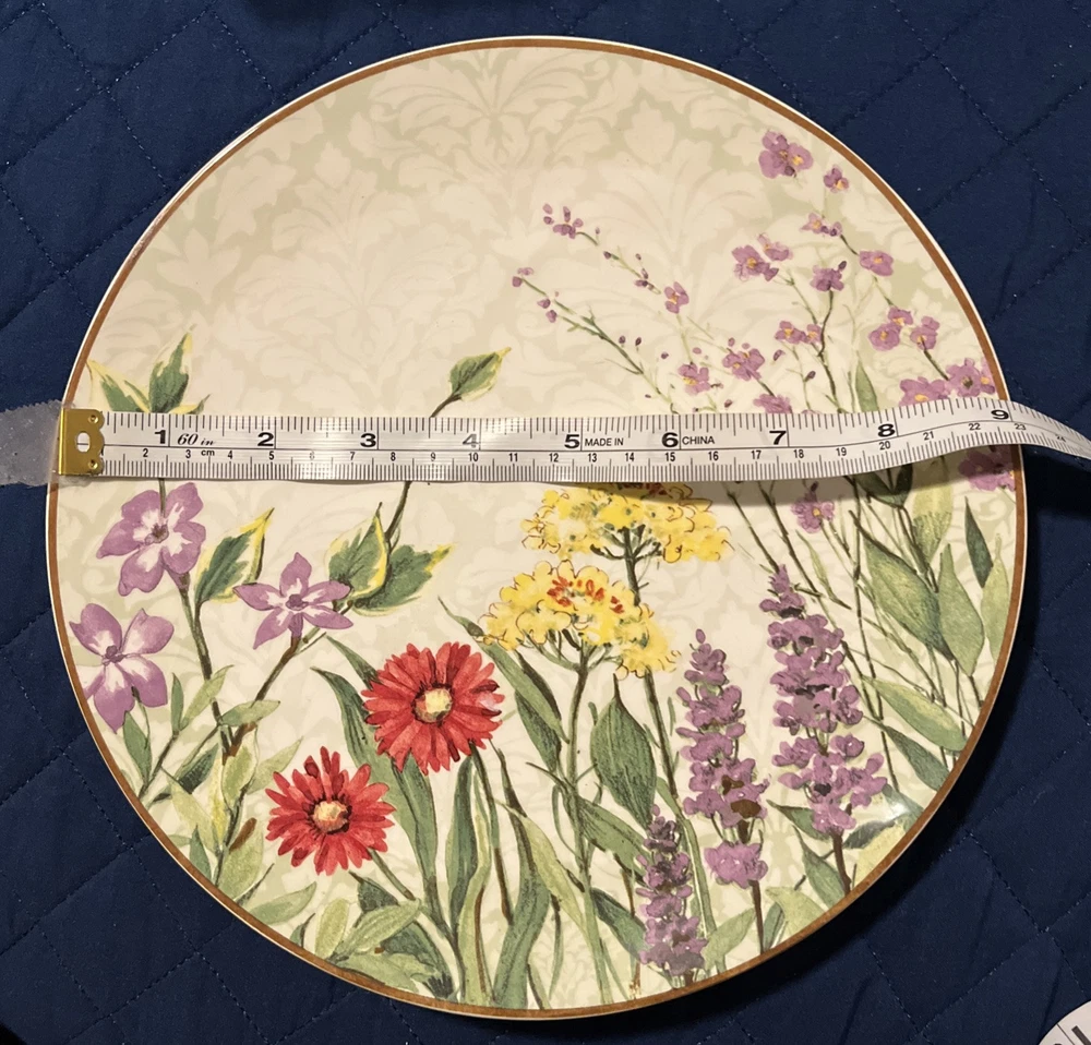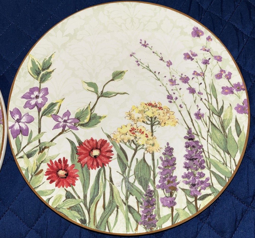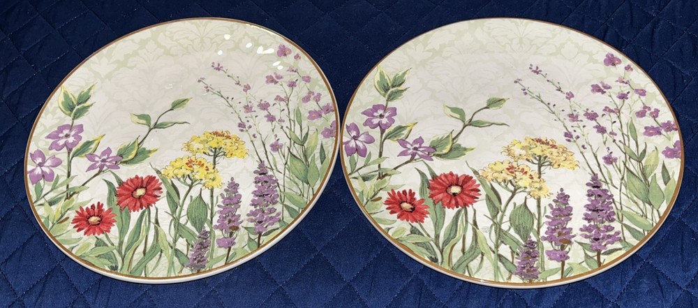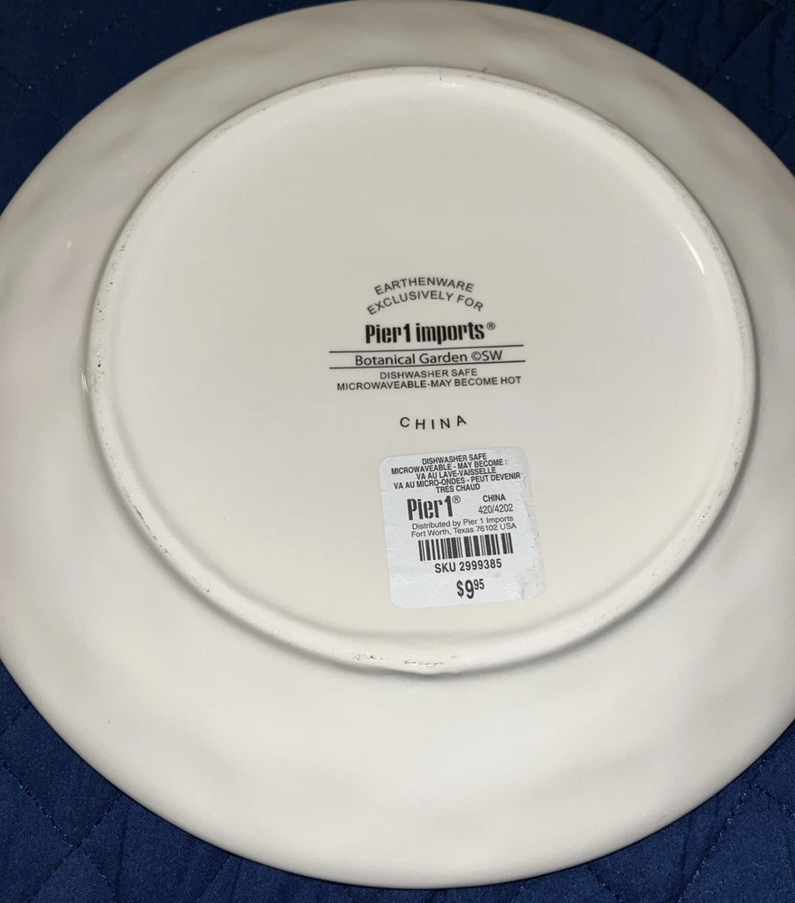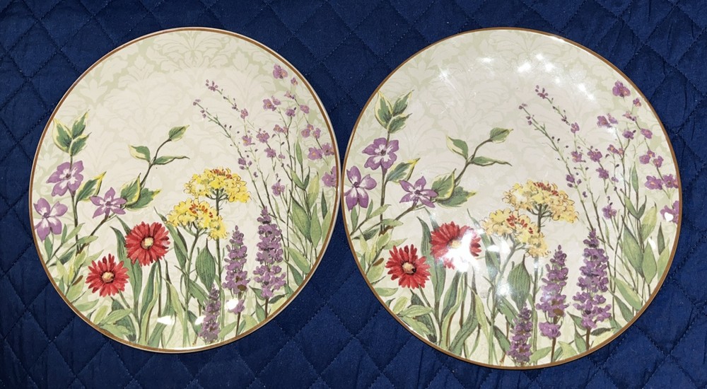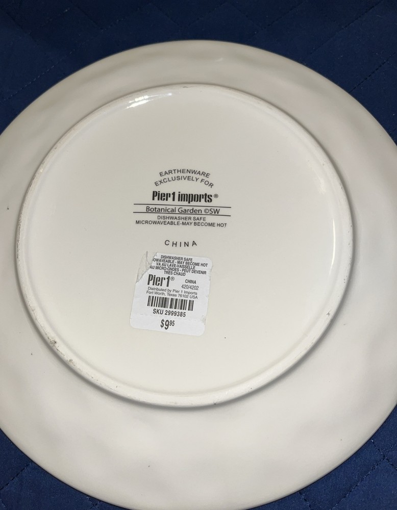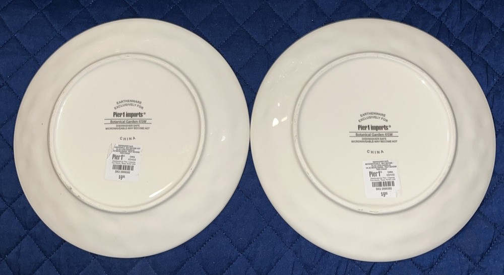 This Pier 1 Imports Botanical Garden plate set includes two 9-inch round plates featuring a floral botanical design. Made of glossy earthenware, they are microwave and dishwasher safe. The plates are contemporary originals from the 21st century, part of the Botanic Garden product line, with a nature and floral theme. Crafted in China using pottery techniques, they bear a printed backstamp and are ideal for all occasions. NWT *****They are new with tags on back BUT.. I do feel a rough spot on each rim. Not easily seen but can feel if running hand along rims. I will try to take the best possible pictures***** pics 7,8,9,10 Please see all pictures and ask any questions Selling as is Thanks for looking!