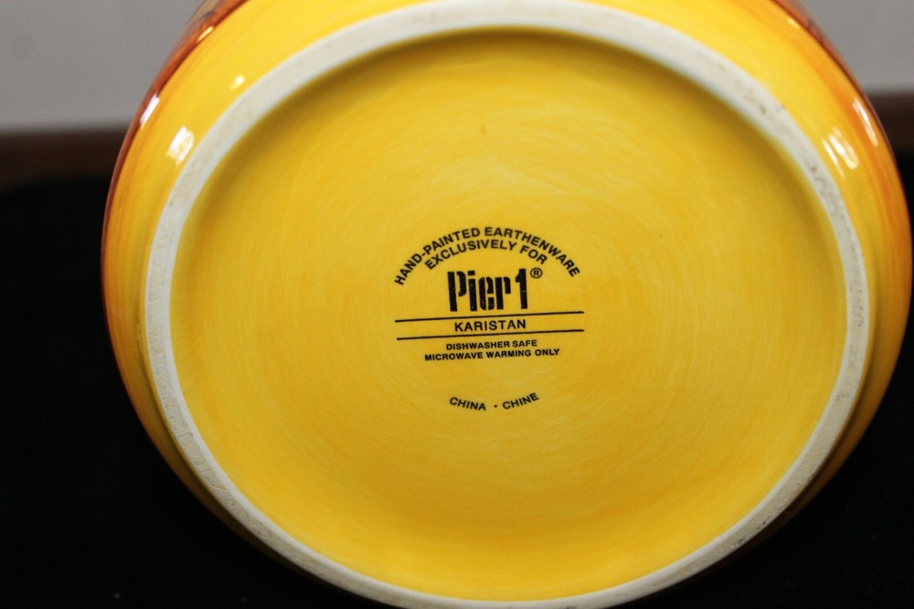 Keep your kitchen organized with this beautiful Pier 1 Imports utensil holder. The Karistan handpainted design in yellow is sure to brighten up any countertop. Measuring 7 inches in height, this holder is perfect for storing all your cooking utensils. Made with dishwasher safe materials, this utensil holder is both functional and stylish. The Pier 1 Imports brand is known for high-quality home goods, and this holder is no exception. With a length of 6.5 inches and a width of 7 inches, it is the perfect size for any kitchen. Keep your cooking tools within arm's reach with this lovely utensil holder. No chips or cracks.