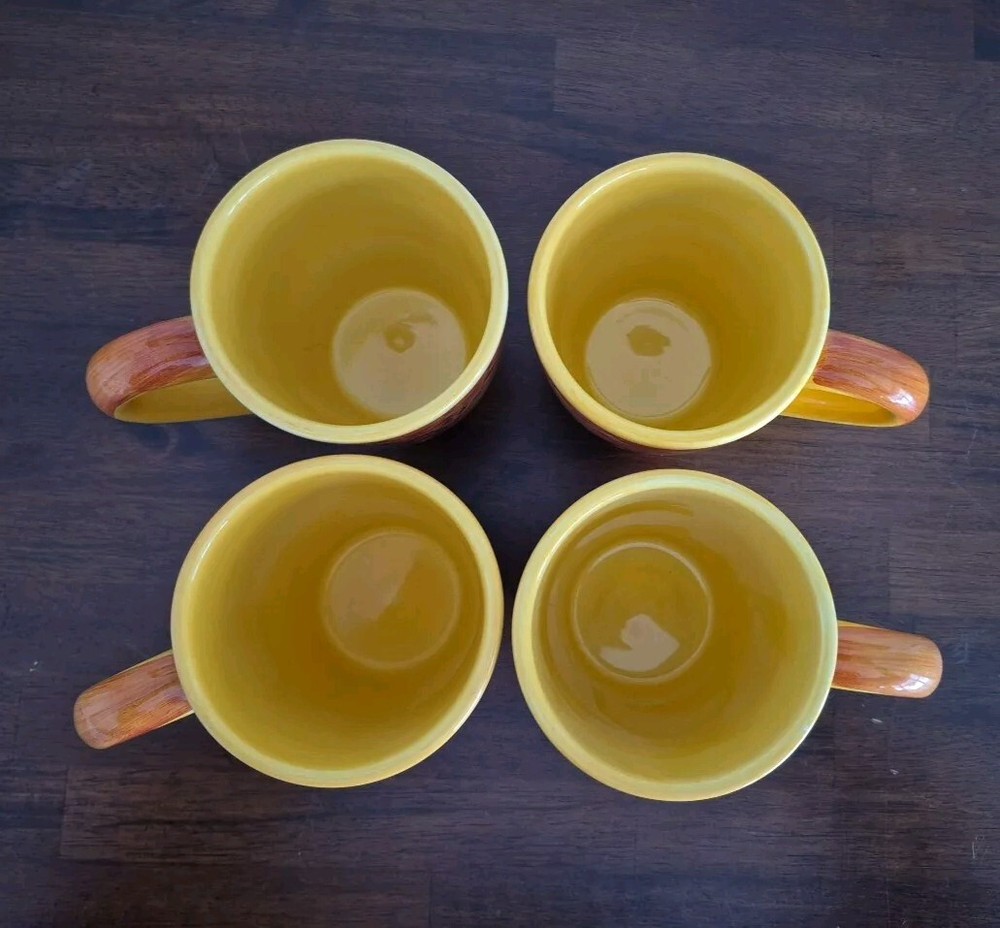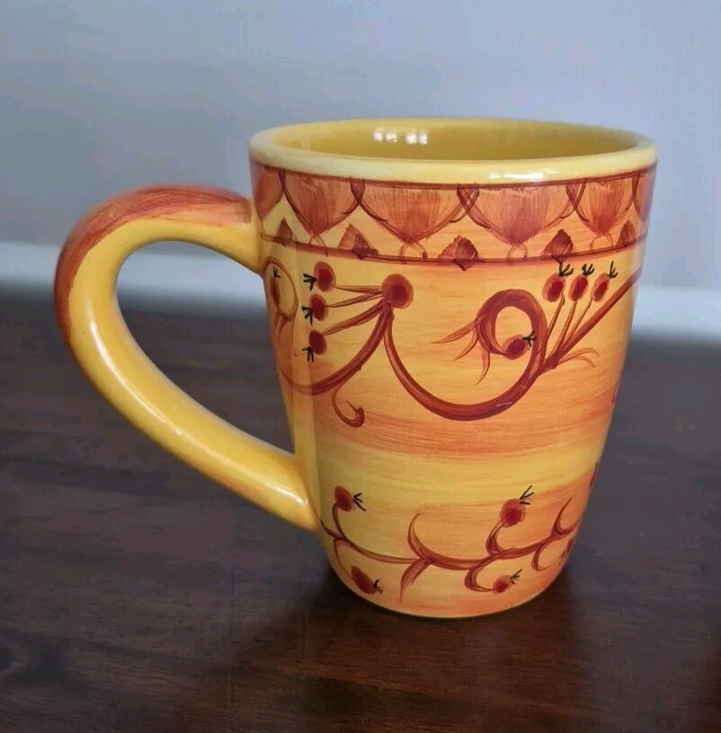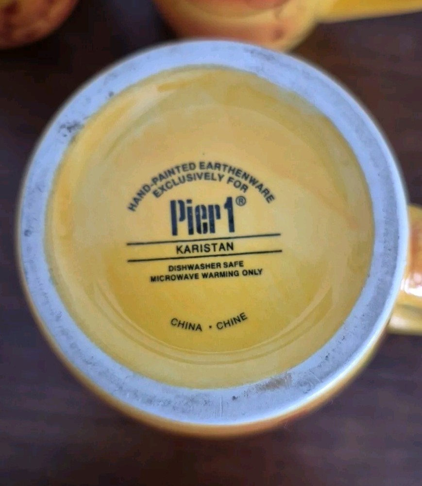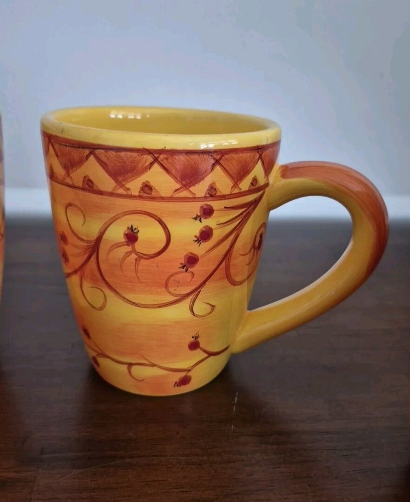 Add some art deco charm to your morning coffee or tea ritual with these beautiful Pier 1 Karistan mugs. The hand-painted gold and yellow designs on the earthenware material add a touch of elegance to any occasion. Each mug has a capacity of 16oz and stands at 4-1/2" tall. The glossy finish and printed backstamp make these mugs perfect for collectors and coffee lovers alike. Whether you're enjoying a quiet morning or entertaining guests, these Karistan mugs are sure to impress. Please look at the pictures, these are the exact mugs you will receive. All in excellent condition. NO chips. NO cracks.