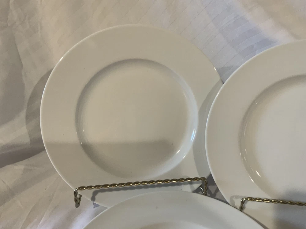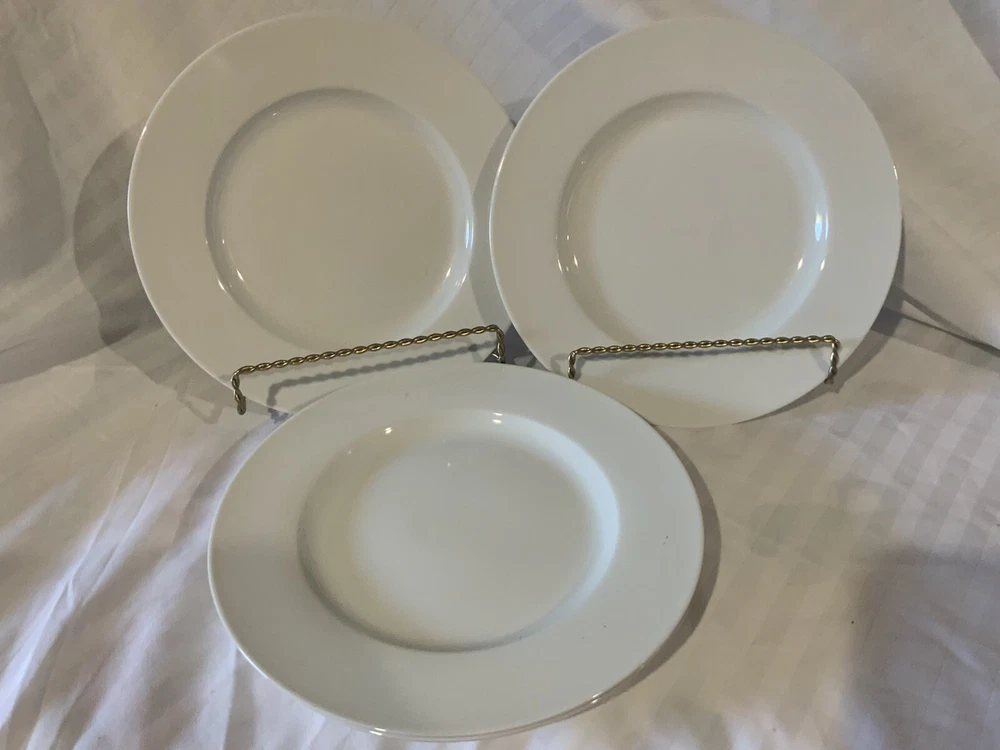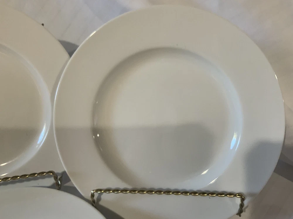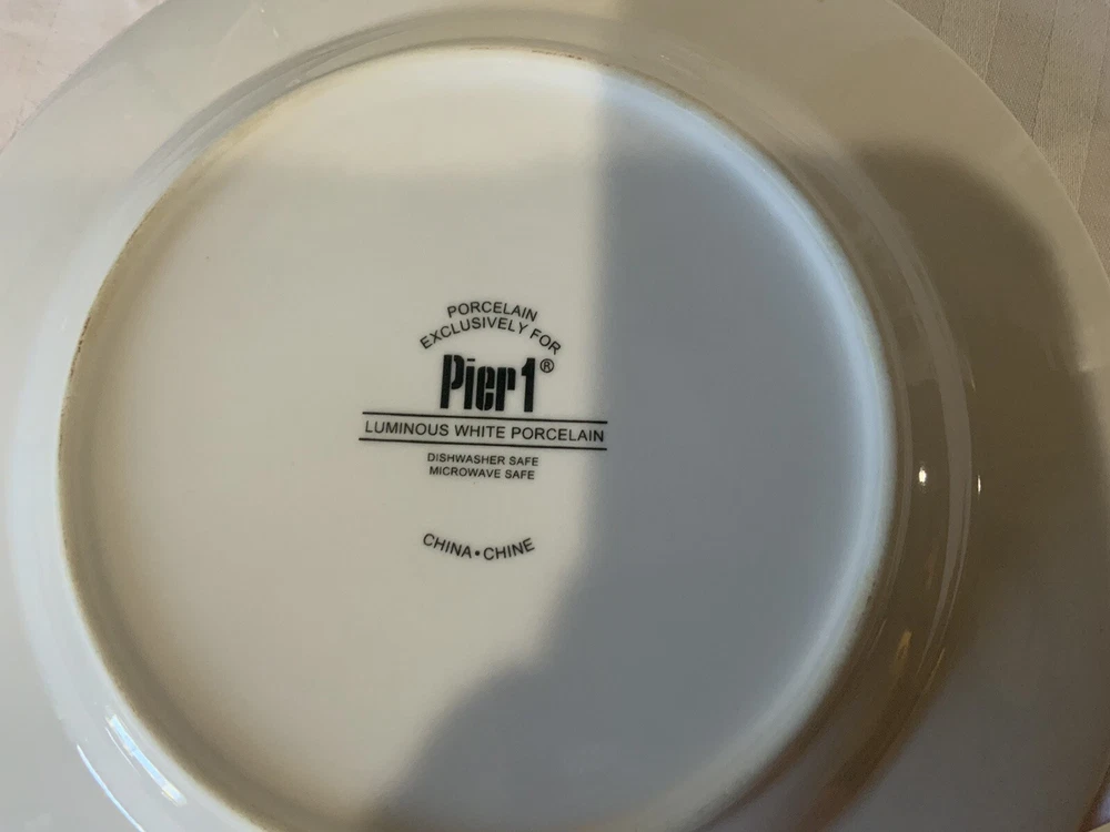 Pier 1 LUMINOUS WHITE 8-5/8" Salad Plates (4) Superior Condition. This is a set of four 8-5/8" diameter salad / dessert plates by Pier 1 in the Luminous pattern in white. These crisp white plates have a sleek modern appearance with a wide rim. The plates are in superior condition appearing to have seldom been used. There are no chips, no cracks, no stains, no crazing, no haze, and no gray utensil marks. See pictures. If you are a fan of all-white dinnerware with a sleek modern appearance, then you will want this set of plates. These Pier One dinner plates have a 1-5/8 inch wide rim. This style is superb for mixing and matching with other colors and patterns! The plate dimensions are 7/8" H, 8-5/8" diameter, and weigh 15.9 ounces each. These items will be well packed in a heavy duty box to help ensure safe delivery.