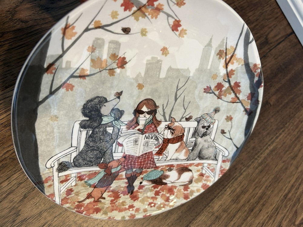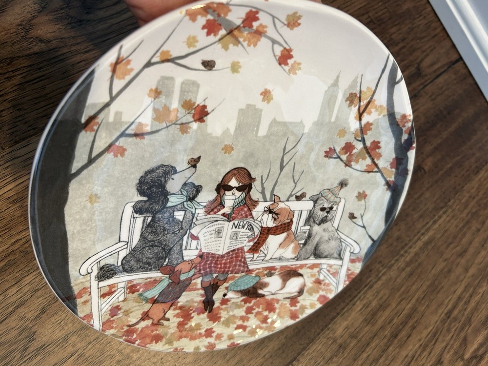 New with Tag 9" Lazy Sunday Pups Plate from Pier 1 New York Central Park Dog Park in the Fall