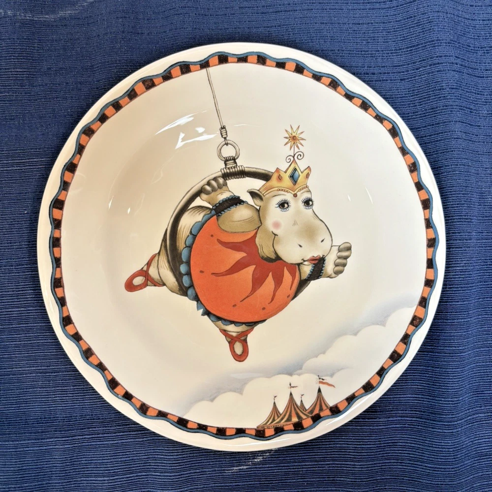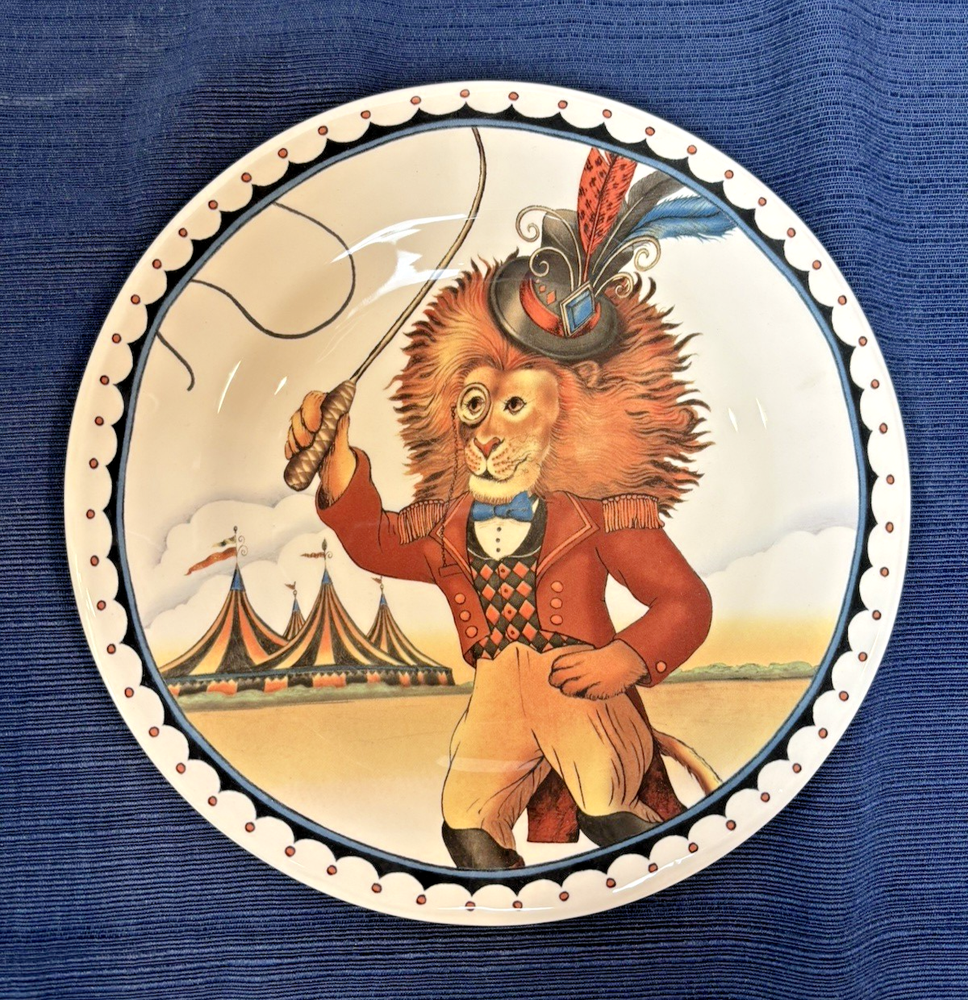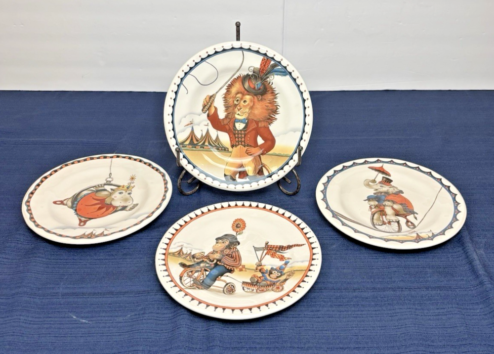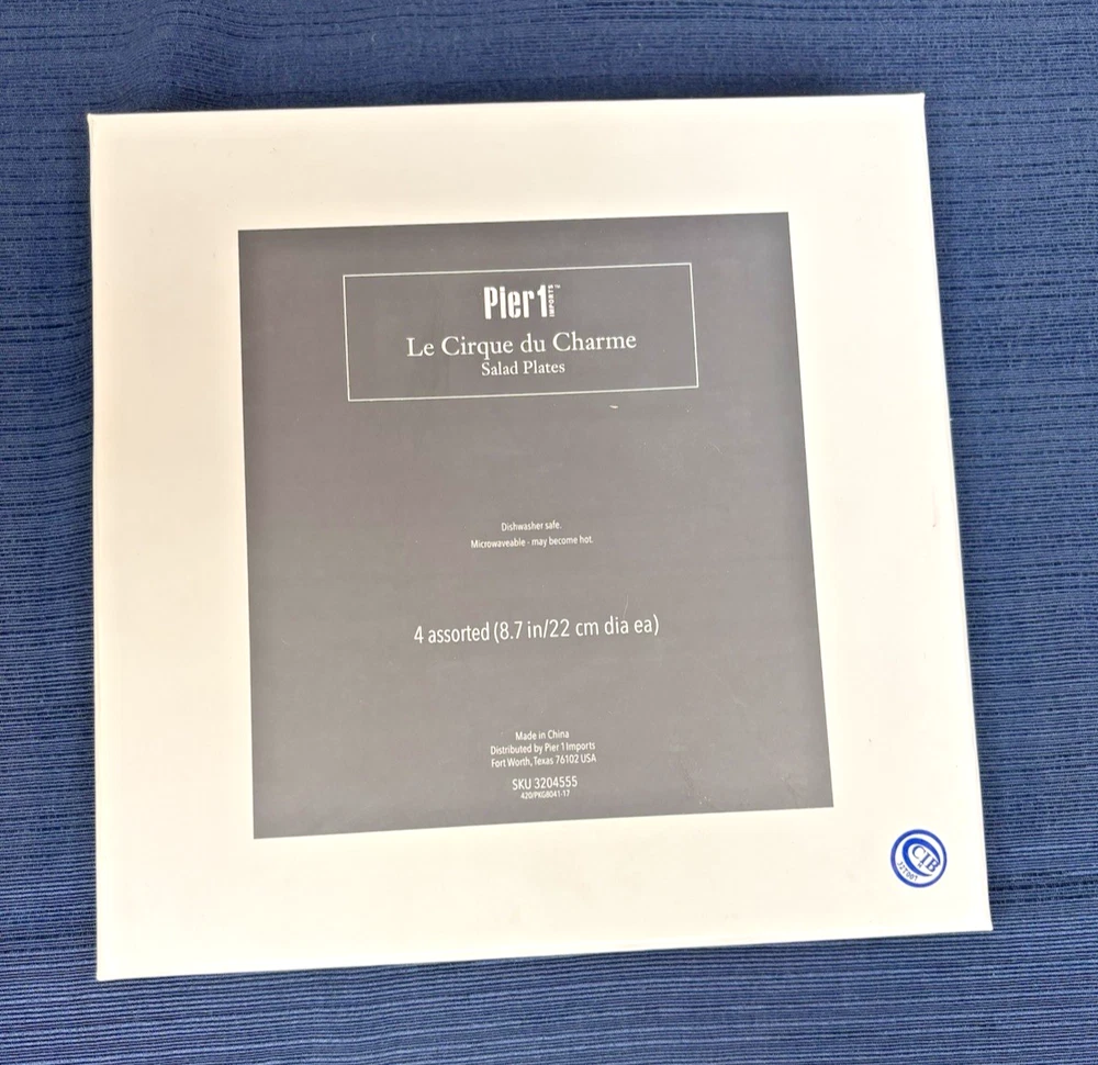 The Pier 1 Le Cirque 8.7" Salad Plates are a set of 4 featuring a circus animals pattern in multicolor. Made of ironstone with a glossy finish, these round plates are dishwasher safe and perfect for all occasions. The limited edition plates from the Le Cirque du Charme collection are decorative and add a touch of charm to any table setting. Made in China using pottery production technique, these original salad plates by Pier 1 are a unique addition to your pottery and glass collection.