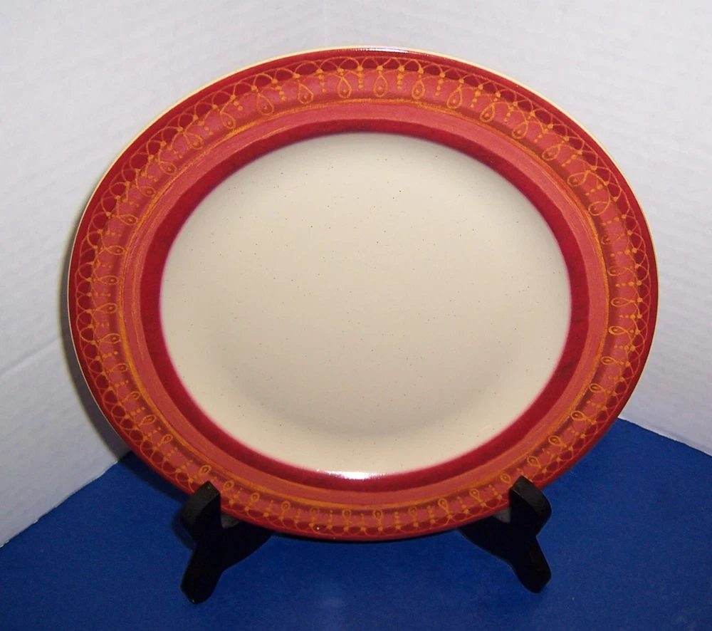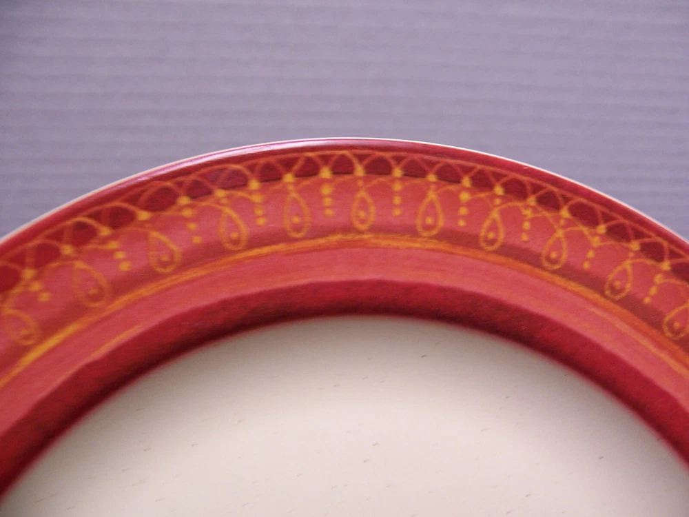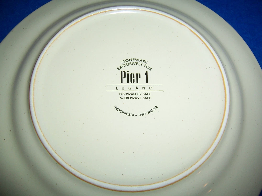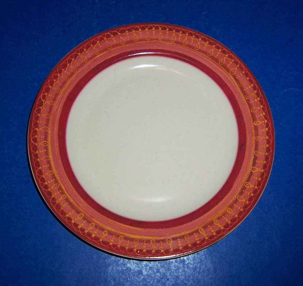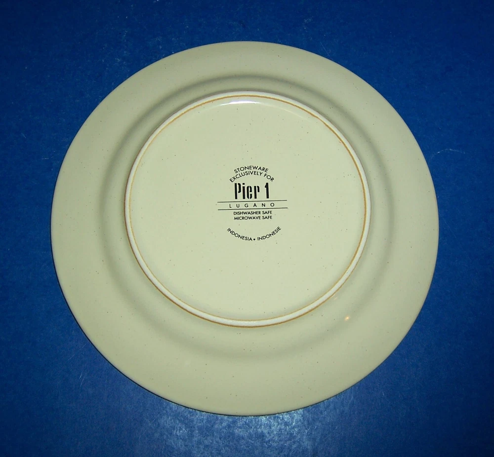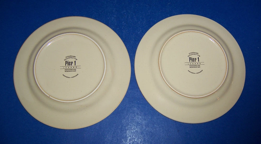 This pre-owned Set of 2 Salad Plates by Pier 1 in the retired Lugano pattern is in exceptionally nice condition. The plates have a few very light surface marks from display or very gentle use. Otherwise, the plates are in beautiful condition with No nicks, chips, cracks, crazing, or repairs. The salad plates are approximately 8” in diameter and feature an orange rim with geometric designs. The stoneware plates were made in Indonesia exclusively for Pier 1 and are safe for use in the dishwasher & microwave. A beautiful set of salad plates – would make a GREAT addition to your Lugano dinnerware. [23-0395] Thank you for looking!!