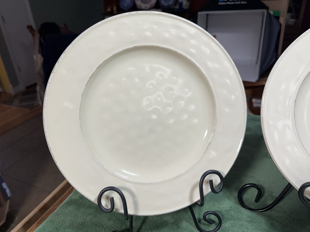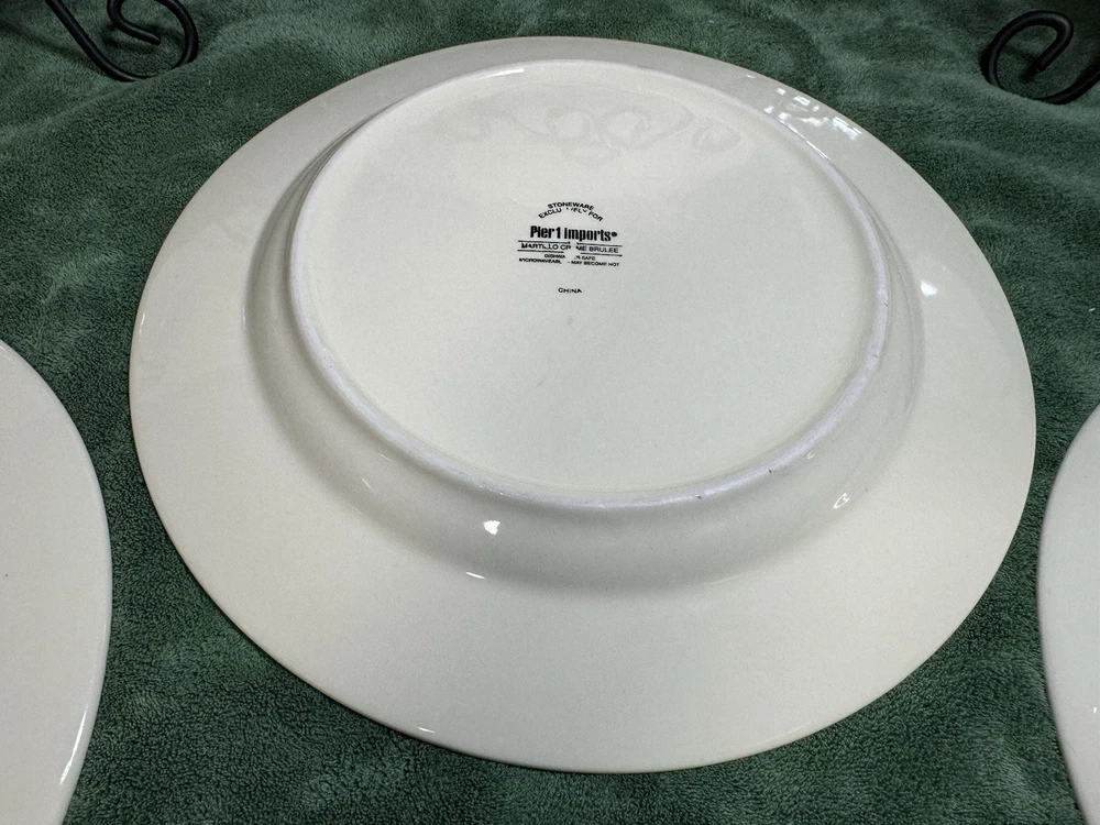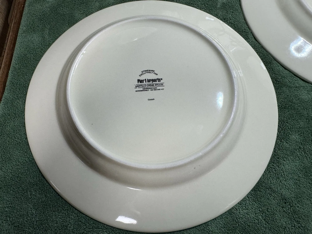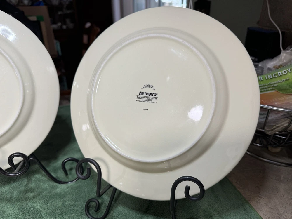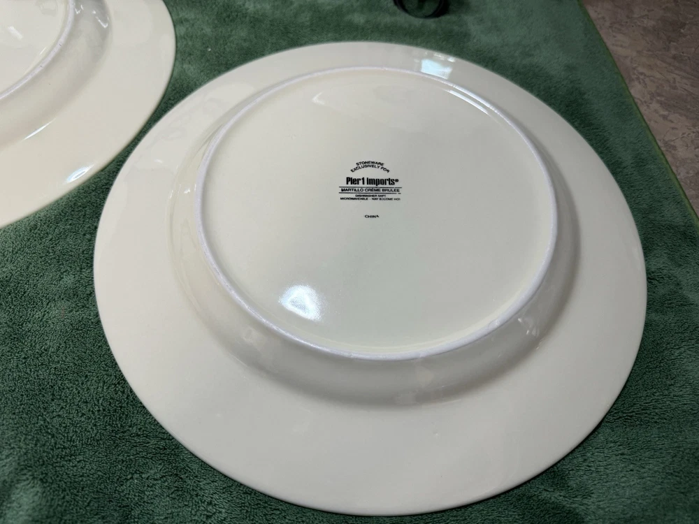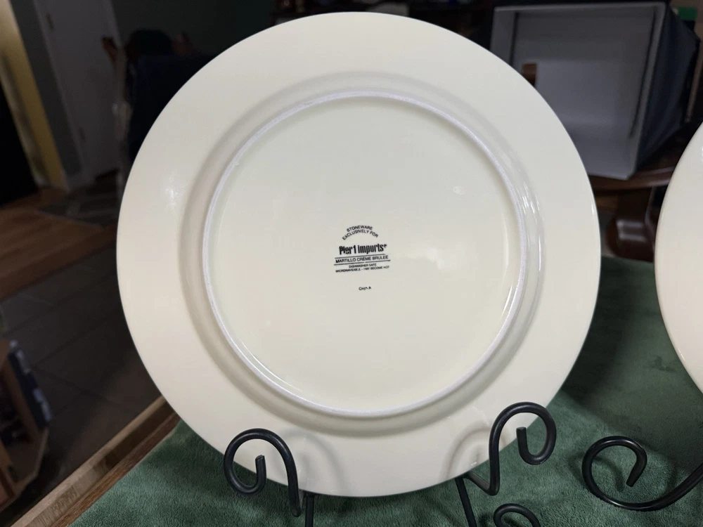 Crafted for the modern table, this set of six Pier 1 Martillo Stoneware dinner plates brings a touch of sophistication to any dining experience. Each 10-3/4” plate showcases a lustrous creme brûlée hue, adding a rich, velvety texture that's sure to complement your favorite entrees. These mint condition preowned plates are without any chips, nicks or scratches. LOVELY!