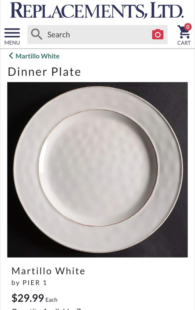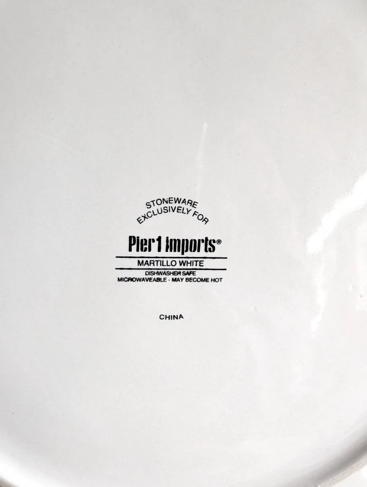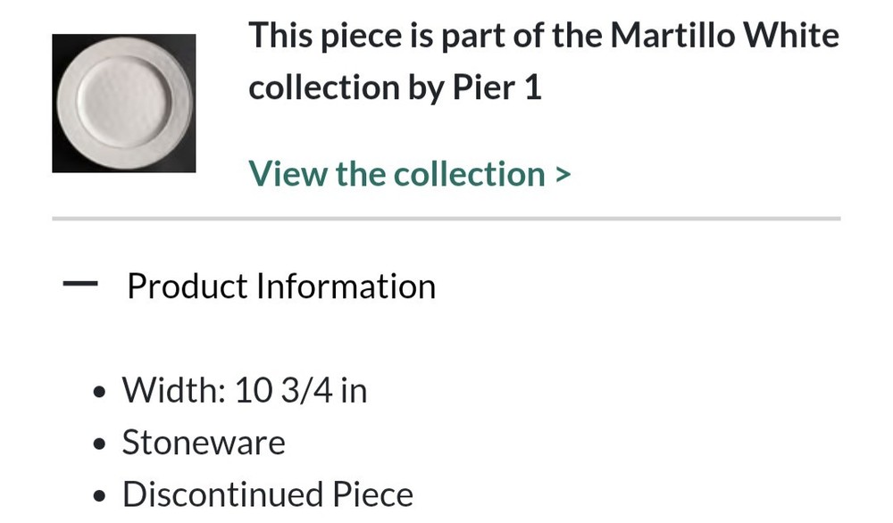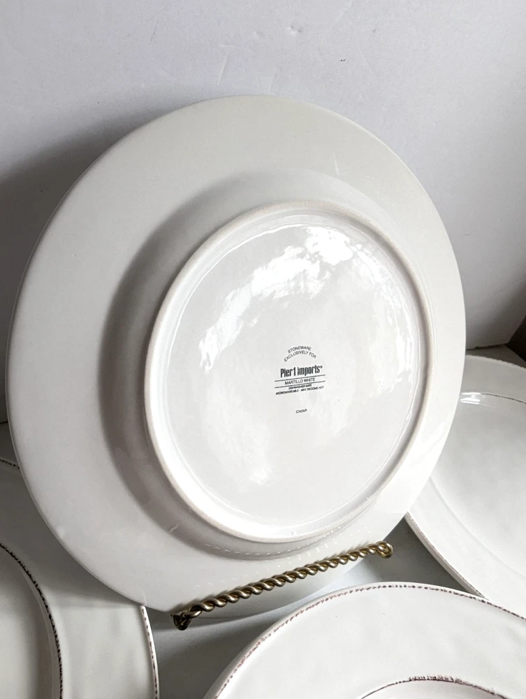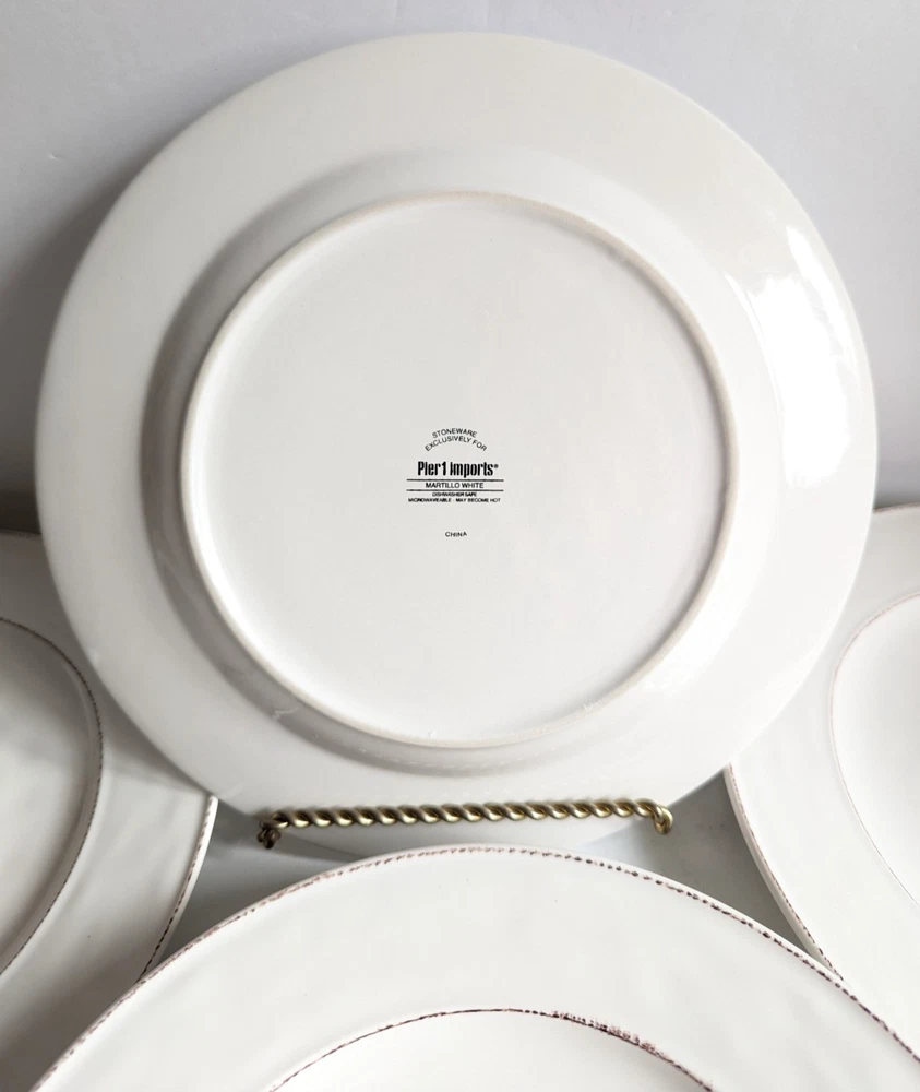 Pier 1 Martillo White Set Of 6 Dinner Plates 10.75" Discontinued Favorite LOT 6 Pier 1 Martillo White Stoneware Dinner Plate 10.75" Discontinued Favorite Retail $29.99 Each This dinner plate height is 1" and Length is 10 3/4" Great pre-owned condition.