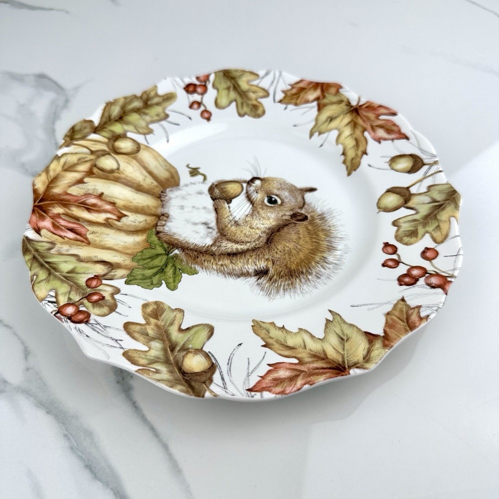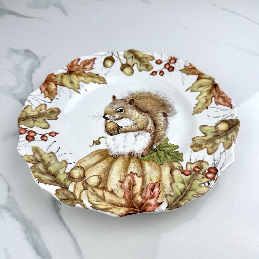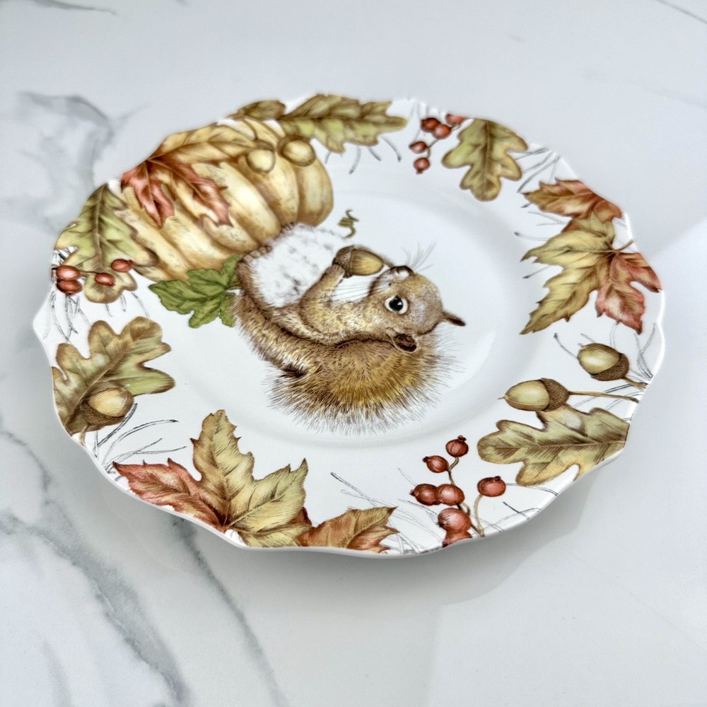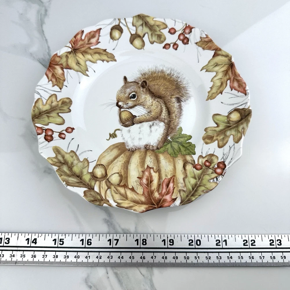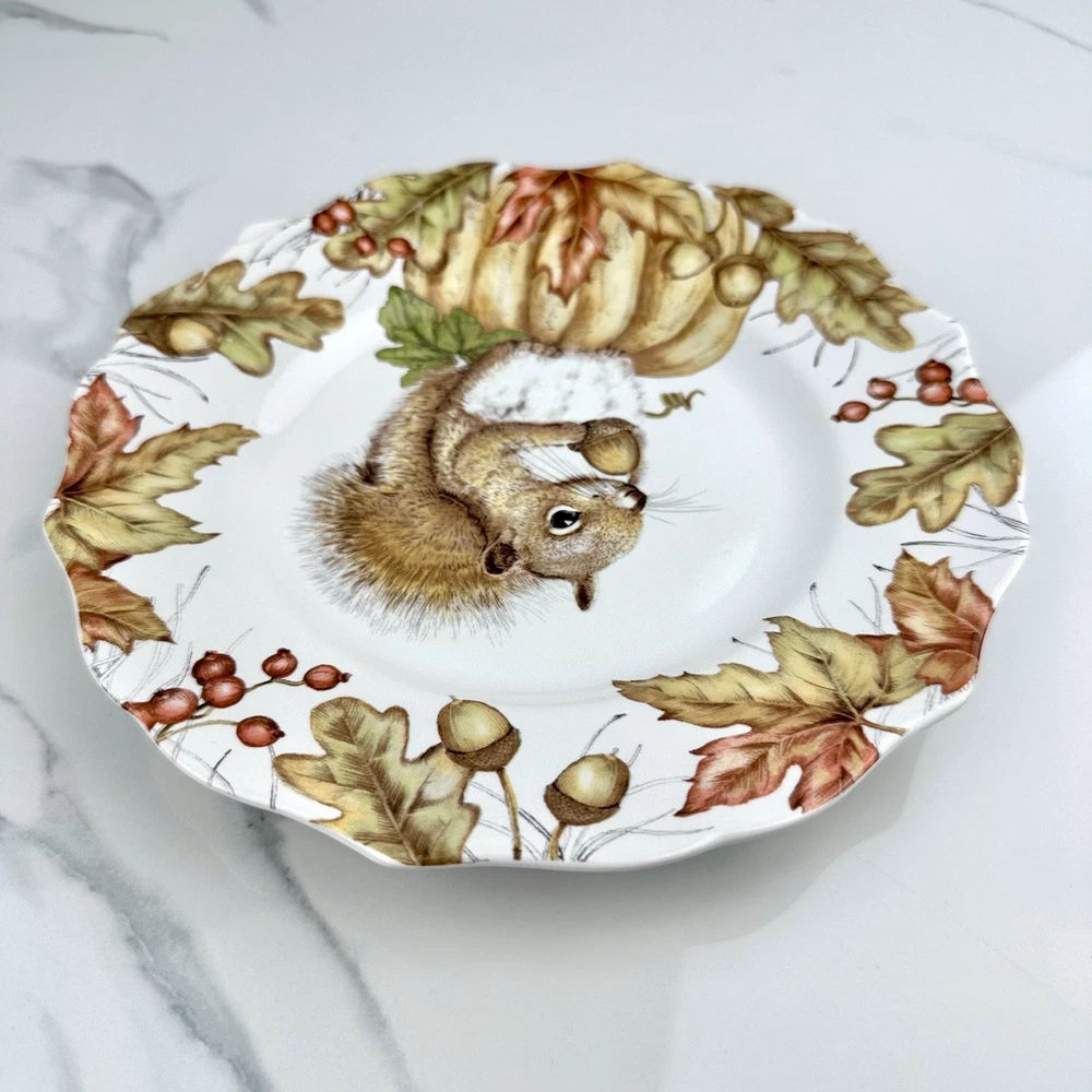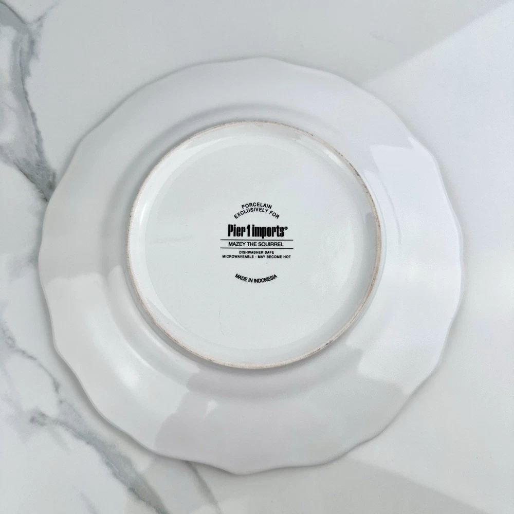 Pier 1 Mazey the Squirrel Salad Plate – Porcelain Autumn Fall Woodland – Rare & Retired Celebrate the charm of fall with this delightful Mazey the Squirrel salad plate by Pier 1 Imports. Made of durable porcelain, this beautifully detailed plate features Mazey the Squirrel surrounded by autumn leaves and acorns in a cozy woodland theme. This piece is part of the retired and hard-to-find Mazey the Squirrel collection, making it a lovely addition to any fall table setting or a perfect gift for collectors. Ideal for fall entertaining, Thanksgiving, or display as part of a woodland-inspired collection. BRAND: Pier 1 Imports COLLECTION: Mazey the Squirrel ITEM: Salad Plate (single) MATERIAL: Porcelain SIZE: Approx. 8.5” diameter CONDITION: Excellent pre-owned condition with minimal signs of wear; no chips, cracks. Great condition. * This item is sold as described. No returns accepted. **Please review photos as they are part of the description** SHIPPING INFORMATION: Shipping: Flat-rate $16.99. We strive to provide fast and secure shipping. We offer $16.99 Flat Rate USPS Priority Mail Domestic Ground Shipping. International shipping rates will be more and shipping rates may vary. Ships same or next business day. Choose from a variety of shipping options to suit your needs, and enjoy discounted rates when purchasing multiple items. We carefully package all items to ensure they arrive in perfect condition. For your peace of mind, tracking is included with every order! Returns: No returns – Please review all photos and details before purchasing Authenticity Guarantee: All items are 100% authentic, sourced from trusted suppliers Colors may vary based on individual computer monitor or smartphone settings. Check Out More: Browse our shop for more finds!