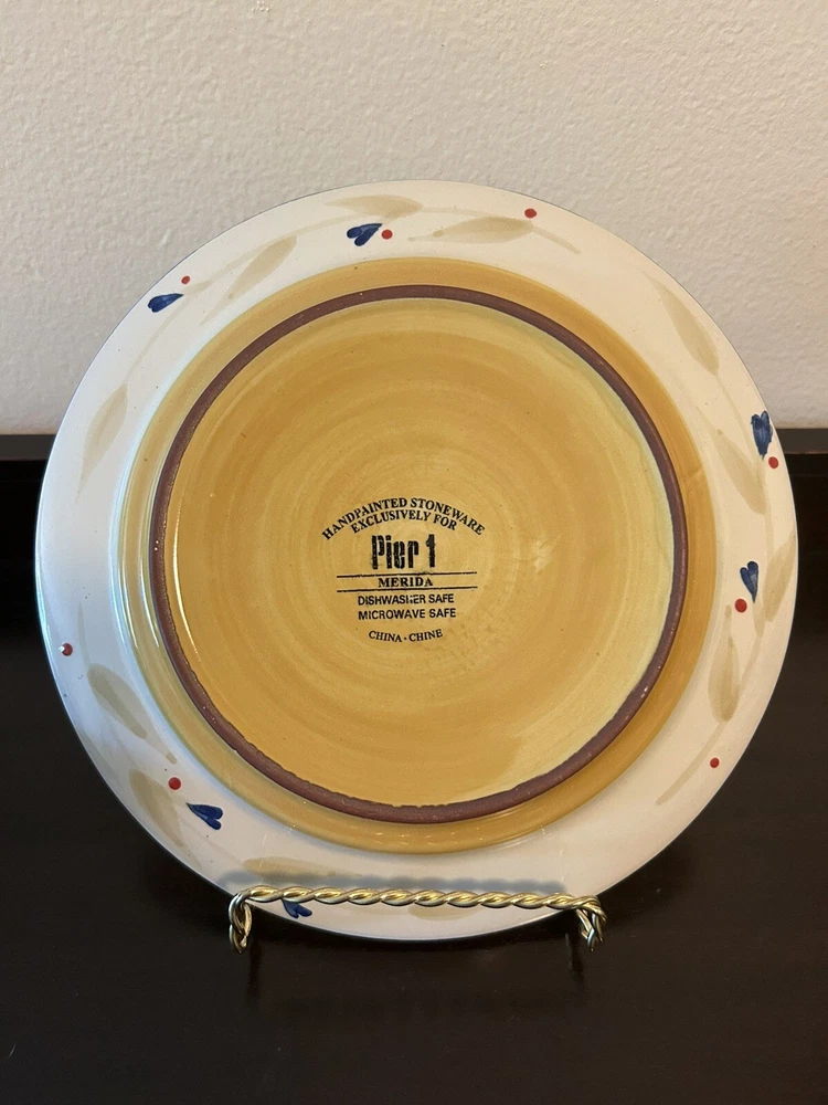 Pier 1 “Merida” pattern hand painted salad plates. Rim/edge of plate is painted blue. In addition to the main yellow color, the floral trim is accented with blue, red, beige, and green. All plates are in great condition with no chips or cracks. This pattern has been discontinued by Pier 1.