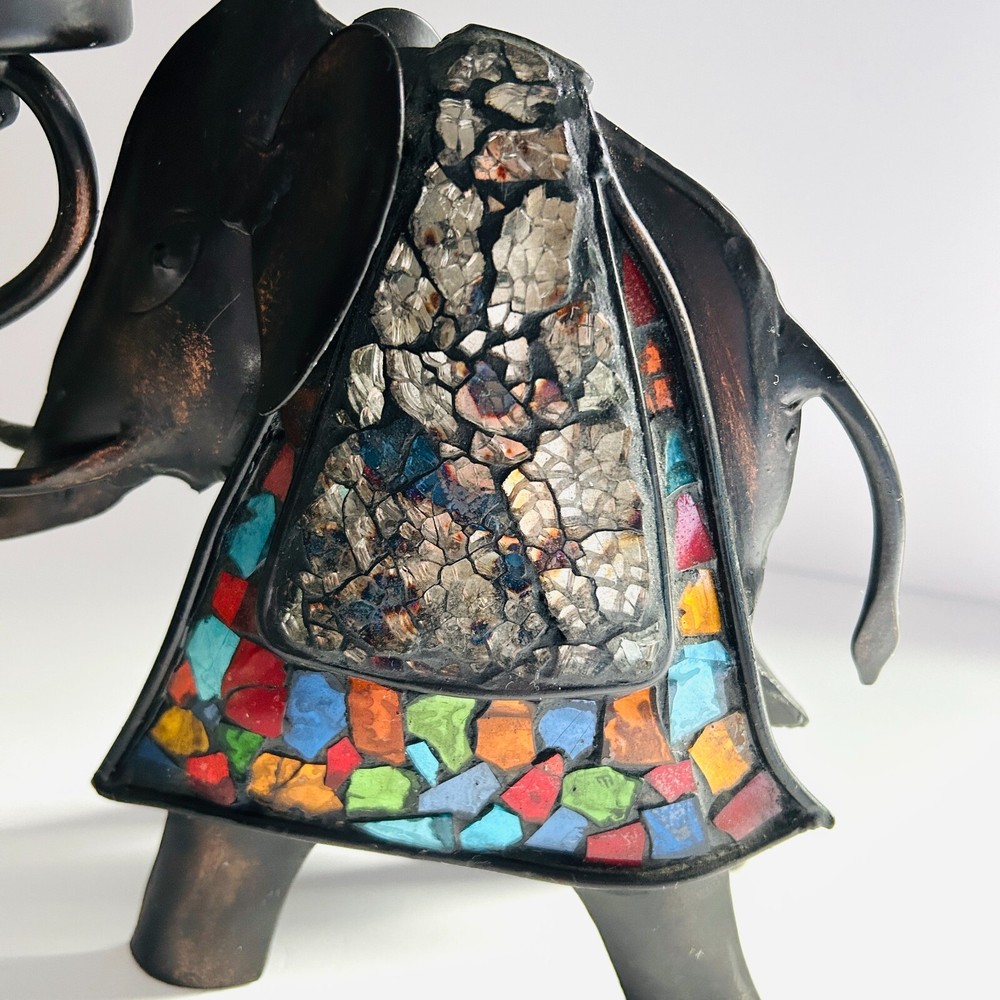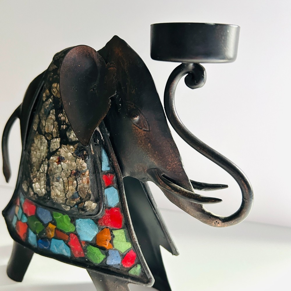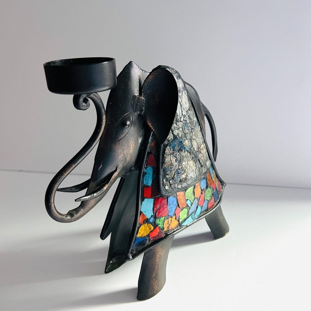 PIER 1 IMPORTS METAL ELEPHANT TEA LIGHT HOLDER Elephant measures about 8 X 8". Pretty mosaic style design. Holds a tea light candle. Very nice pre-owned condition. Please see pictures for details. Feel free to contact me with any questions. If you are purchasing multiple items, please request a custom listing so that I can combine shipping. Thank you for shopping!