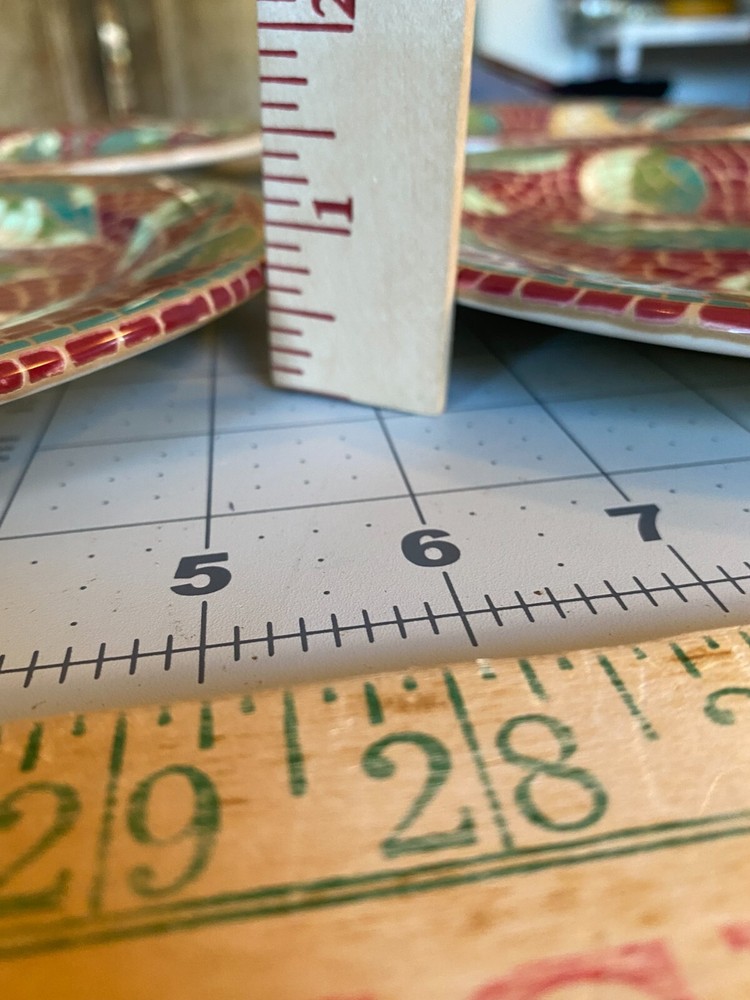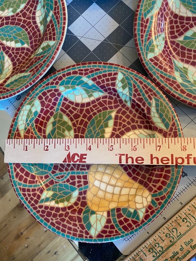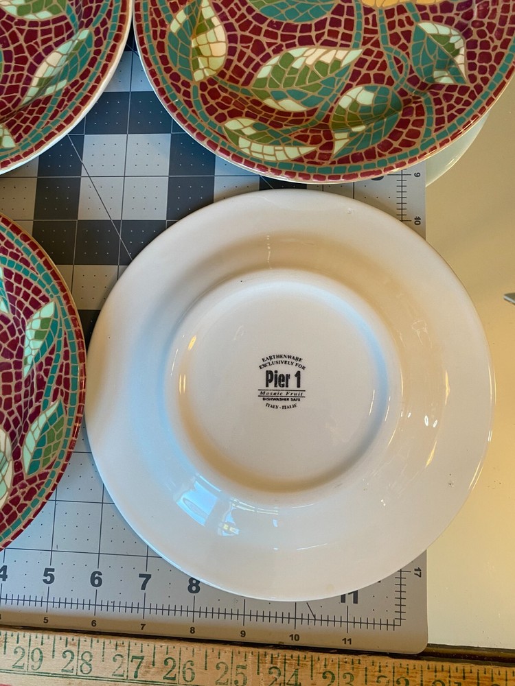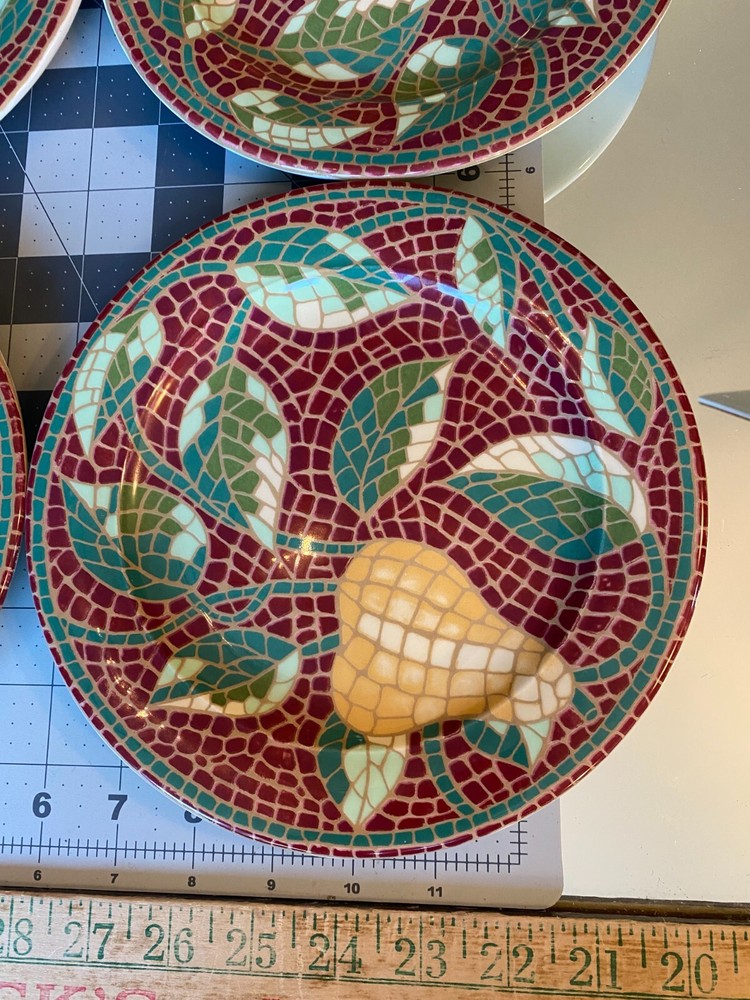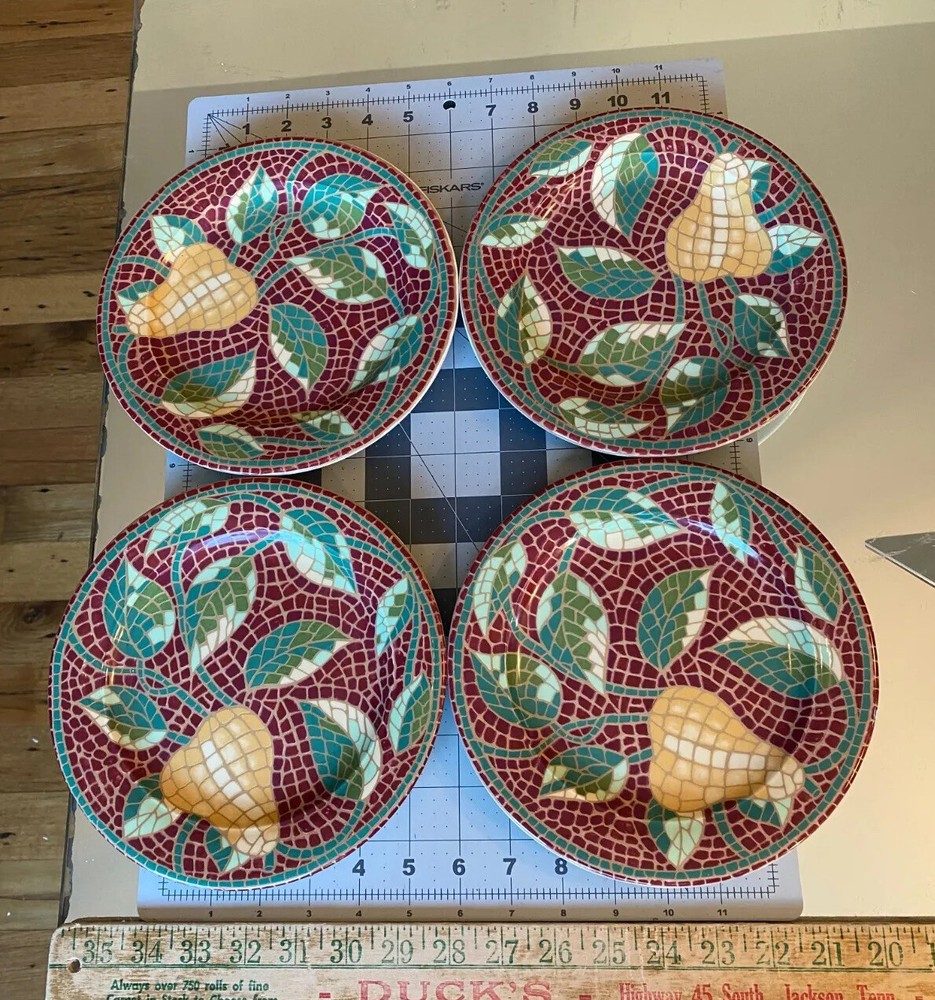 Pier 1 Mosaic Fruit Pear Earthenware Salad Plates Set of4-8.25" or 8 1/4" Italy Pre-owned and in Great Condition-No Chips or Cracks-Please view all pictures and contact me if you have questions. Visit my Store for other Great Finds and when you find multiple items you desire to purchase, I will combine your shipments (if possible) to save you money. Thank you for Your Business,