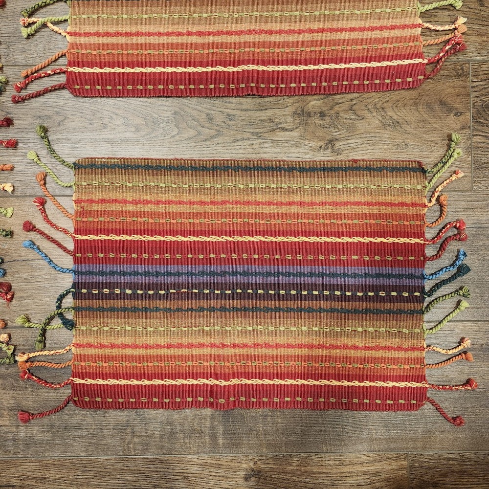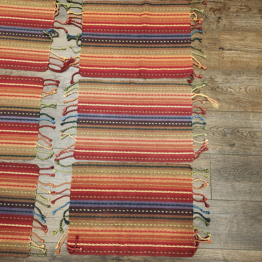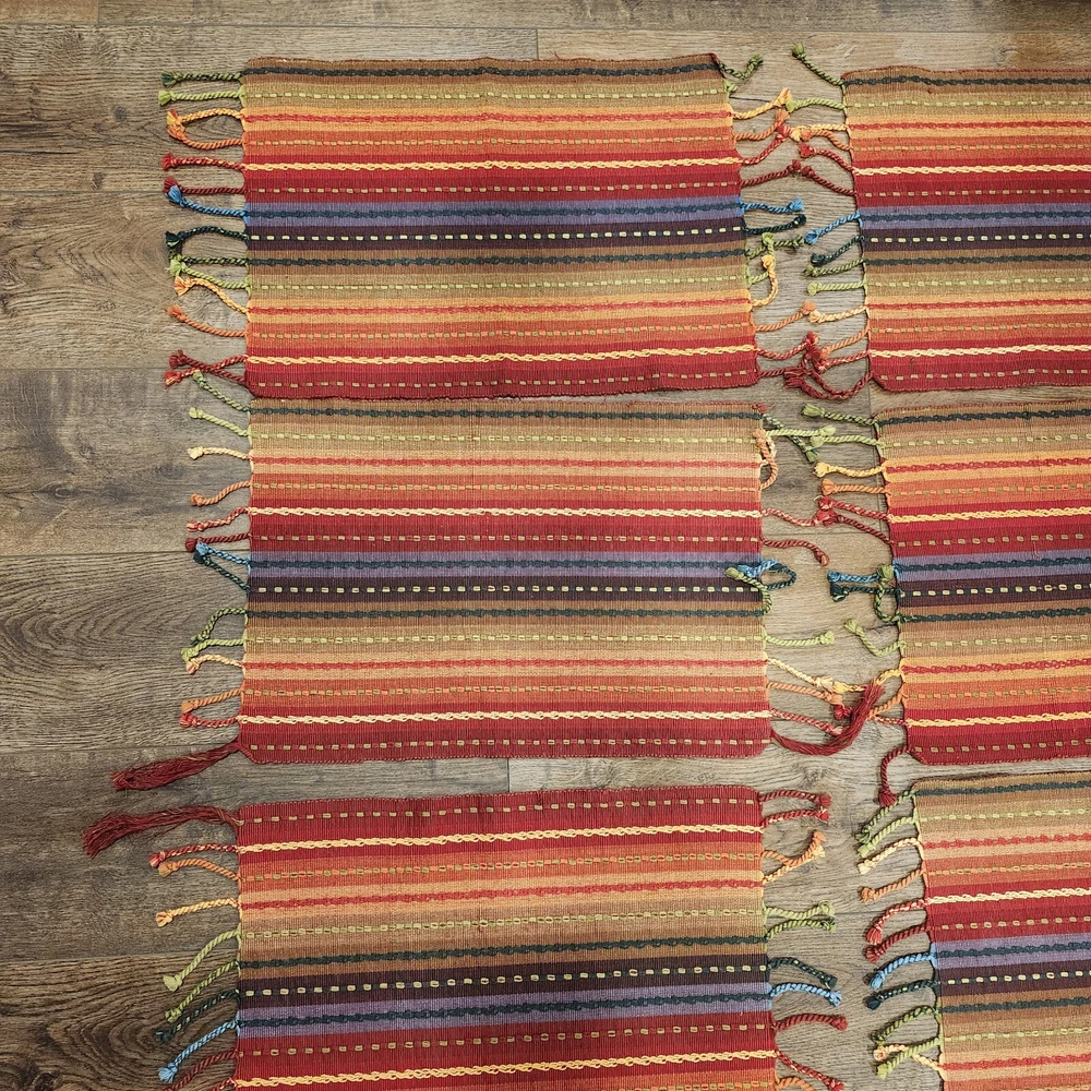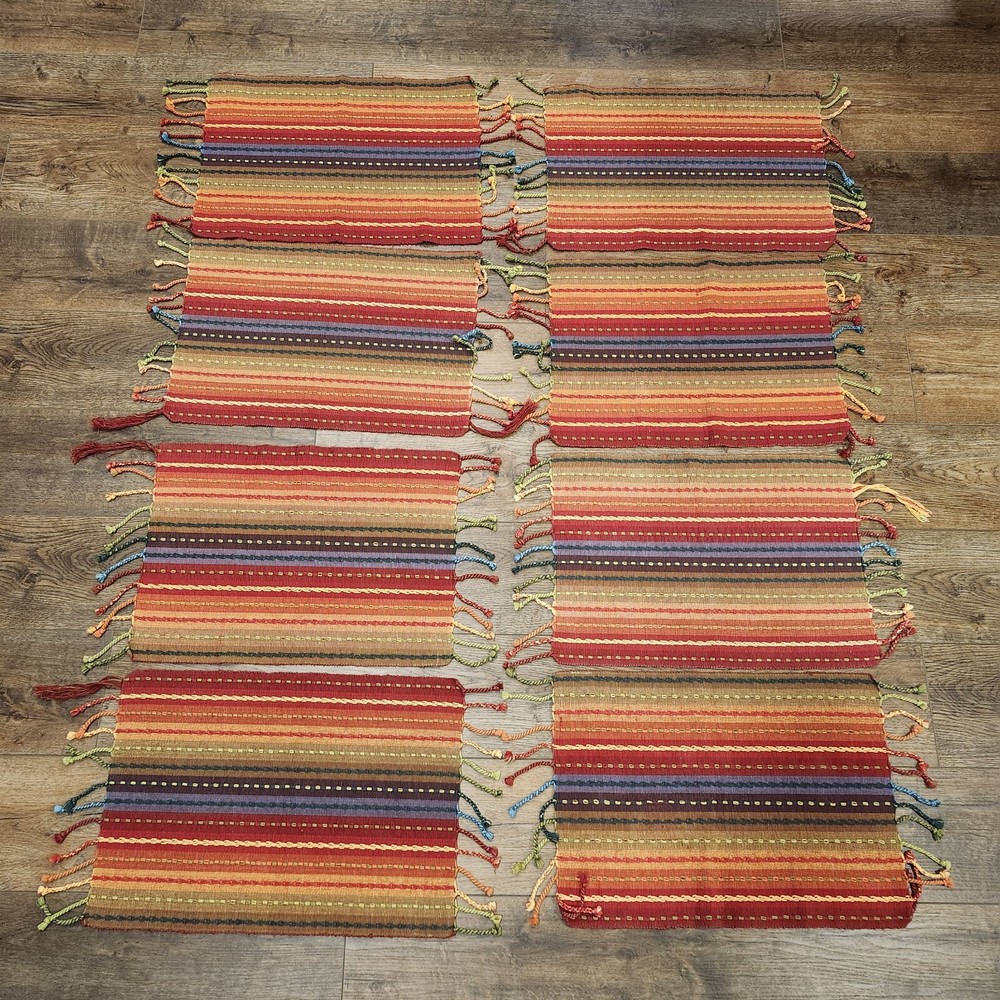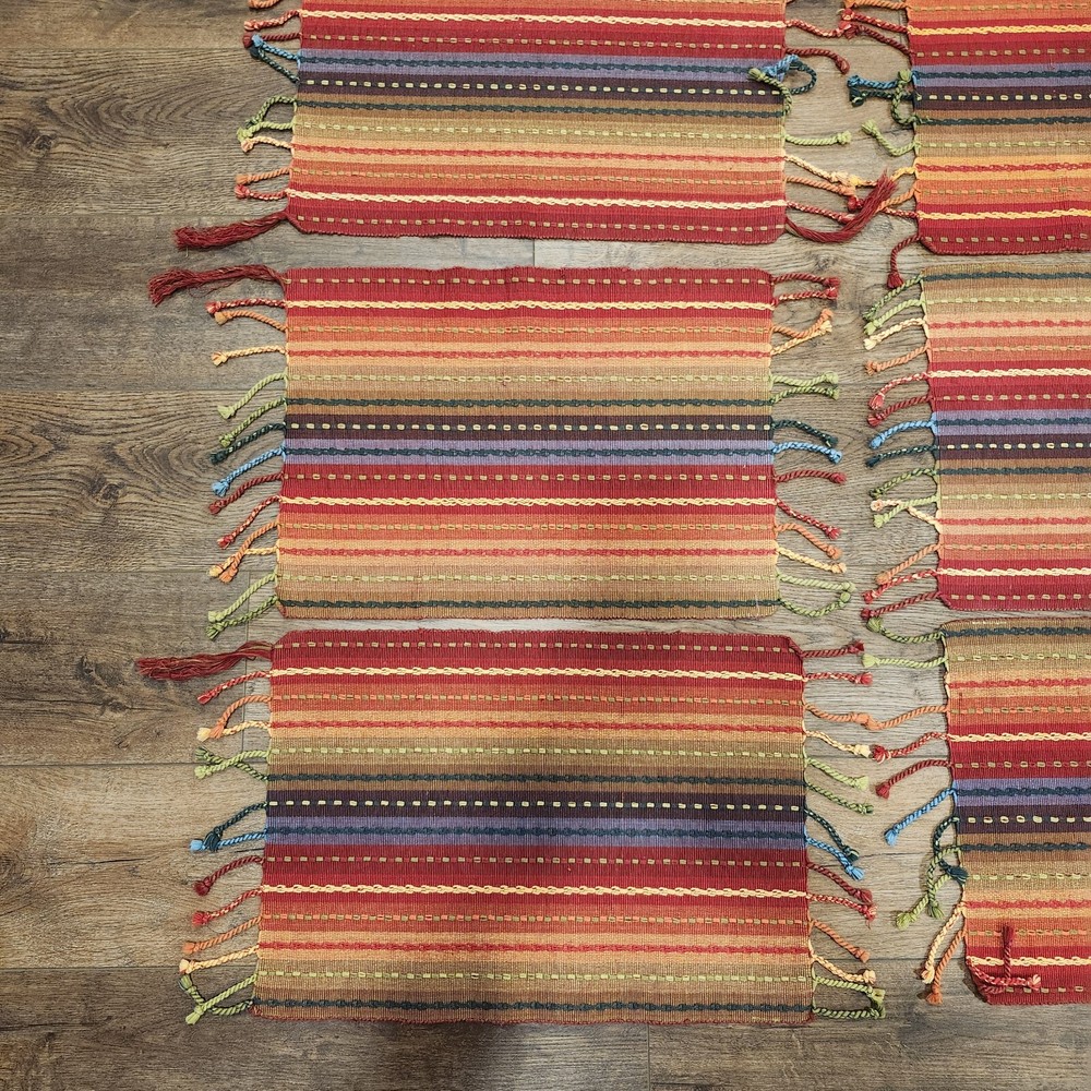 Pier 1 Multi-Stripe Fringe Placemats Set of 8 Southwest Boho Fiesta Design Great condition. A few of the fringe need to be re-twisted (see photos). No stains or tears. Very fun, festive colors. Measure approximately 13.5" x 19" without the fringe. Please view all photos and let us know if you have any questions. We are a smoke and pet free home. 24-367-3