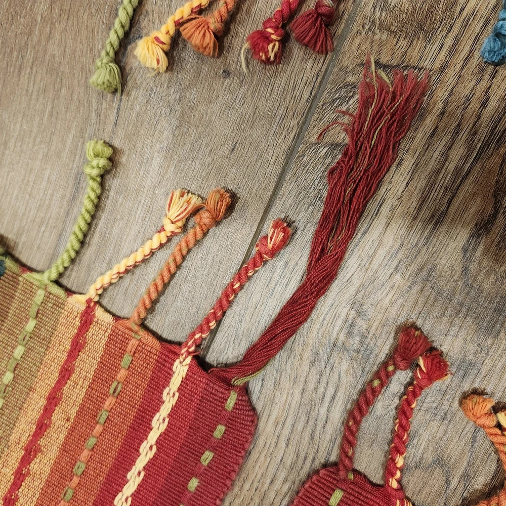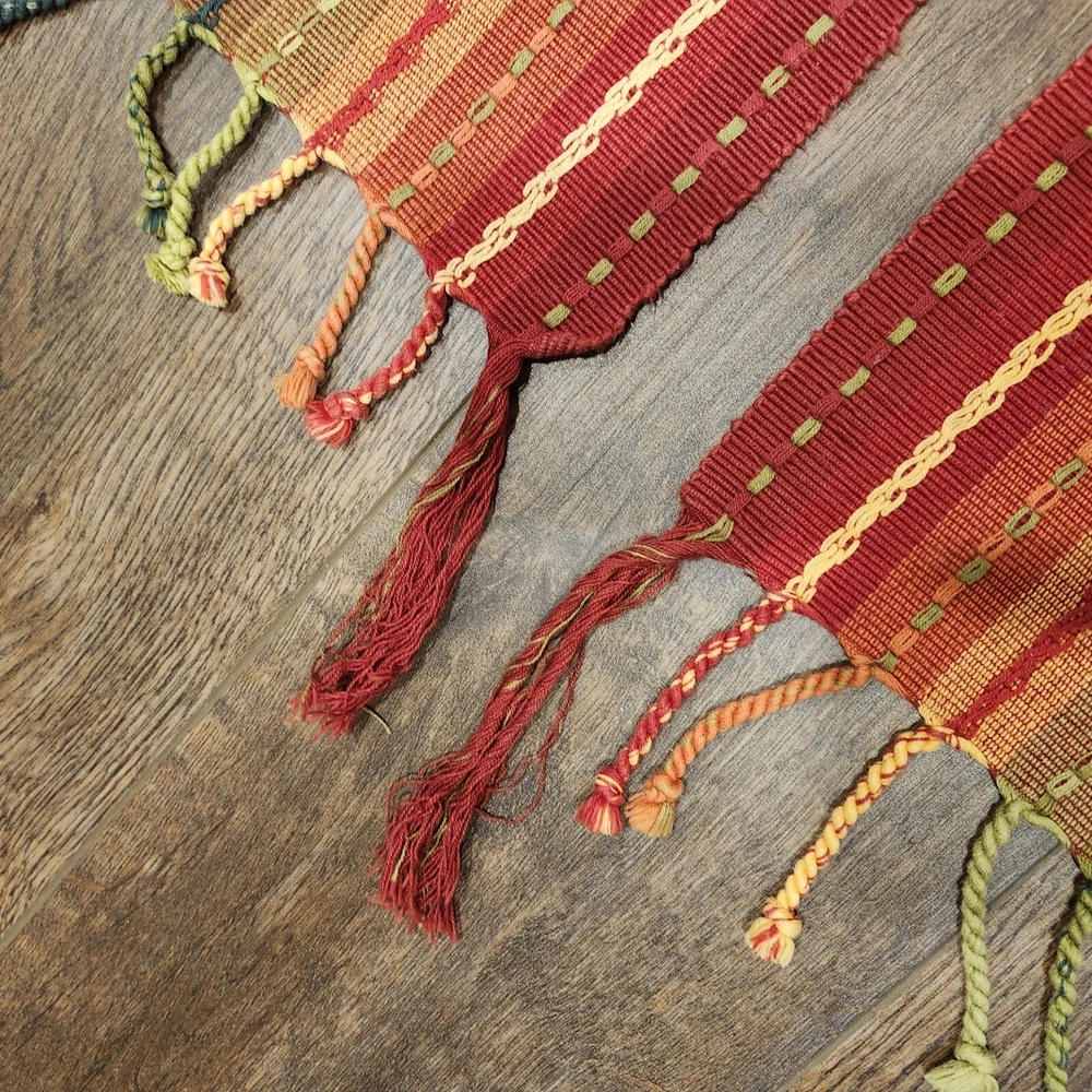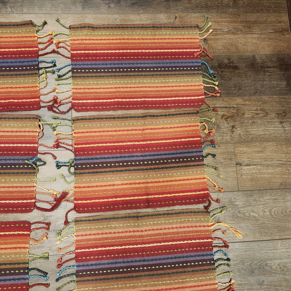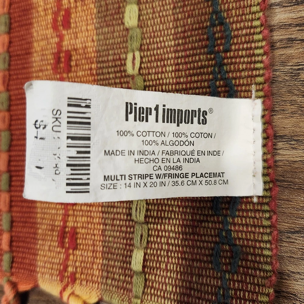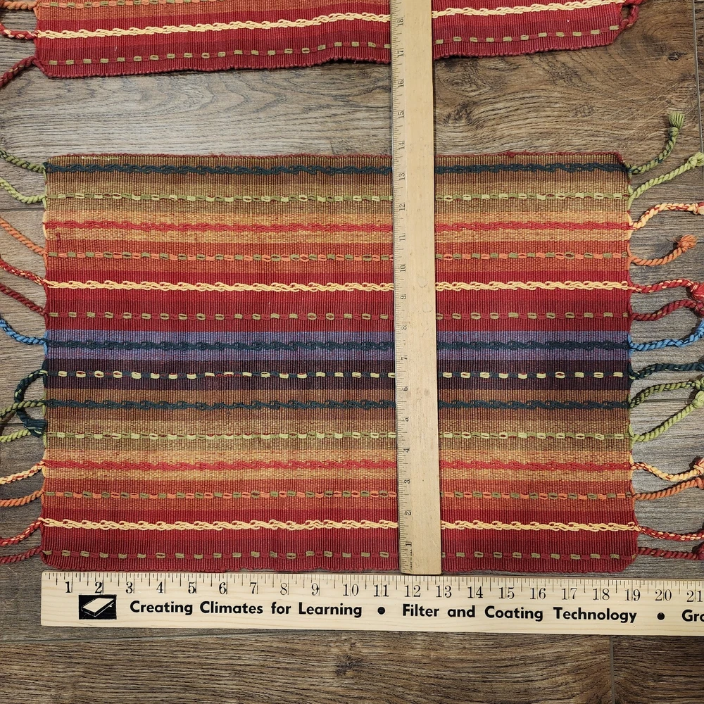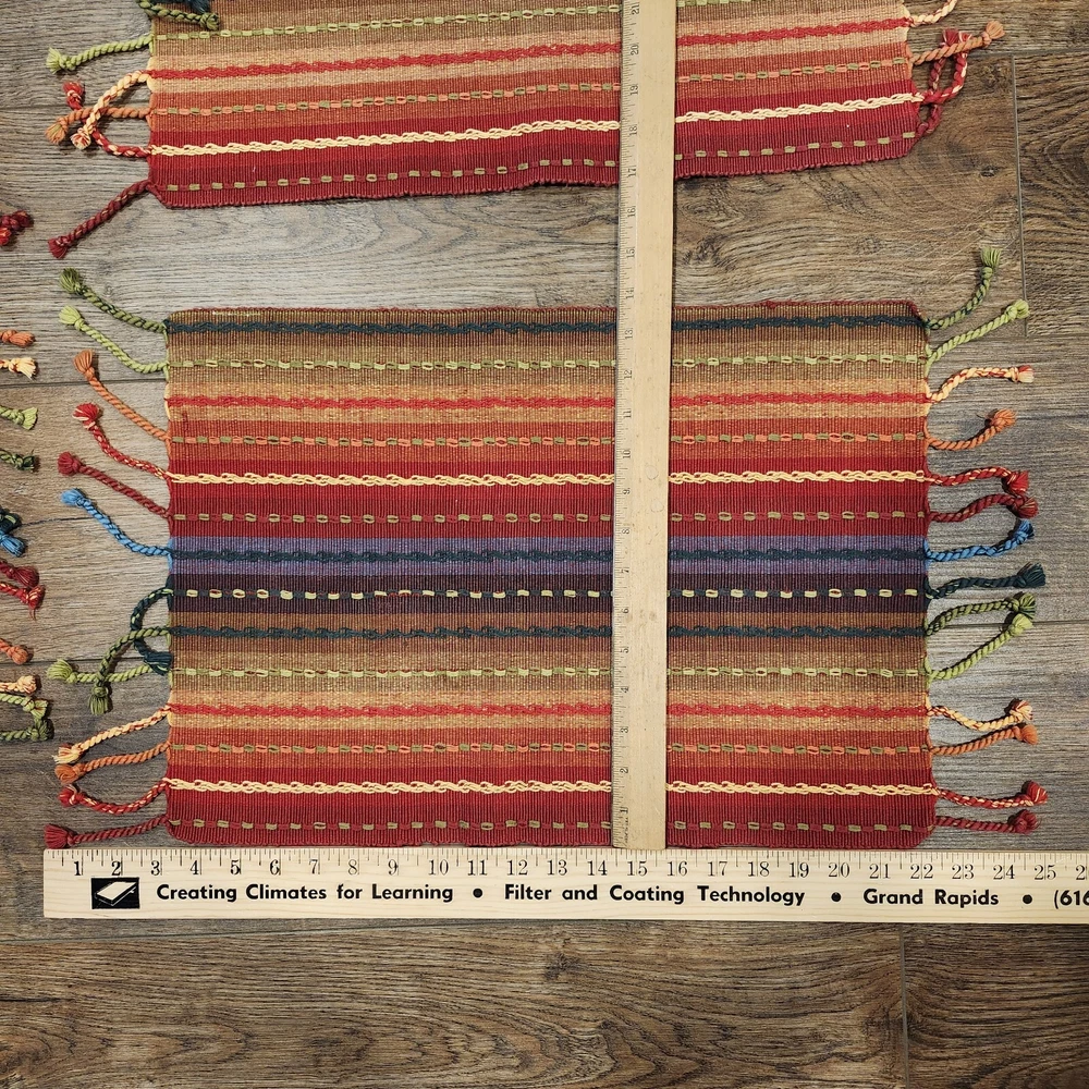 Pier 1 Multi-Stripe Fringe Placemats Set of 8 Southwest Boho Fiesta Design Great condition. A few of the fringe need to be re-twisted (see photos). No stains or tears. Very fun, festive colors. Measure approximately 13.5" x 19" without the fringe. Please view all photos and let us know if you have any questions. We are a smoke and pet free home. 24-367-3
