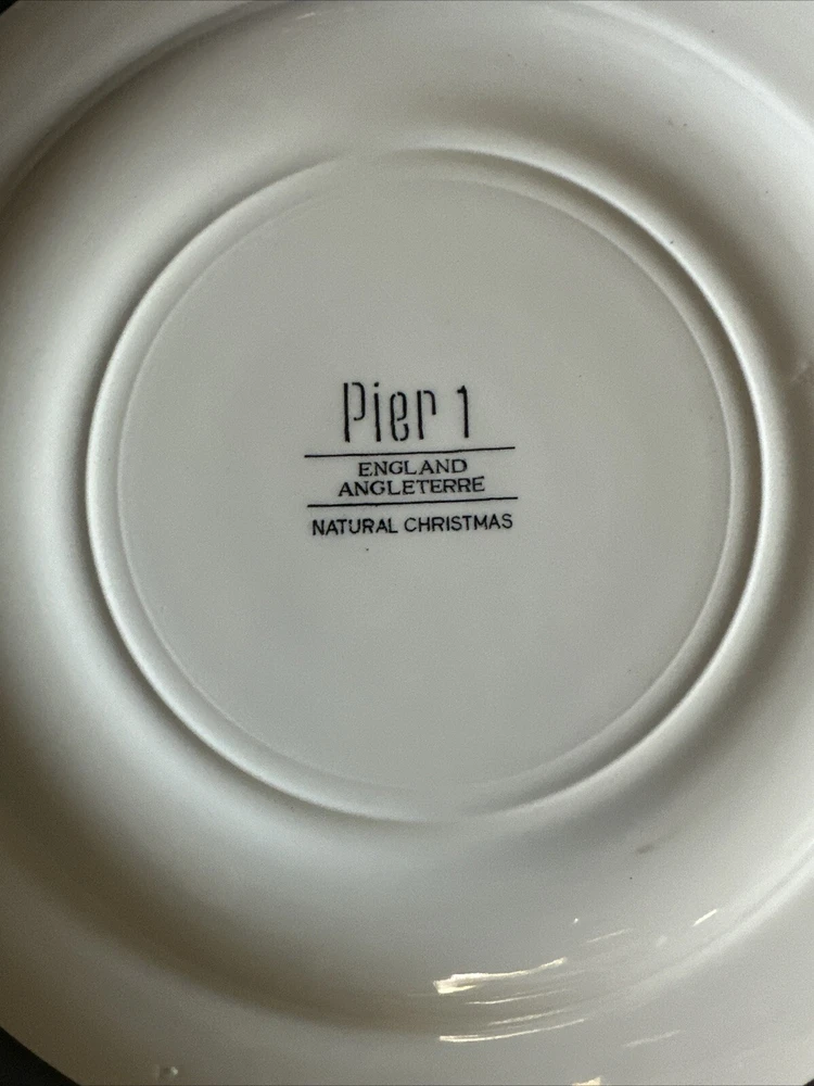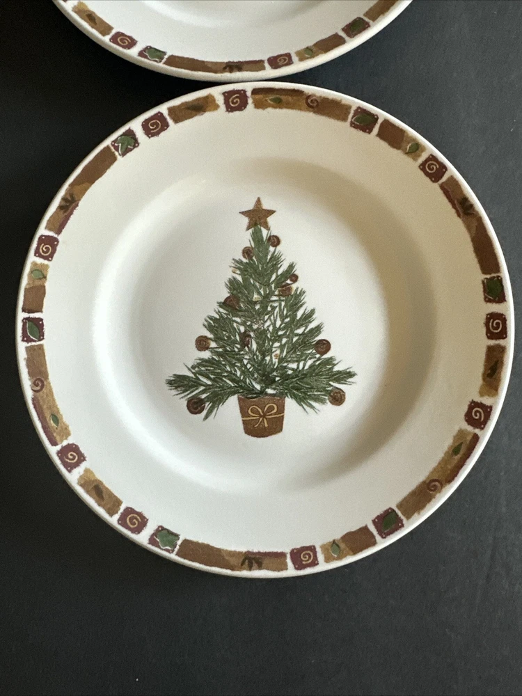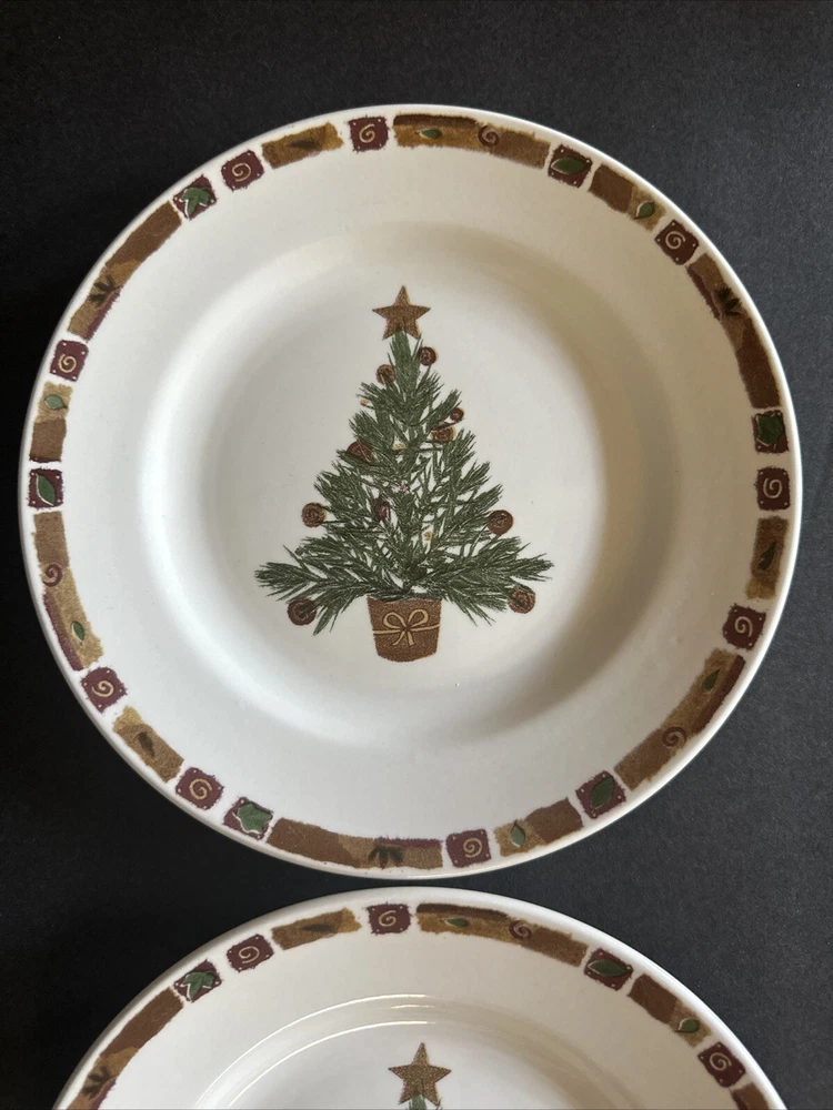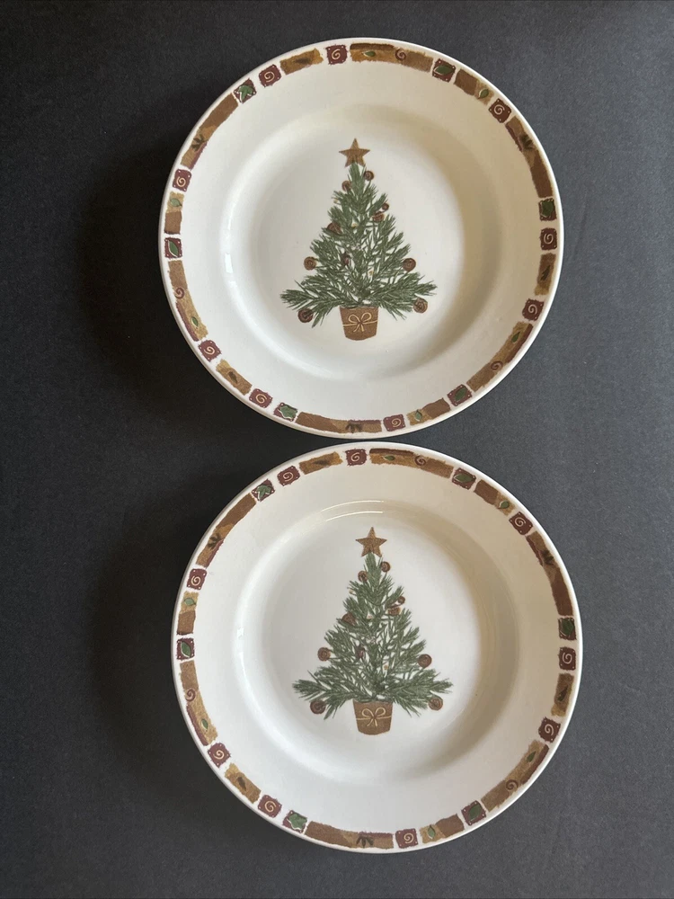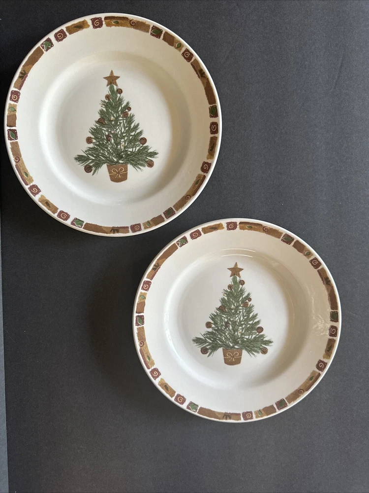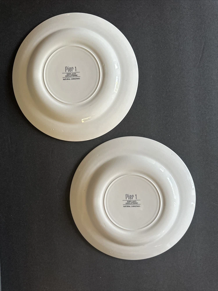 Add a touch of festive charm to your dining table with this set of two Pier 1 Natural Christmas Salad Plates. These round plates measure 8 inches in diameter and feature a multicolor tree pattern that is perfect for the holiday season. Made of high-quality ceramic material, these plates are durable and easy to clean. The plates were manufactured in the United Kingdom and bear a printed backstamp. They are part of the Pier 1 brand's Natural Christmas product line and are ideal for serving salad or any other dish. Bring home the magic of Christmas with these beautiful plates that are sure to impress your guests.