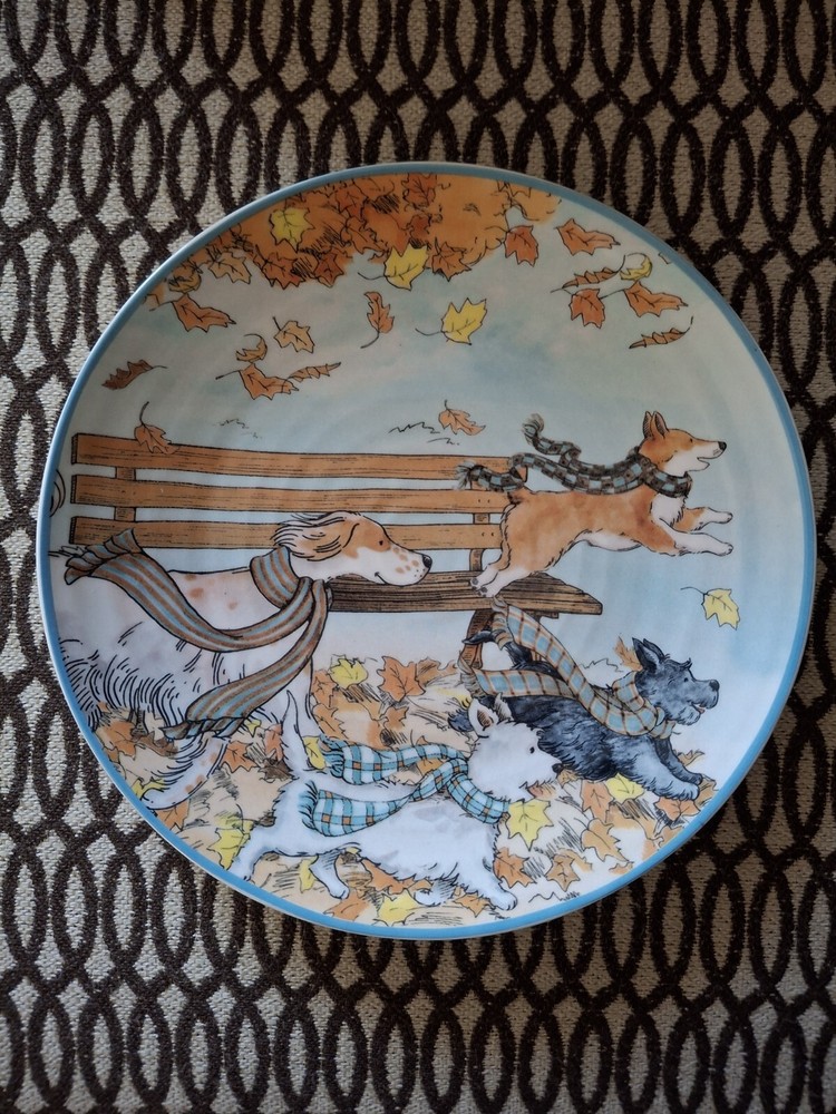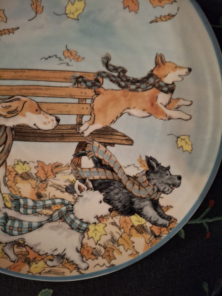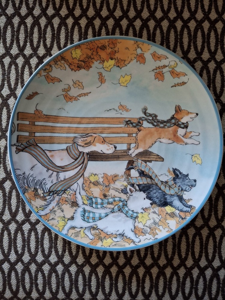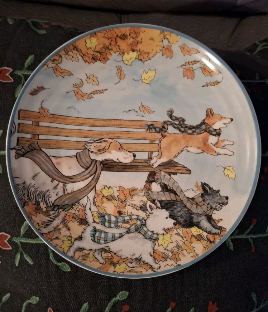 This Pier 1 One "Autumn Park Bench Pups" Plate is perfect for all occasions. The round plate has a diameter of 8.5 inches and features a cute dog pattern that is sure to impress your guests. Made of ceramic material, this plate is stackable, microwave safe, dishwasher safe, and decorative. The multicolor plate belongs to the Pier 1 brand and is part of the Park bench dogs product line. It is ideal for serving salads, desserts, or any other dish you desire. The plate is printed with a backstamp and is a great addition to your collection. Order now and add a touch of fun to your dining experience!