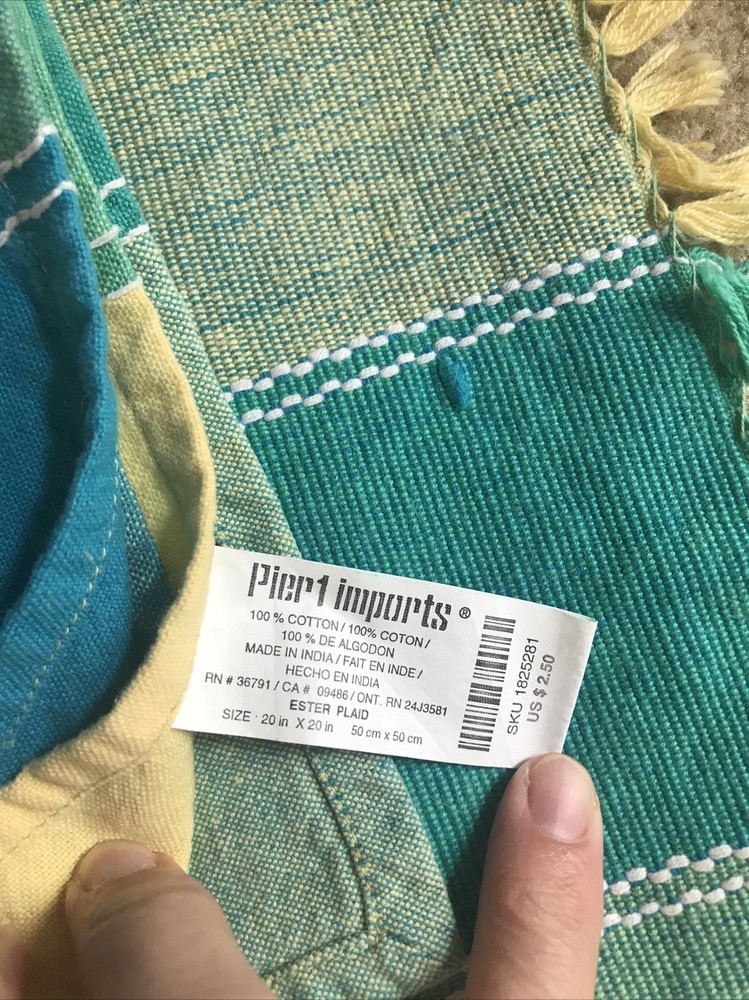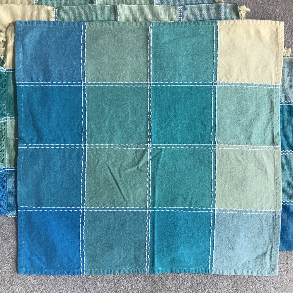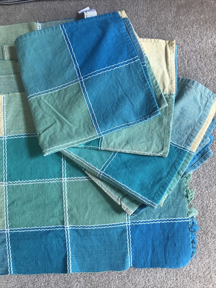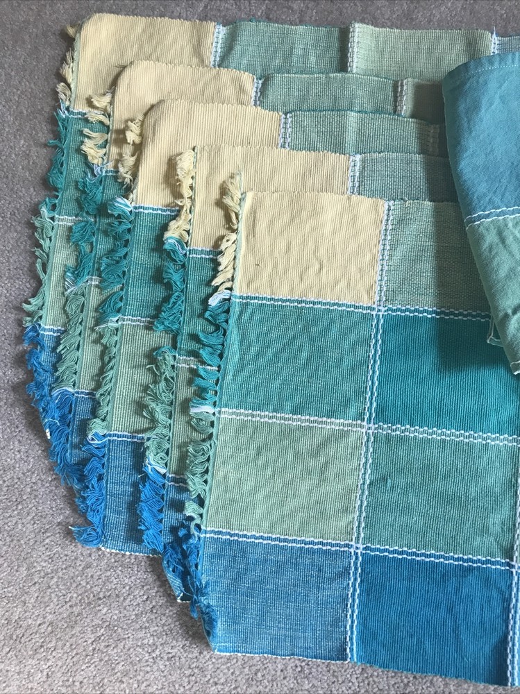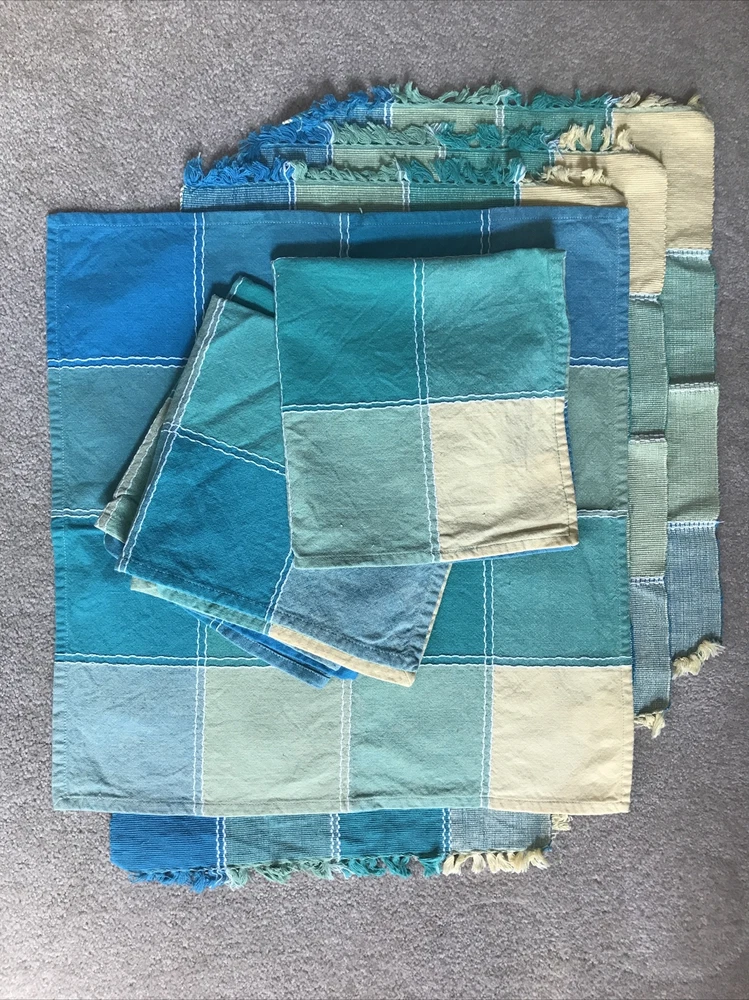 Set of four (4) napkins and four (4) placemats. Gently used. Pier 1 Imports. Teal, blue, yellow, green. No stains, no holes. The placemats want to curl a bit on the corners -- this is typical of ribbed cotton placemats. The tags says, "Ester Plaid". The placemats are approximately 14 x 18" and the napkins are 18 x 19". The actual dimensions reflect shrinkage from the original dimensions.