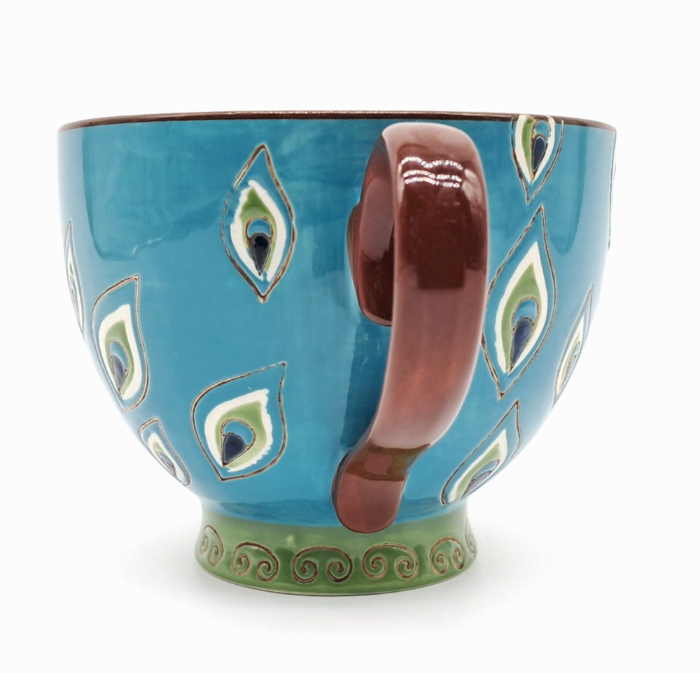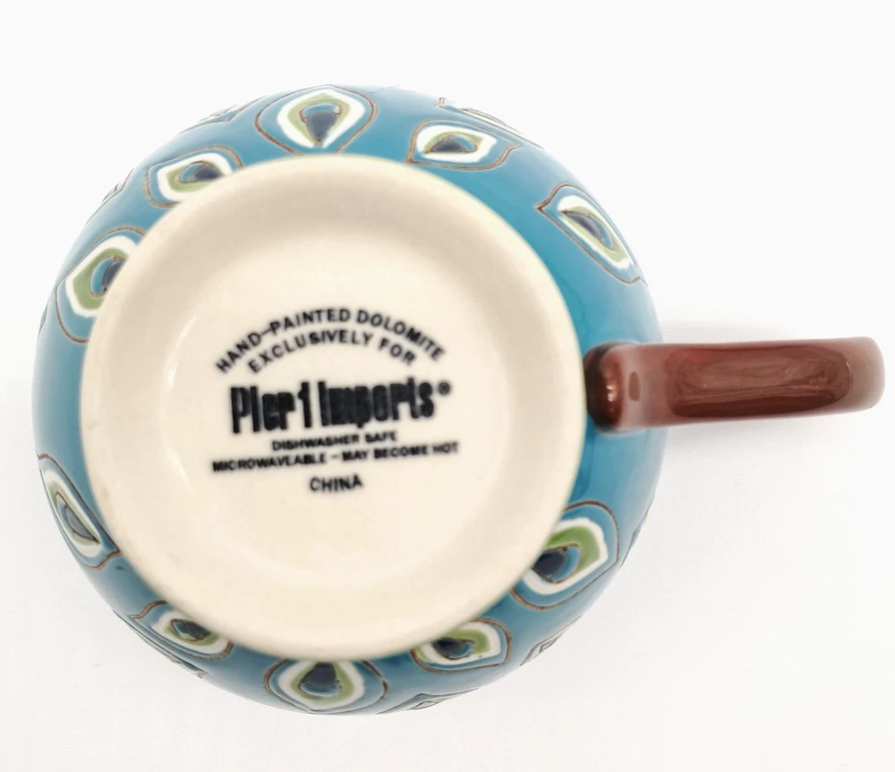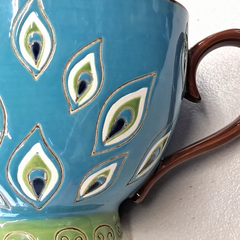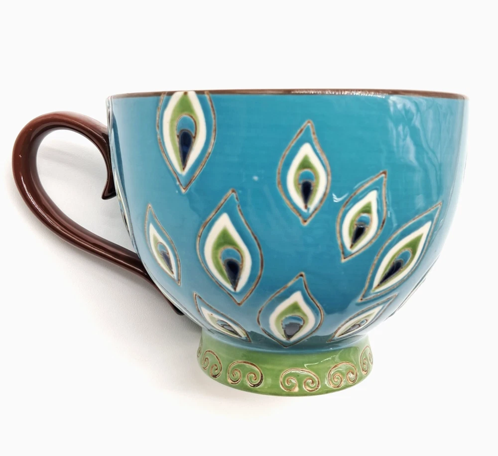 Pier 1 Imports / Pier One footed glossy ceramic coffee mug, hand painted with a peacock feather design all over and a flower made of peacock feathers in the bottom of the cup no chips or cracks - light scratch on exterior, see photos boho / bohemian / colorful