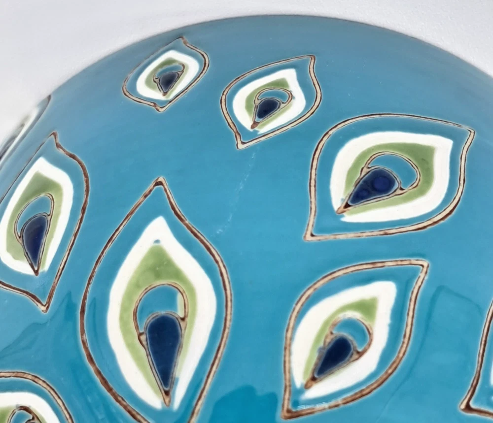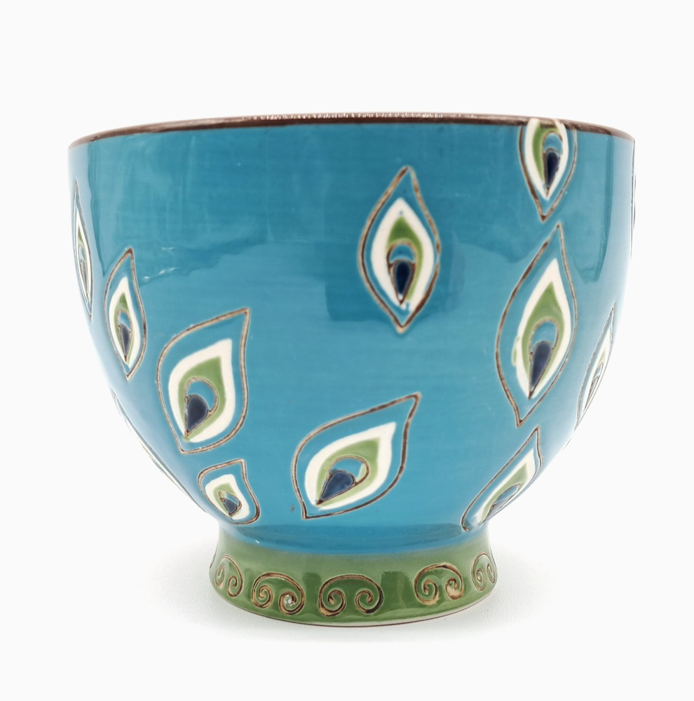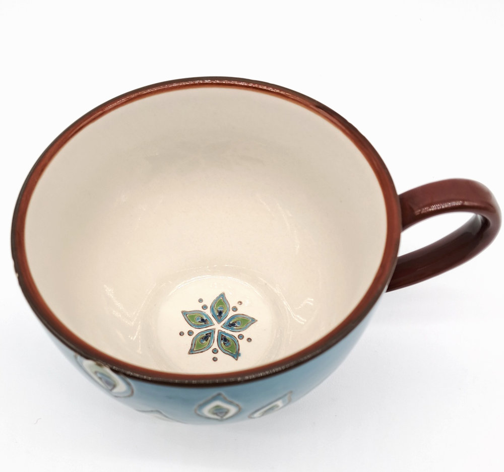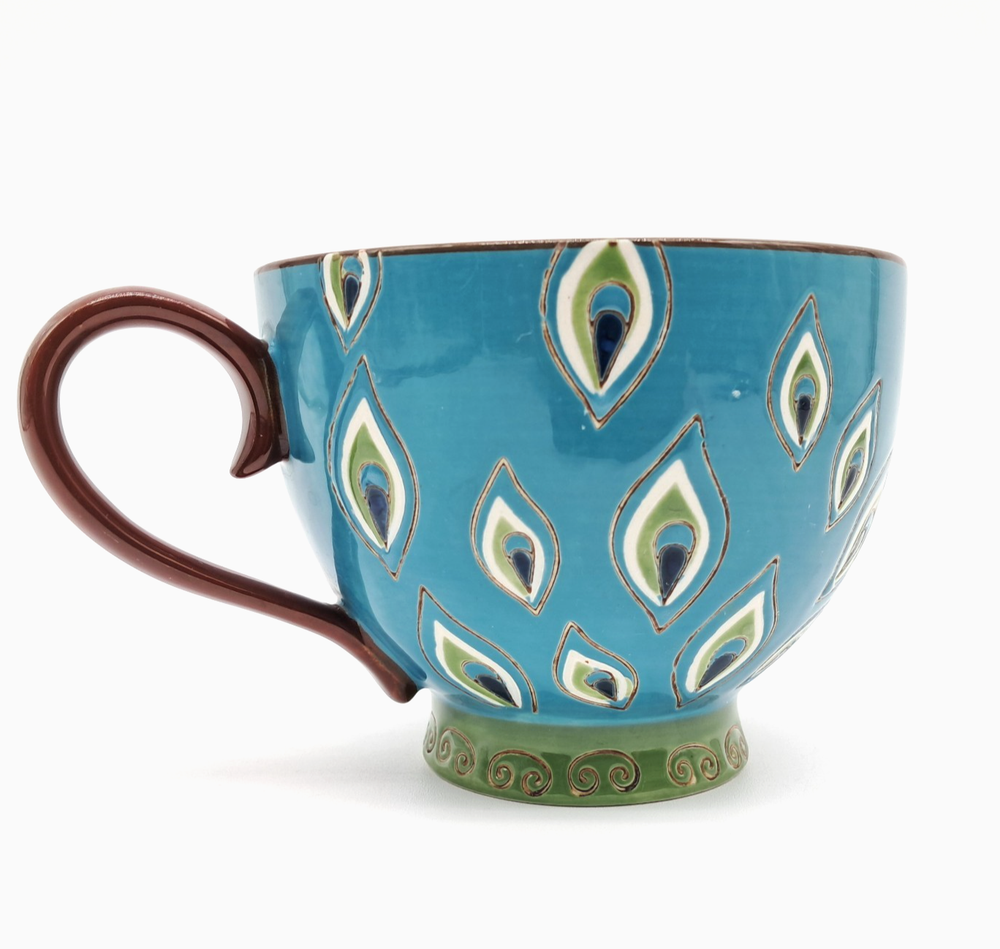 Pier 1 Imports / Pier One footed glossy ceramic coffee mug, hand painted with a peacock feather design all over and a flower made of peacock feathers in the bottom of the cup no chips or cracks - light scratch on exterior, see photos boho / bohemian / colorful