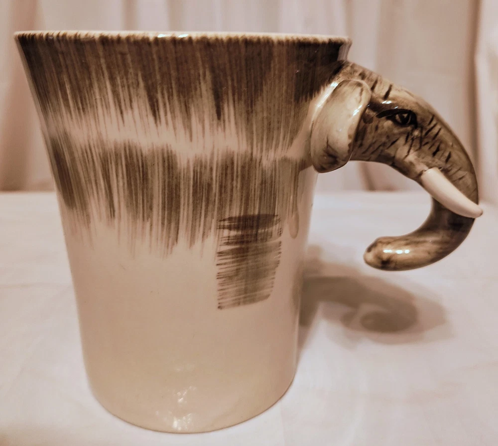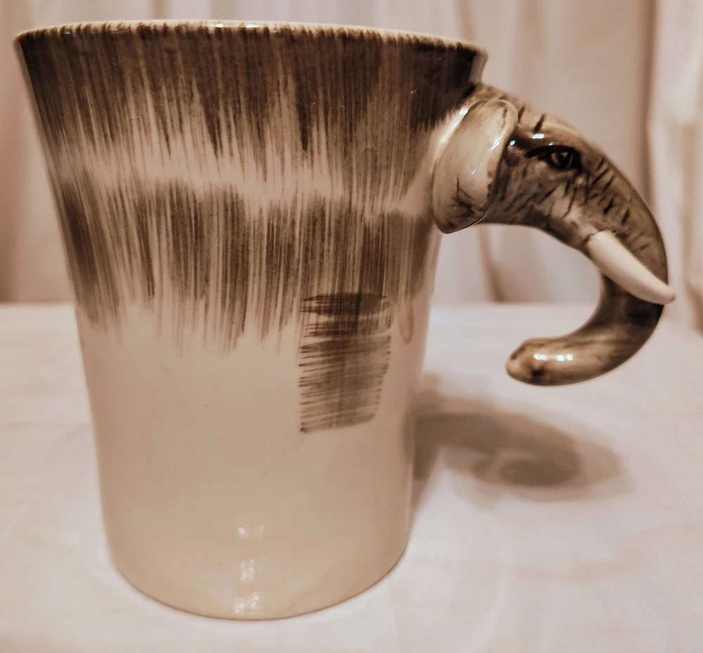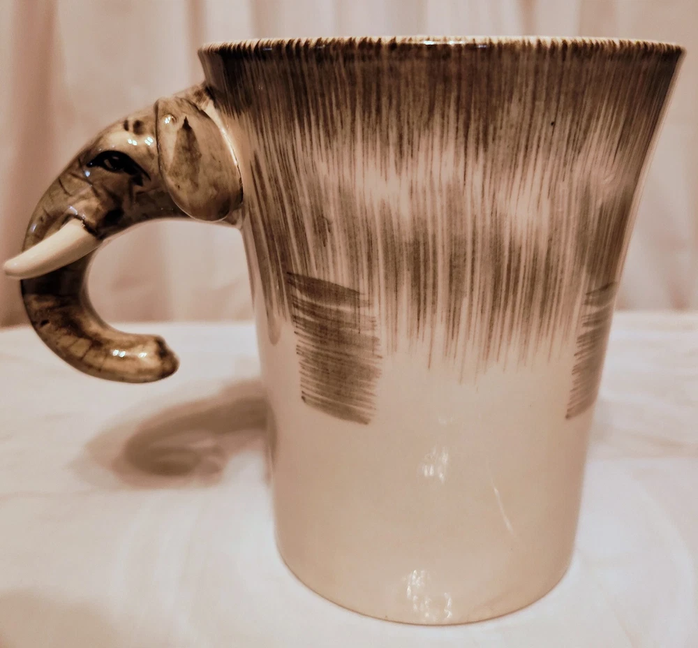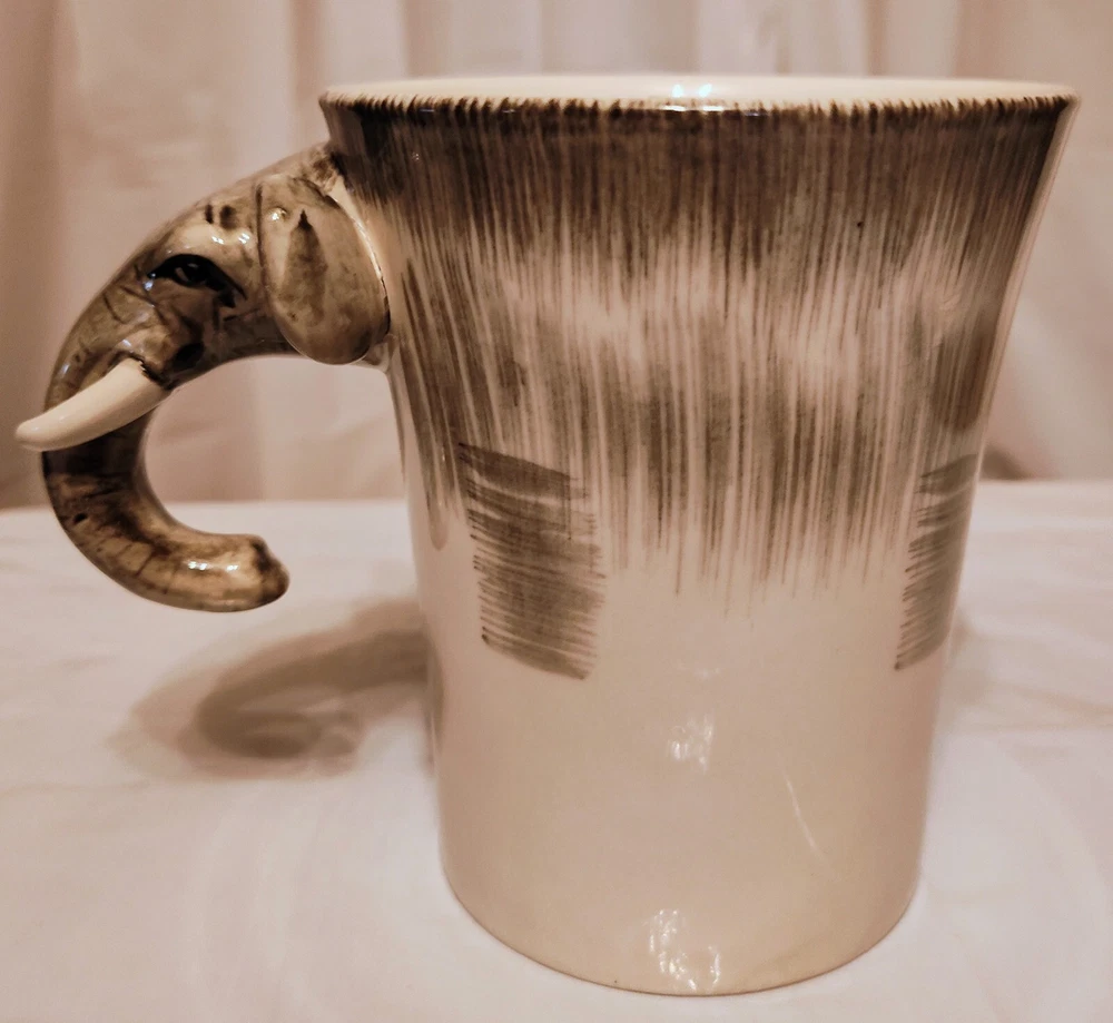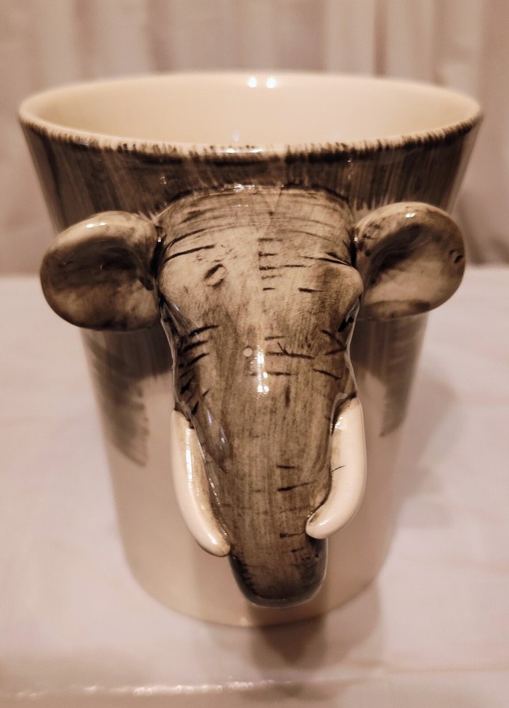 This unique mug features a charming elephant head handle and a 3D design pattern. It is perfect for hot or cold beverages and has a capacity of 14 oz. The mug is made of ceramic and porcelain material with a contemporary style and is suitable for all occasions. The handle is hand-painted and the mug is an original piece from Pier 1 Imports. It is not a vintage item and is not personalized. The mug is suitable for unisex adults and comes with a set that includes the mug cup. The design is embossed and painted, making it a beautiful addition to your collection.