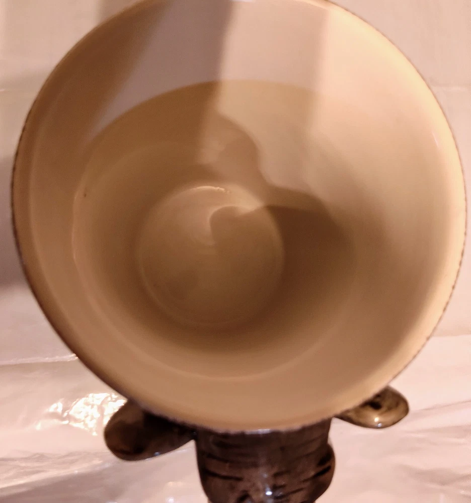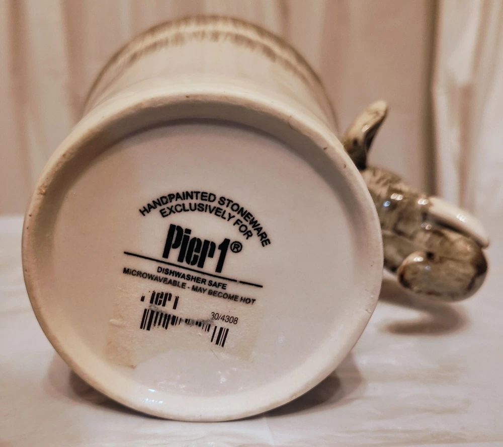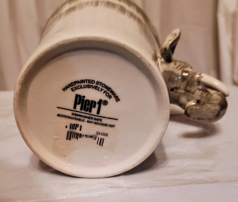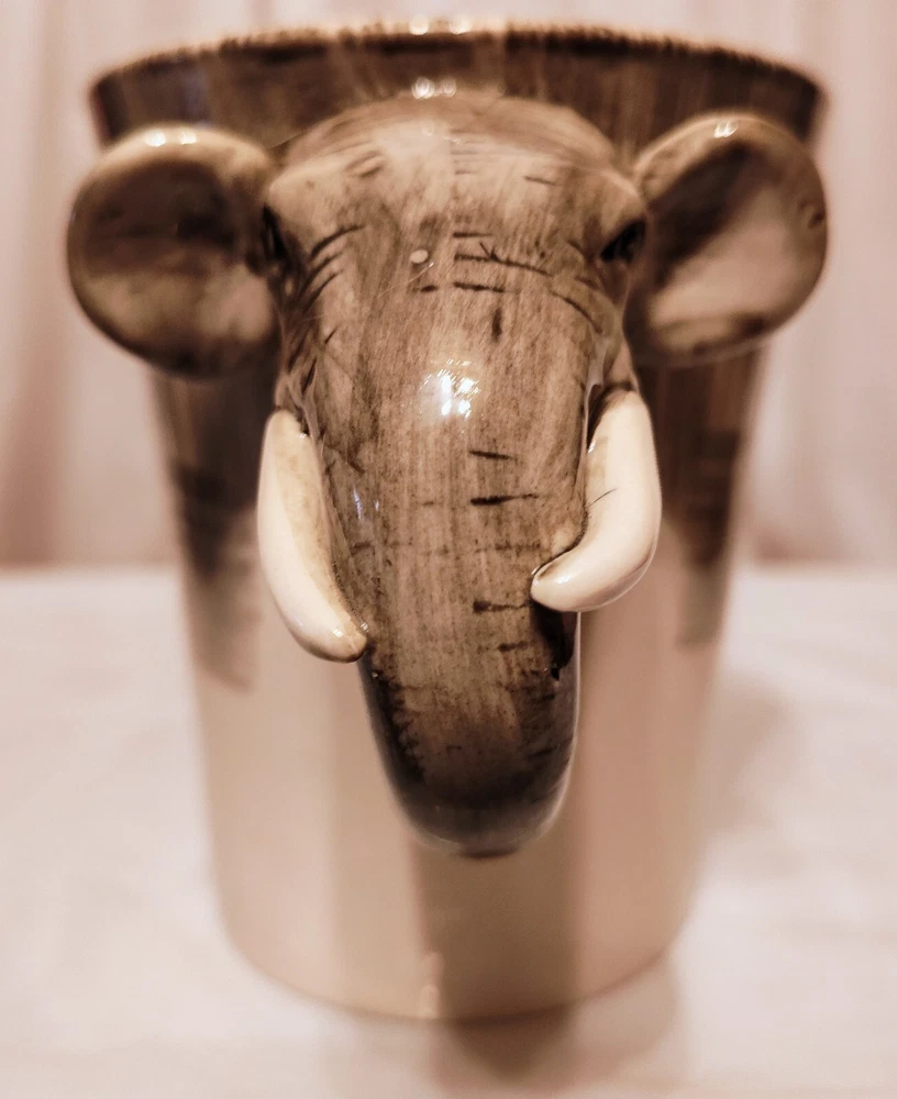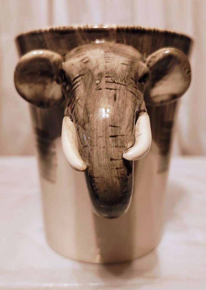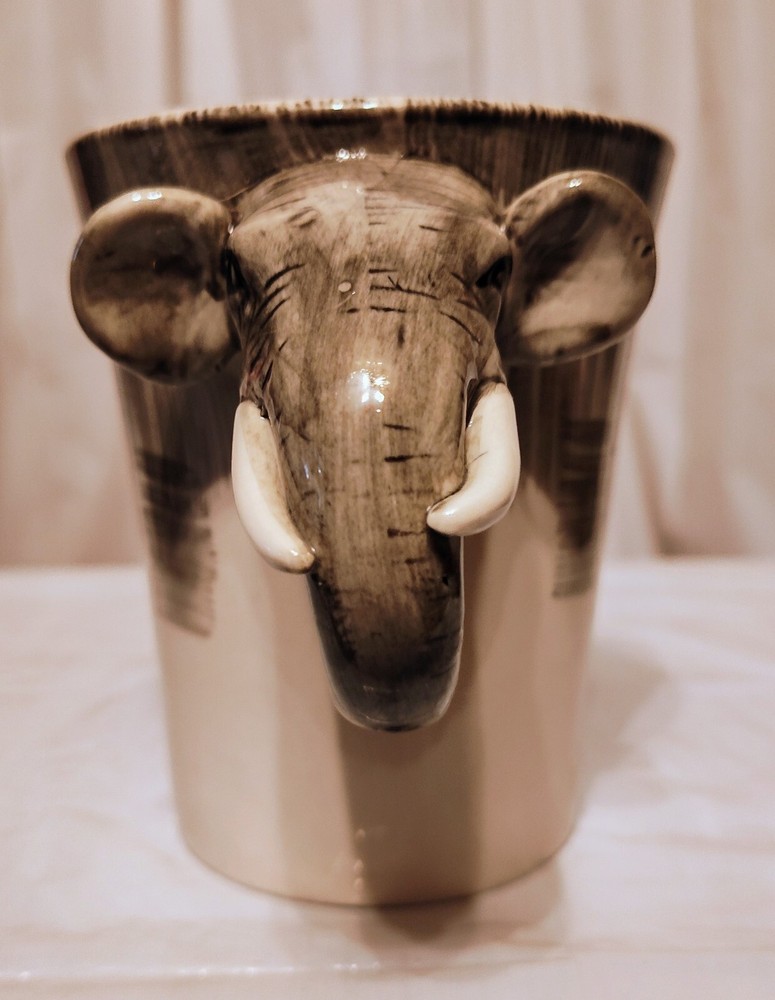 This unique mug features a charming elephant head handle and a 3D design pattern. It is perfect for hot or cold beverages and has a capacity of 14 oz. The mug is made of ceramic and porcelain material with a contemporary style and is suitable for all occasions. The handle is hand-painted and the mug is an original piece from Pier 1 Imports. It is not a vintage item and is not personalized. The mug is suitable for unisex adults and comes with a set that includes the mug cup. The design is embossed and painted, making it a beautiful addition to your collection.