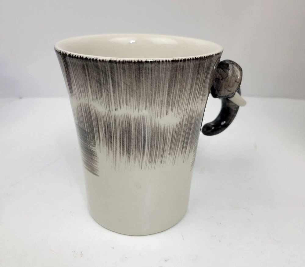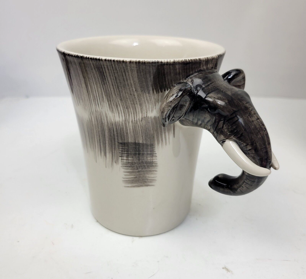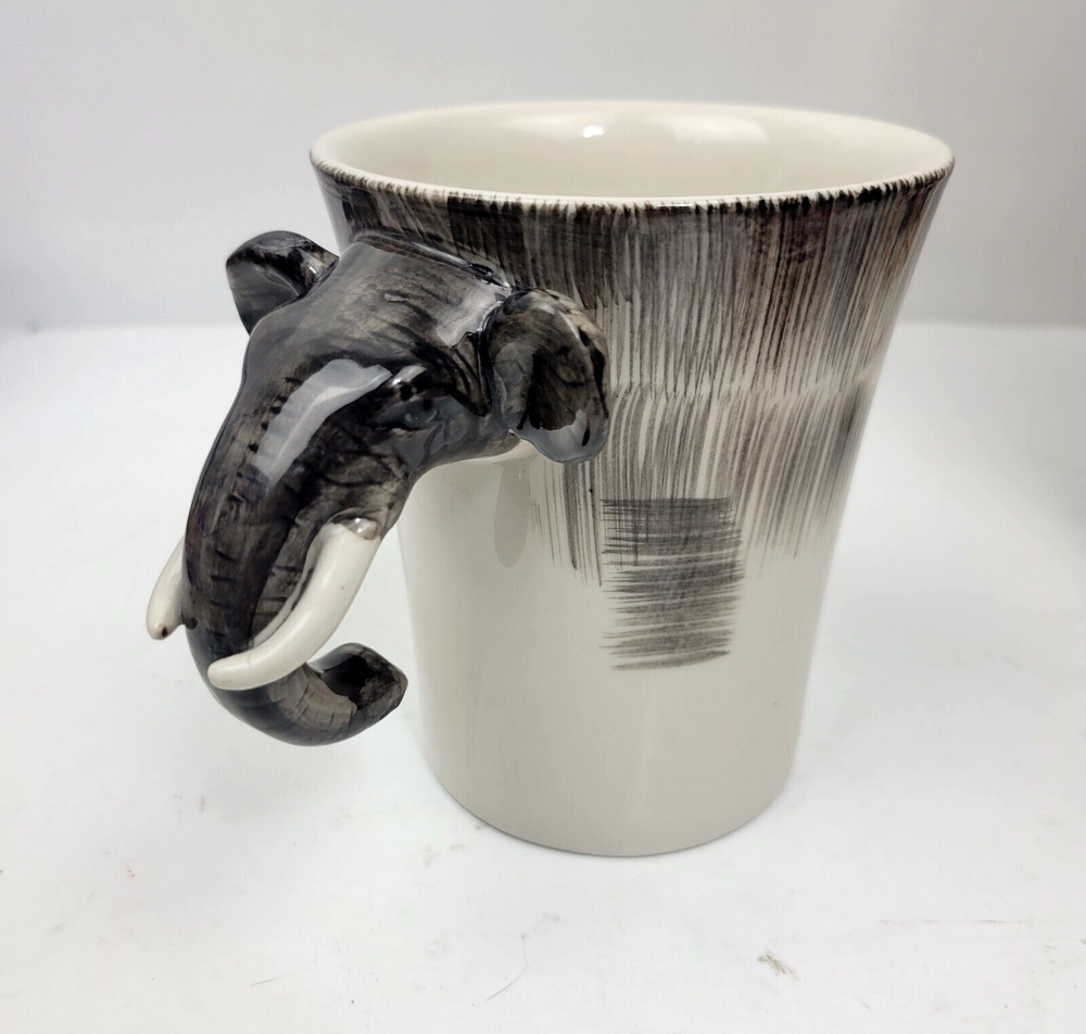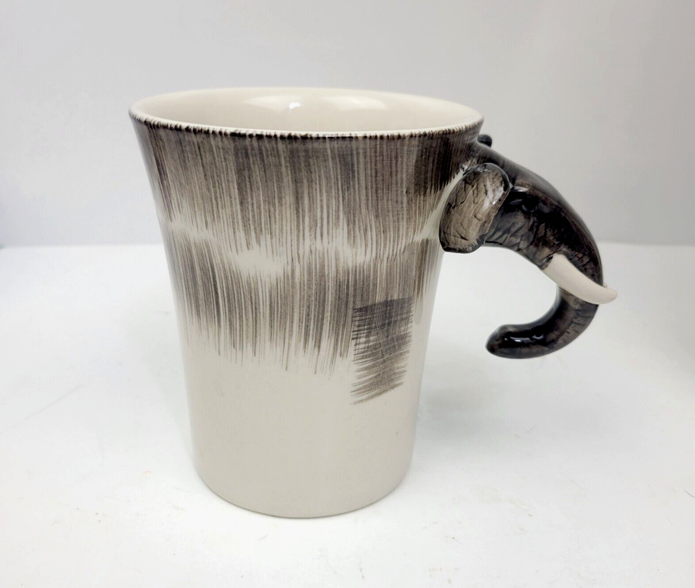 Pier 1 One Imports 3D Elephant Head Trunk Handle Coffee Mug Cup 16 oz Gray White Add a touch of whimsy to your morning coffee routine with this charming Pier 1 Imports 3D Figural Elephant Head Handle Coffee Mug. Made of sturdy stoneware material, this hand-painted mug features a unique, large elephant head & trunk-shaped handle and a subtle, wraparound elephant body print design in gray and white to make your daily cup of tea or coffee a little more exciting. Measures approx. 4 3/4" H x 4" W. In pre-owned, but unused condition. No chips or cracks. Please see pictures for more details.