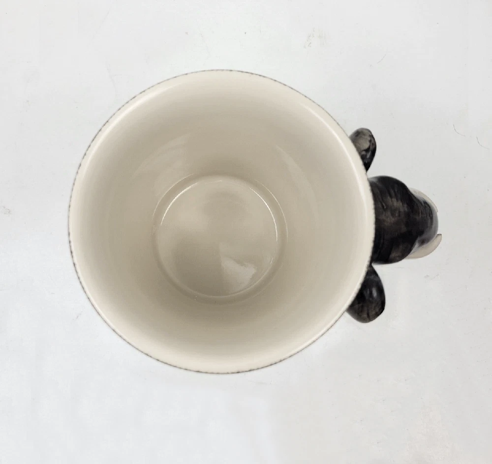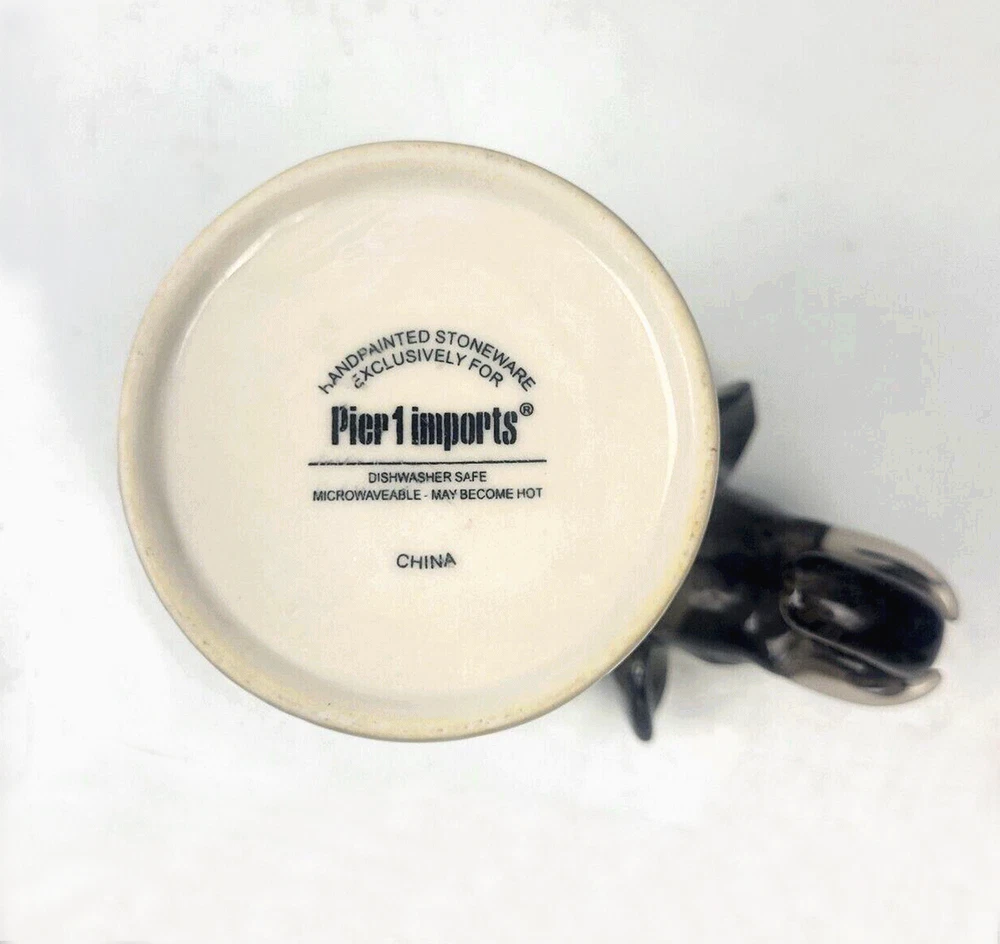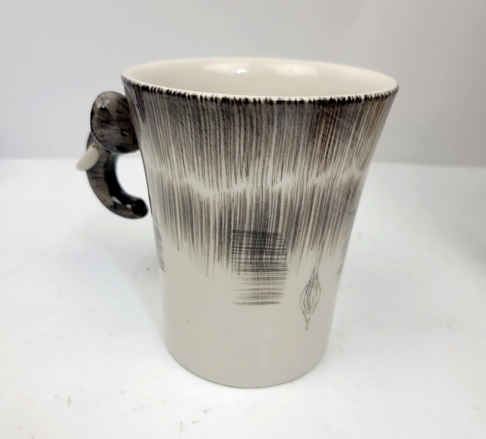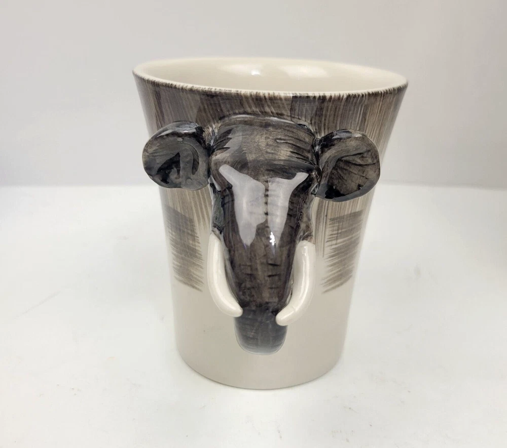 Pier 1 One Imports 3D Elephant Head Trunk Handle Coffee Mug Cup 16 oz Gray White Add a touch of whimsy to your morning coffee routine with this charming Pier 1 Imports 3D Figural Elephant Head Handle Coffee Mug. Made of sturdy stoneware material, this hand-painted mug features a unique, large elephant head & trunk-shaped handle and a subtle, wraparound elephant body print design in gray and white to make your daily cup of tea or coffee a little more exciting. Measures approx. 4 3/4" H x 4" W. In pre-owned, but unused condition. No chips or cracks. Please see pictures for more details.
