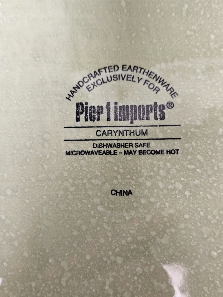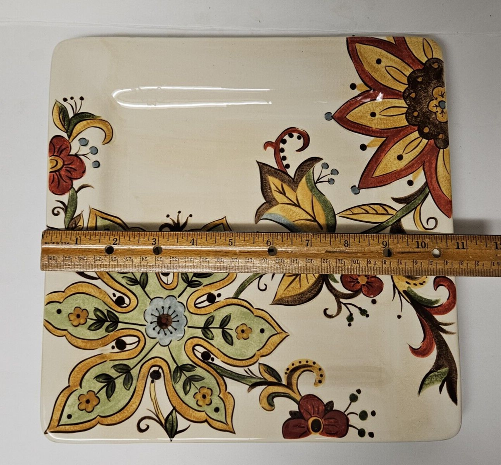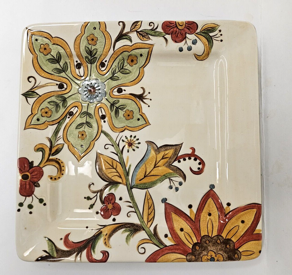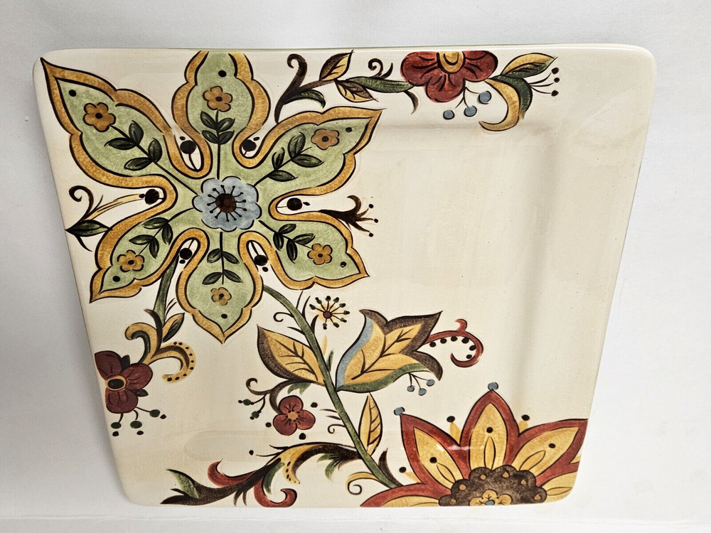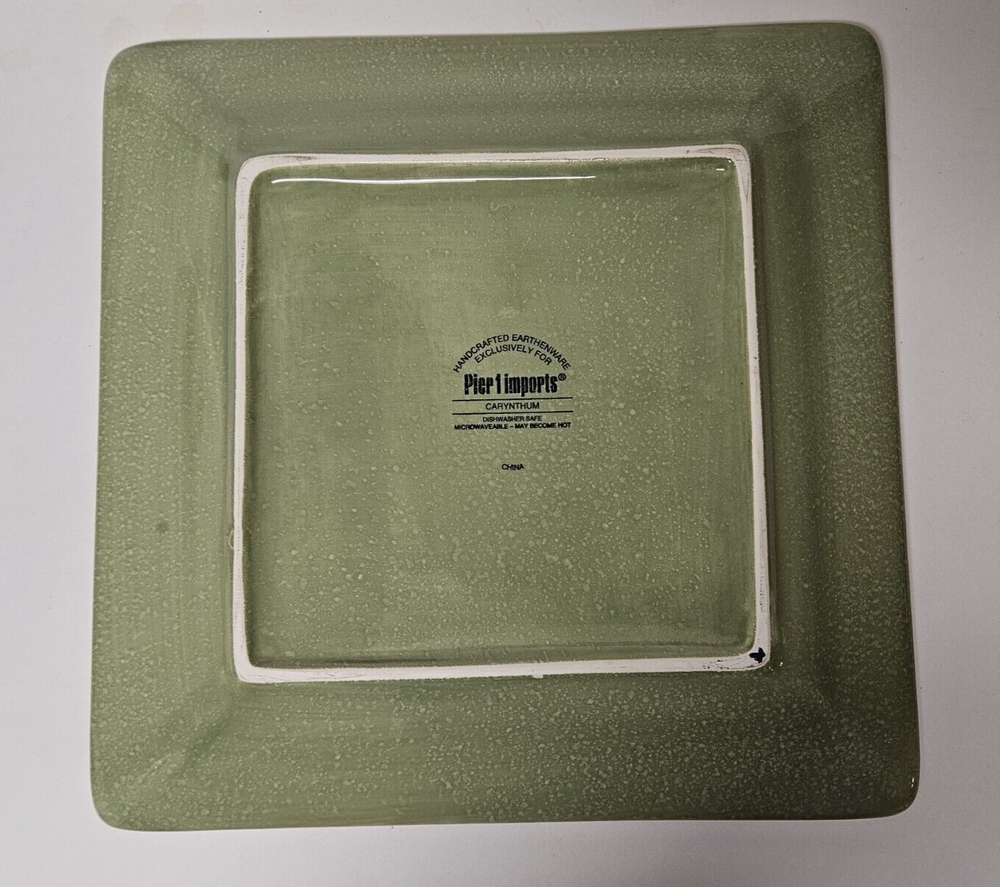 Pier 1 One Imports Carynthum Hand Painted Earthenware 10.75" Square Dinner Plate This is a square dinner plate from Pier 1 Imports in the Carynthum pattern. This pattern has a cream colored background with large colorful floral designs. This plate is 10.75" square. The back of the plate is a soft green color. I have several available and they are all in excellent condition.