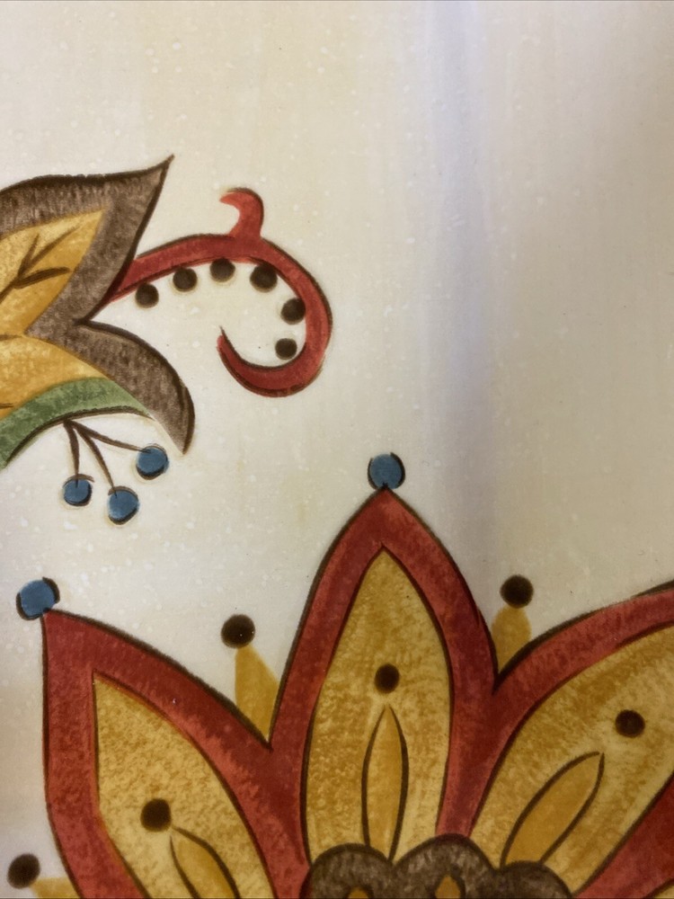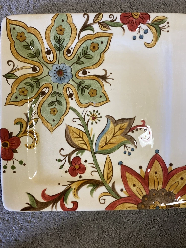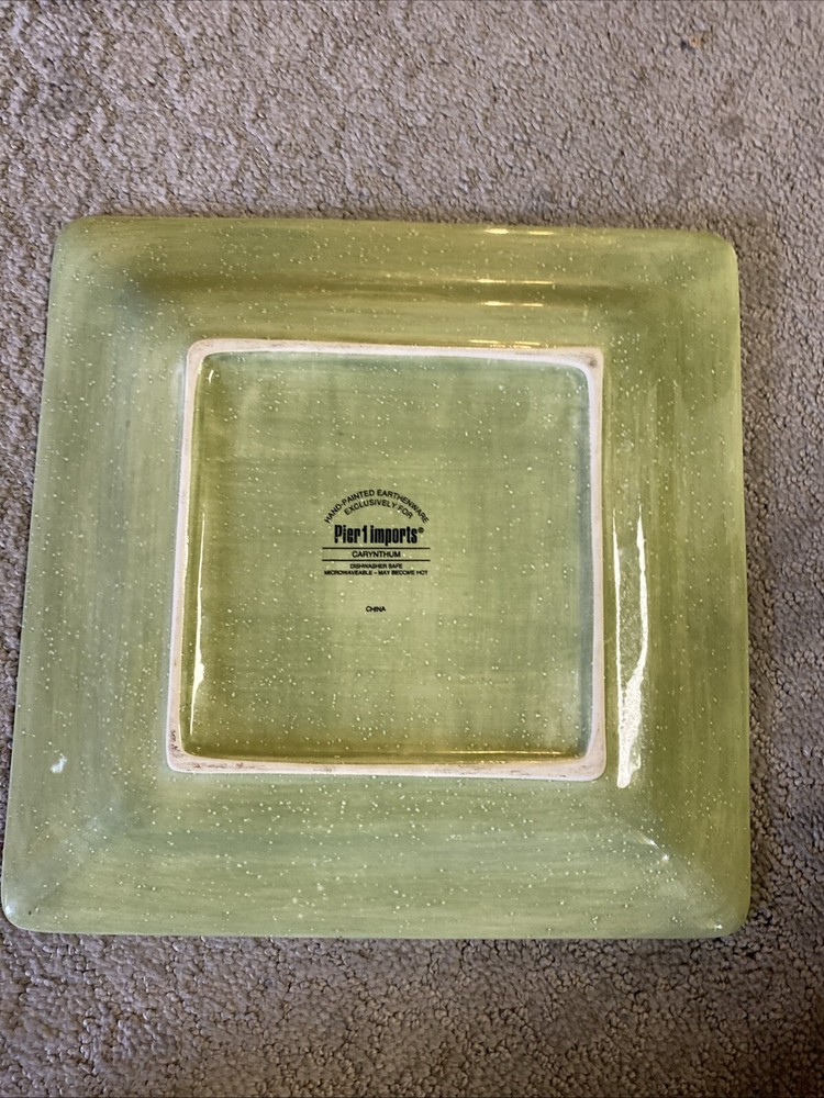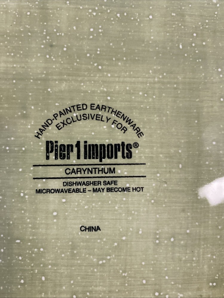 Add a touch of elegance to your dinner table with this beautiful Pier 1 Imports Carynthum dinner plate. The hand-painted floral pattern on the earthenware adds a contemporary style to any occasion. This square dinner plate measures 10.75 inches in length and width, perfect for your favorite entree. It features a glossy finish and is stackable, microwave and dishwasher safe. The care instructions recommend machine washing up to 100°F. This original production style is from 2009, and it's an ideal addition to your dinnerware collection.