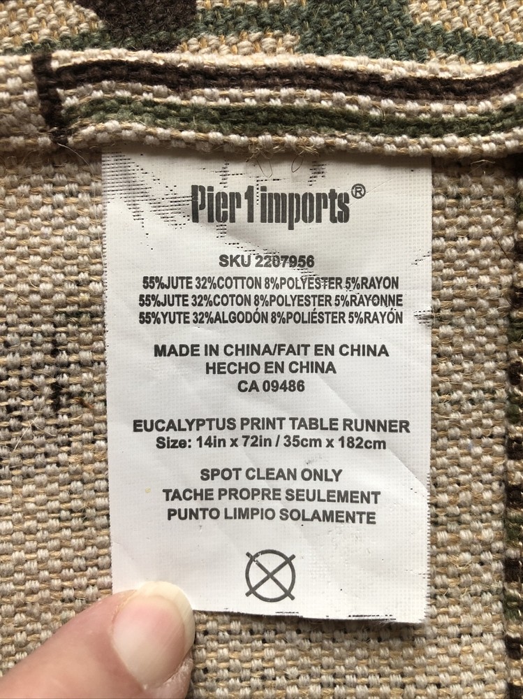Pier 1 Imports table runner "Eucalyptus Print Table Runner" App 72" x 14" Jute/cotton/polyester/rayon blend Spot clean...