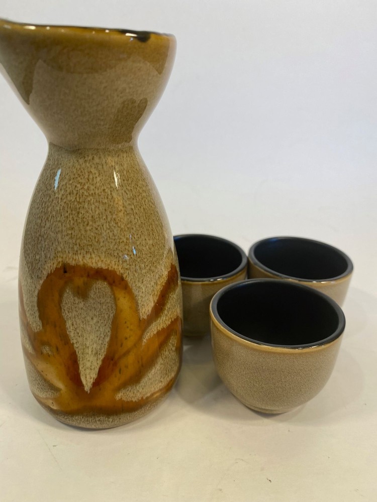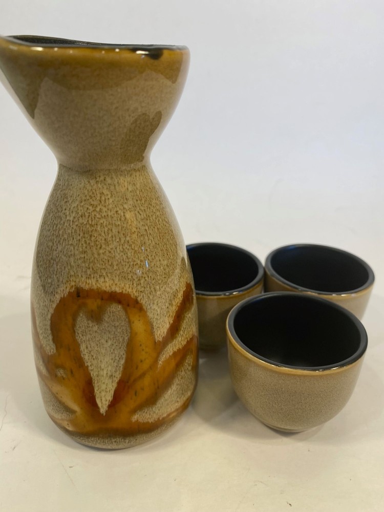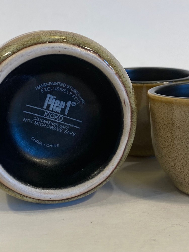Pier 1 One Imports Kioko Design Sake Stoneware Ceramic Pottery Set. Includes Carafe Decanter and 3 cups. The decanter measure 5 1/2 inches and the cups are 1 1/2 inches tall. No chips or cracks. Condi...