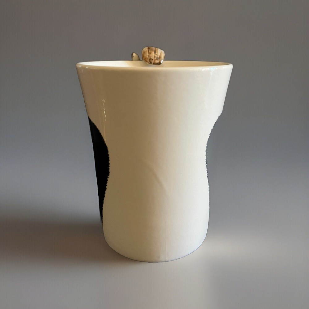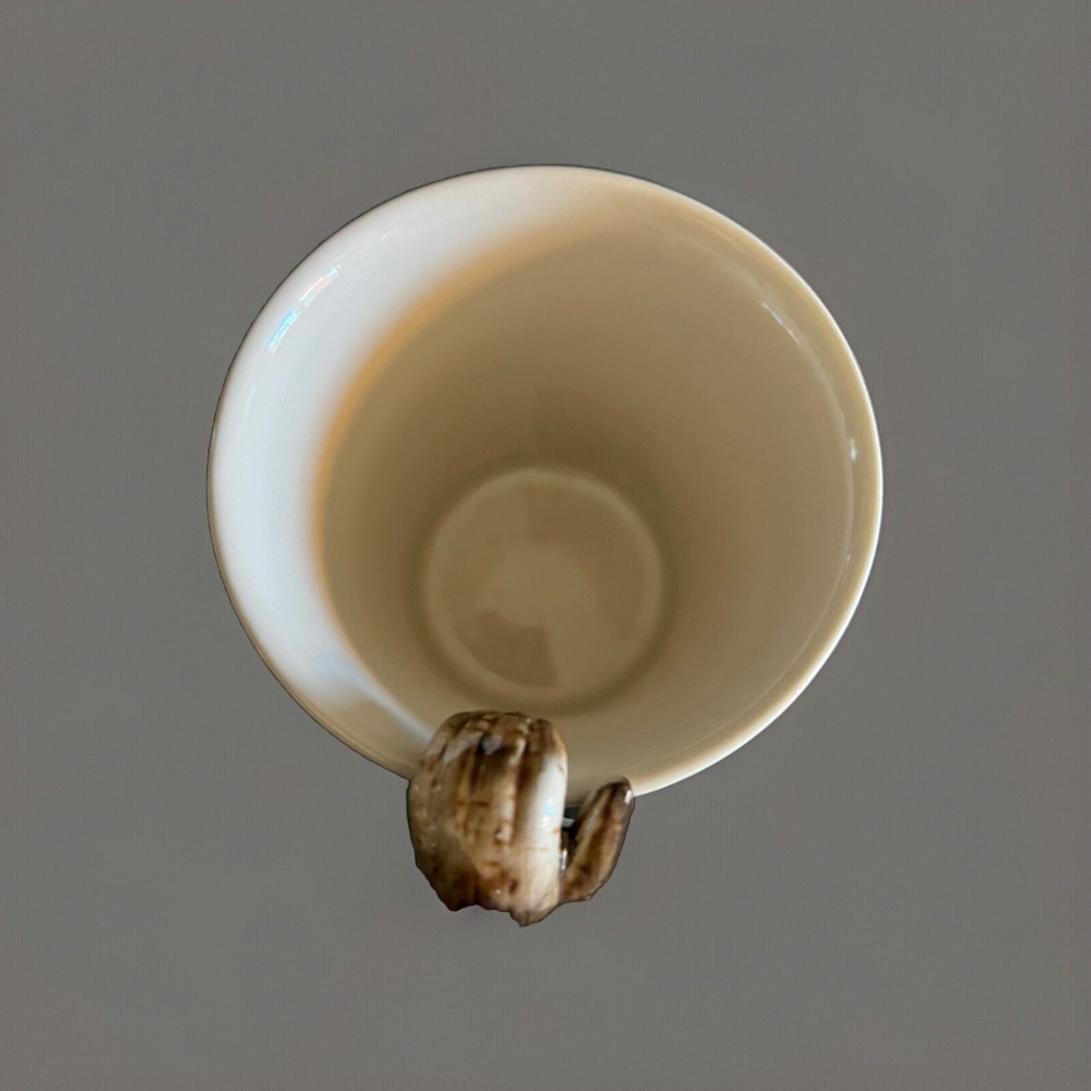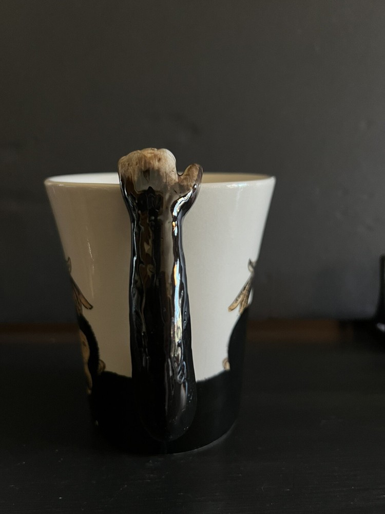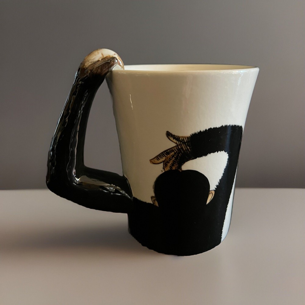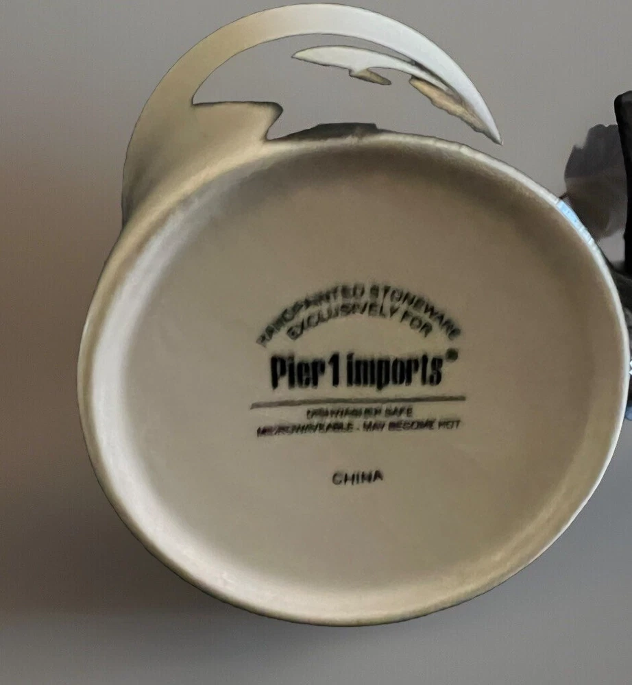 This Pier 1 Imports 16oz coffee tea mug features a figural design of a monkey/chimpanzee with a 3D arm handle. Made of porcelain with a hand-painted animal print pattern, this large mug is ideal for hot or cold beverages. It is contemporary in style and is suitable for all occasions. The mug is from the year 2021 and is original in design.