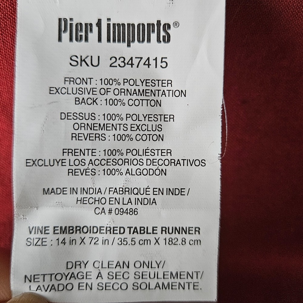 Pier 1 Imports Polyester Rust Orange Green Brown Floral Vine Print Table Runner Brand: Pier 1 Imports Color: Rust Orange Red Brown Gender: Unisex Pattern: Floral & Vines Feature: Embroidered Type: Table Runner Material: Cotton / Polyester Approx. Measurements: Lay Flat on table Width 14 in Length 72 in Pre-owned, Good Condition. - Zoom in on pics. Thank you for taking some time to check out our listing! If you are liking what you see please check out our store! Follow us and and keep an eye out for what we will be posting next!