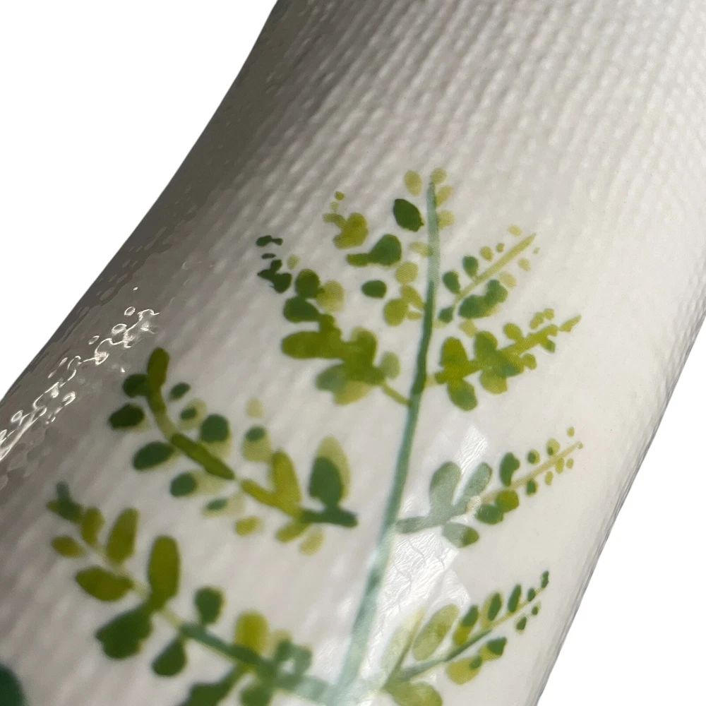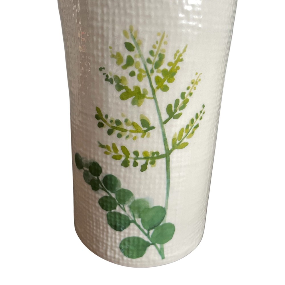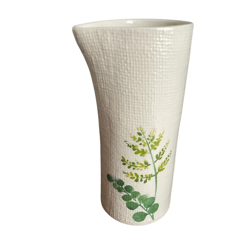 This Pier 1 Imports stoneware vase features a beige color with a green, fern leaf design. The vase is 7.5 inches tall and has a textured finish and a decorative pour spout making it a contemporary piece with a nature-inspired theme. Nearly like new condition. Ships within 1 business day