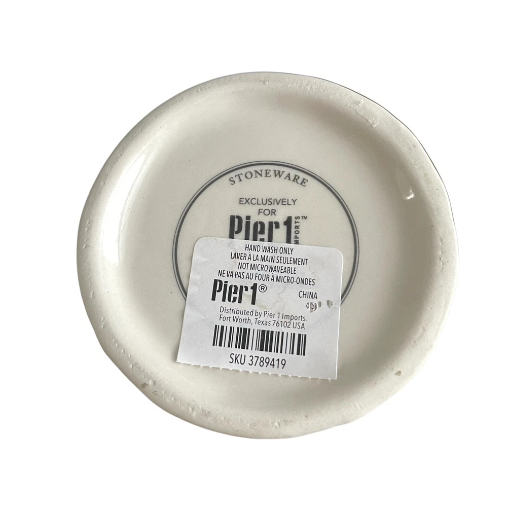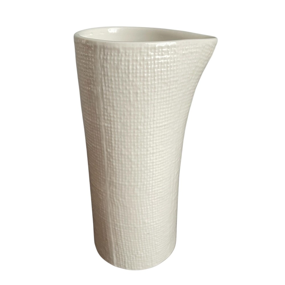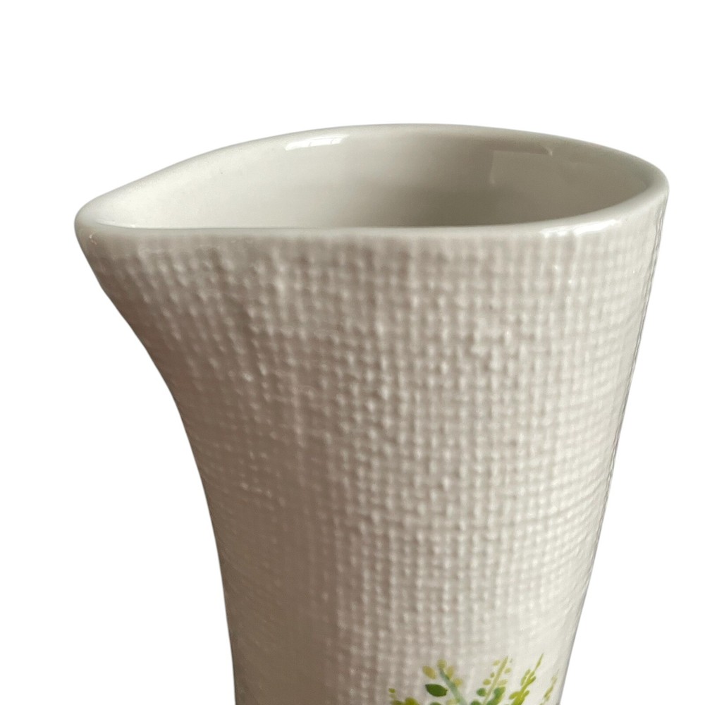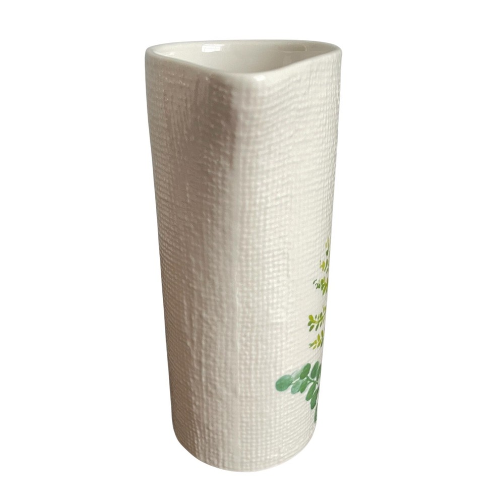 This Pier 1 Imports stoneware vase features a beige color with a green, fern leaf design. The vase is 7.5 inches tall and has a textured finish and a decorative pour spout making it a contemporary piece with a nature-inspired theme. Nearly like new condition. Ships within 1 business day