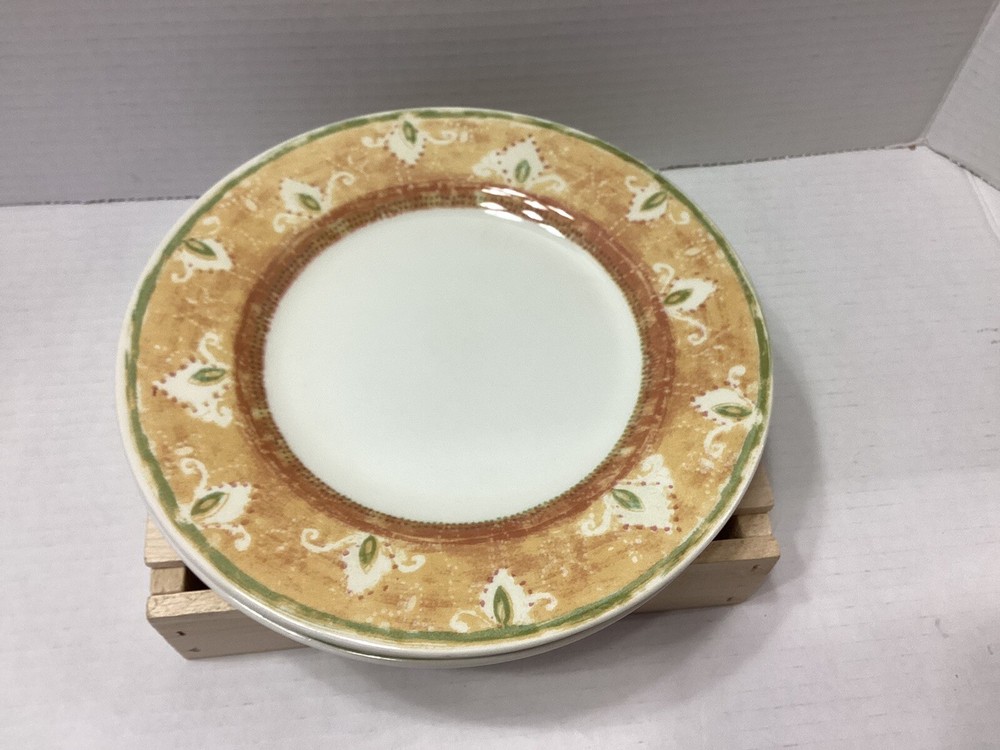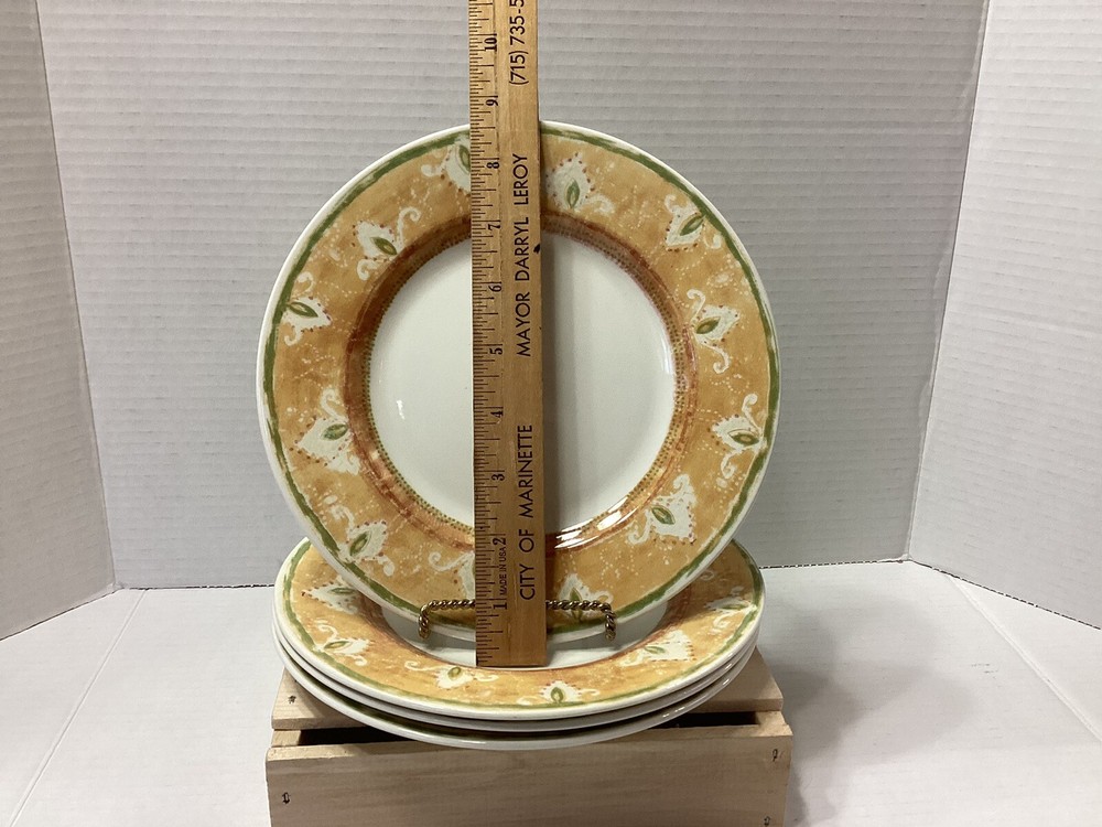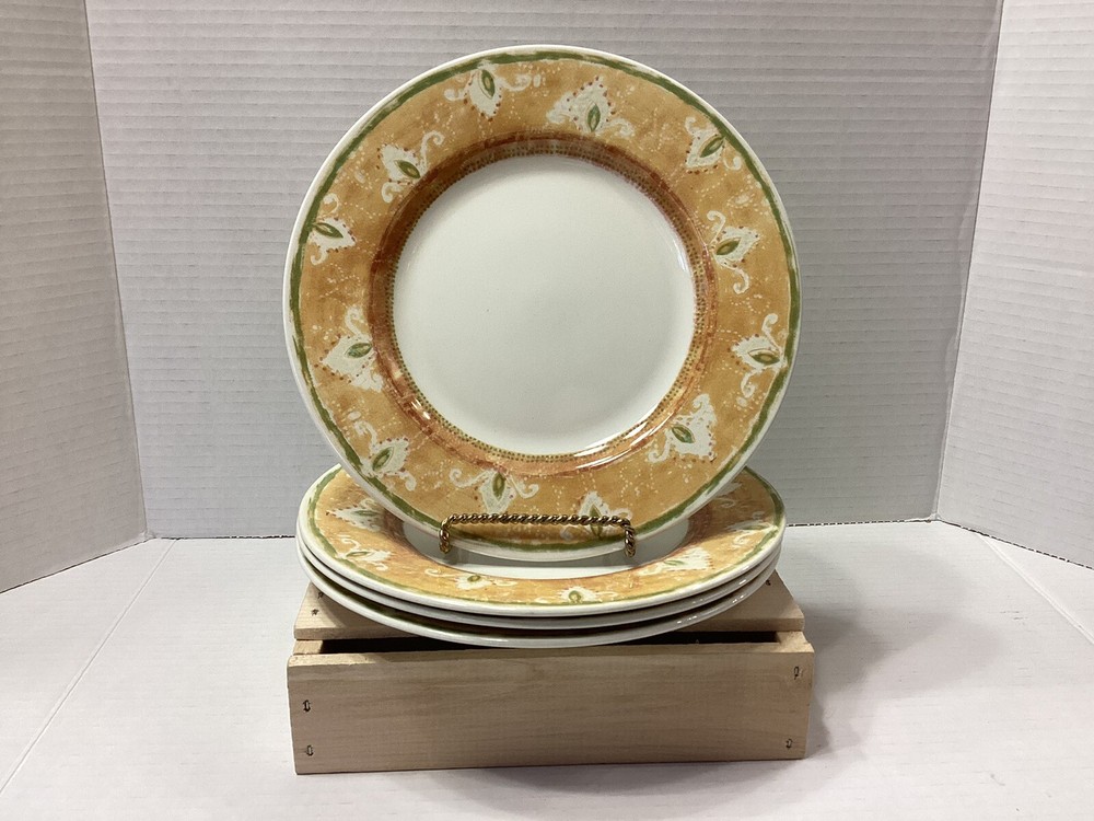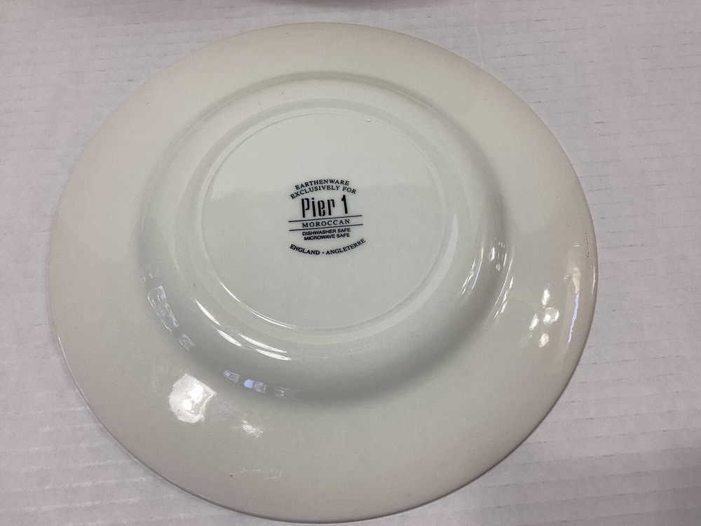 Add a touch of bohemian flair to your dinnerware collection with this set of four Pier 1 One Moroccan Salad Plates. These earthenware plates, made in England, feature a beautiful round shape and colorful Moroccan pattern that will surely impress your guests. Measuring 8 3/4 inches in diameter, these plates are perfect for serving salads or other small dishes. The set includes four plates and each of them has a unique printed backstamp. Made from ceramic materials, these salad plates are durable and perfect for everyday use. Whether you're hosting a dinner party or looking to add some character to your kitchen, these plates are a great choice.