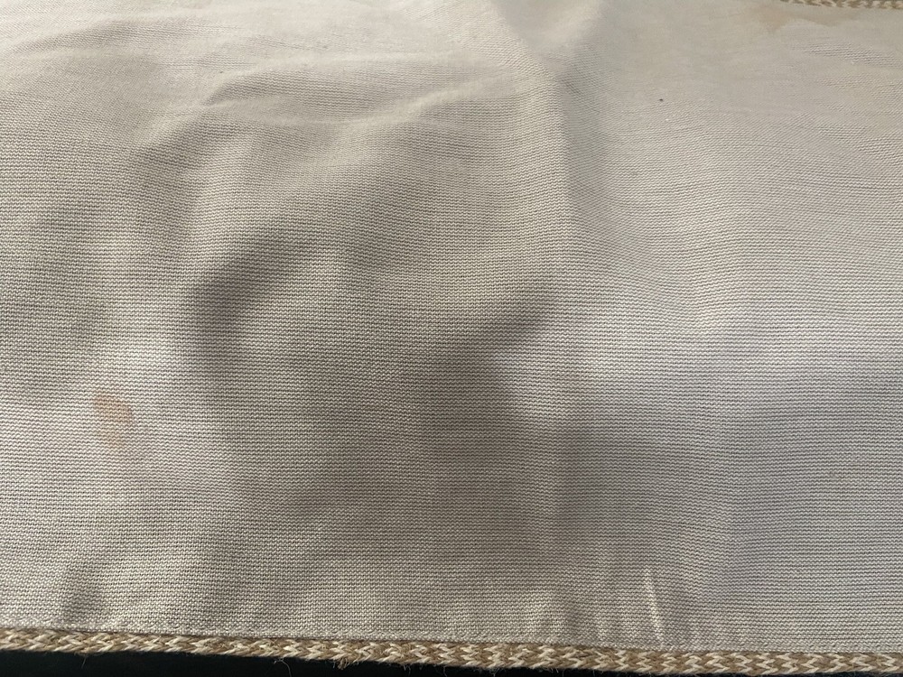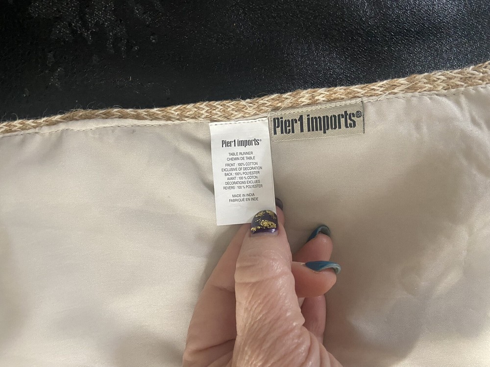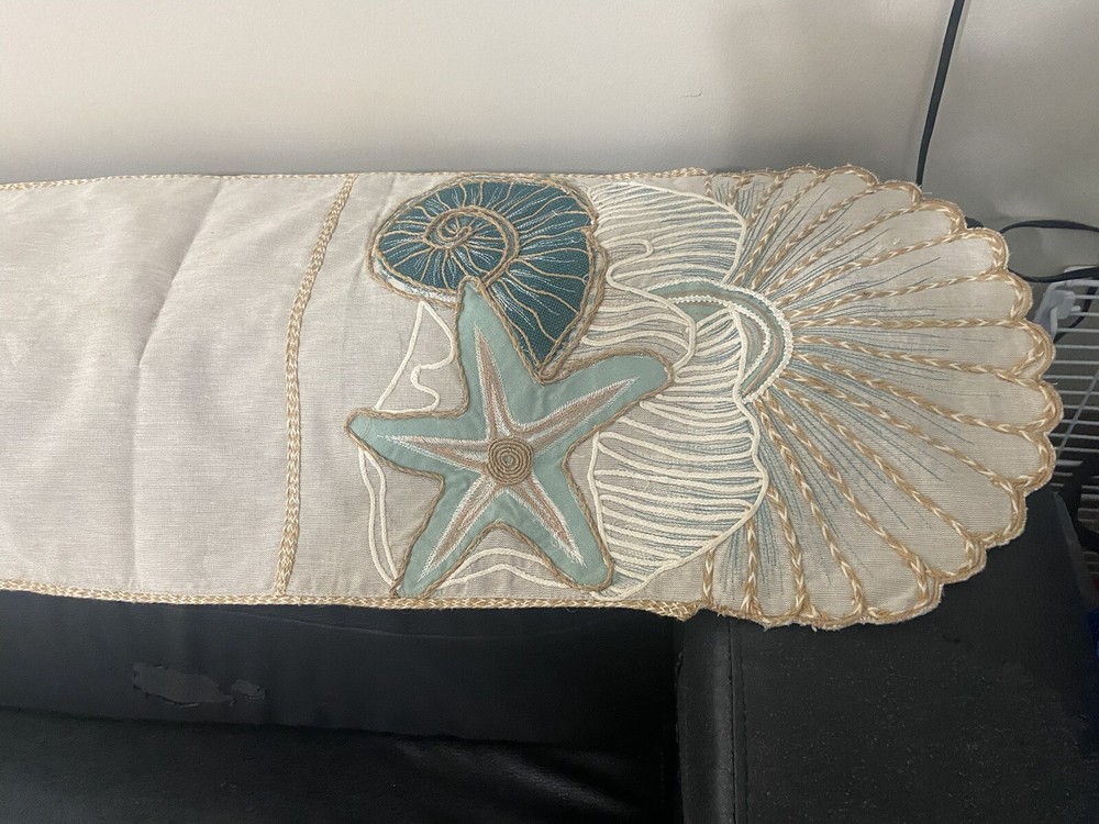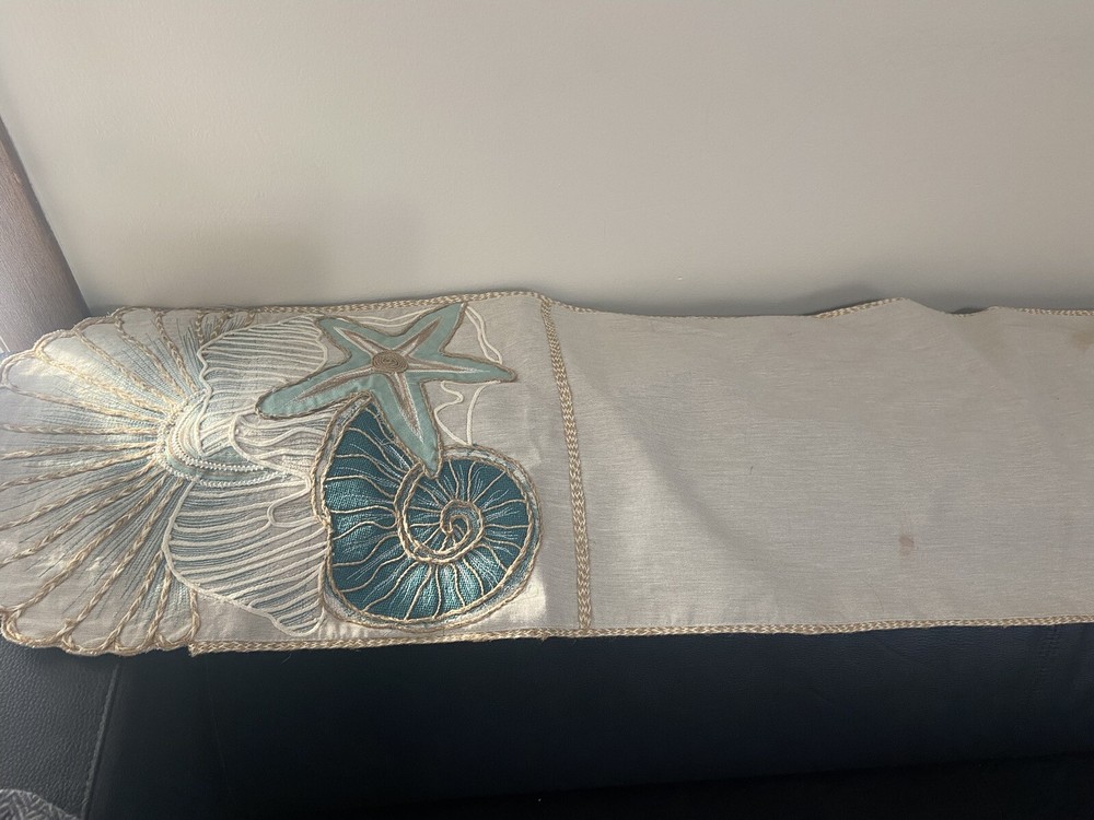 Very nice sea shell design with cording and embroidered features. There are some stains. I tried to photograph all. Can be spot cleaned. No rips, tears and smoke free home. This Pier 1 table runner features a tan color with turquoise sea shell embroidered details and corded trim. Made of a blend of cotton and polyester, it is rectangular in shape and measures 15x69 inches. The floral pattern and sea theme make it suitable for various occasions. Care instructions recommend spot cleaning.