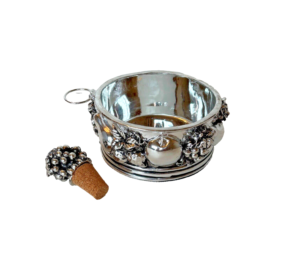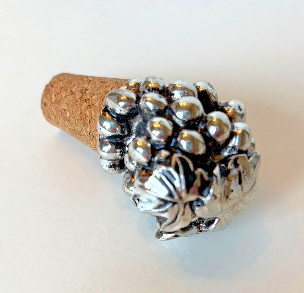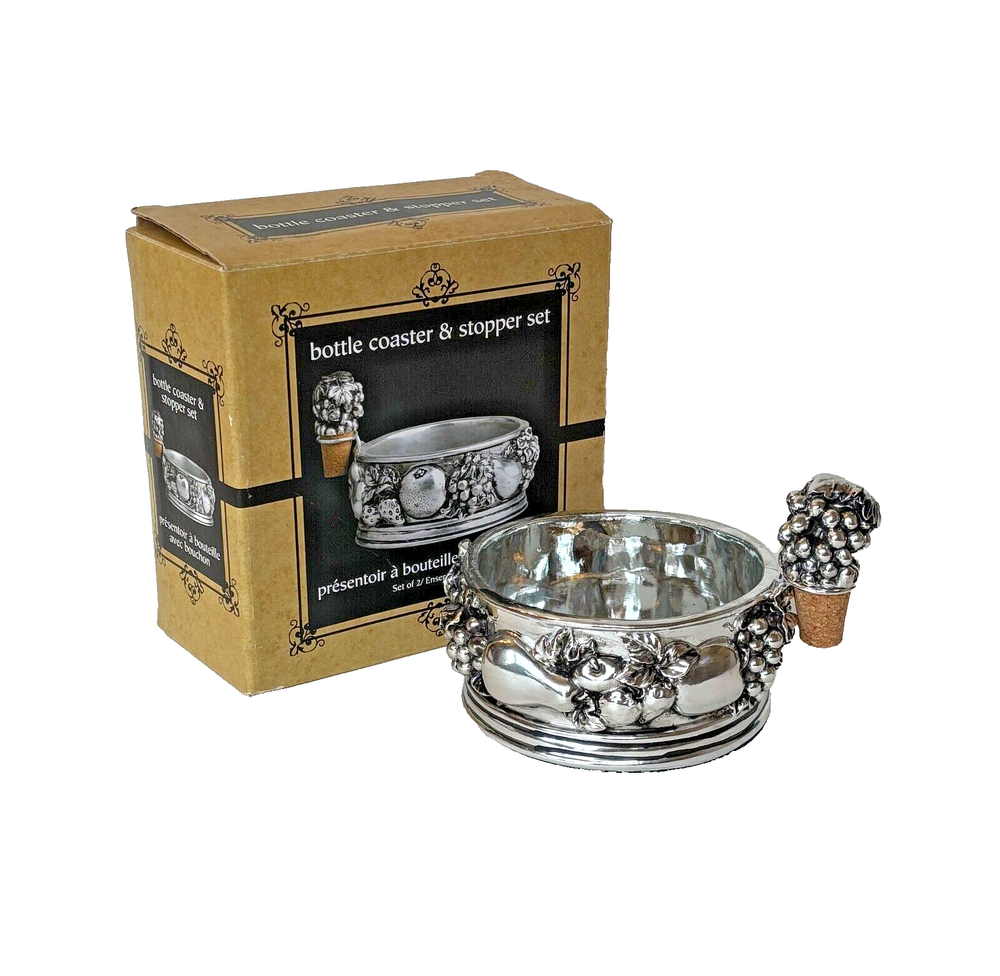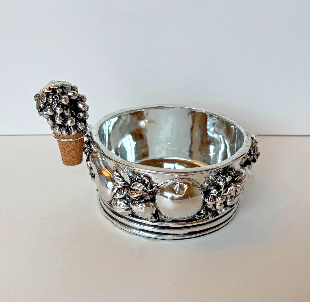 Pier 1 Imports Wine Bottle Coaster & Bottle Stopper. Ornate, 2 piece set. Sculptural 3D design of fruit: grapes, apples, pears, etc. Shiny, silver tone. Would make a lovely gift with a special bottle of wine! Dimensions: Wine Coaster 6" long, 5" wide, 2 1/4" high. Stopper 2 1/2" long, 1 1/4" diameter. Condition: Pre-owned, but new & unused in original box. Please see pictures. Shipping: USPS Ground Advantage.