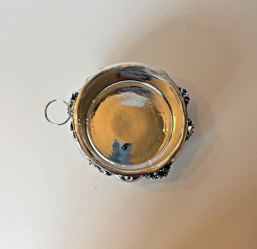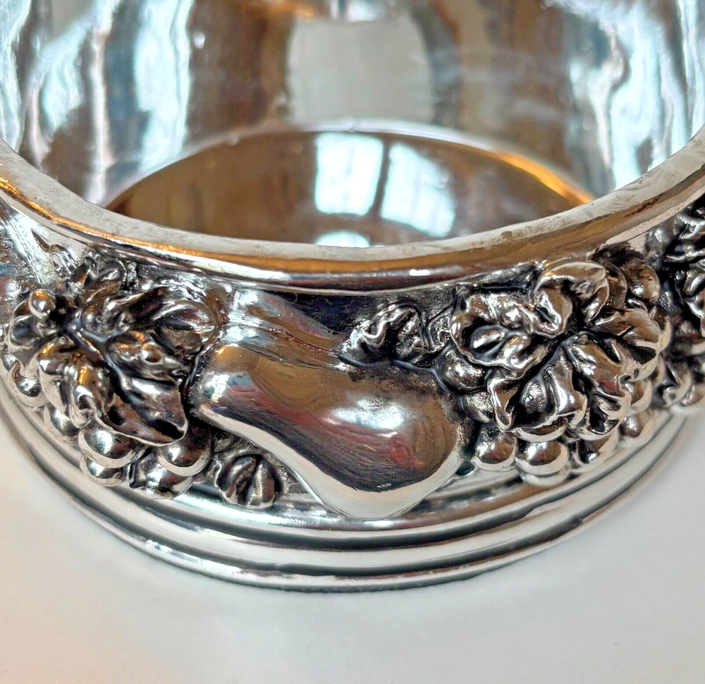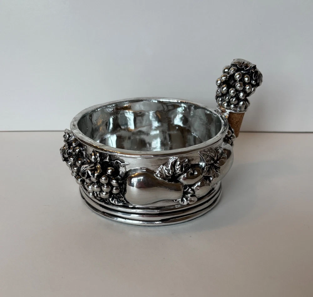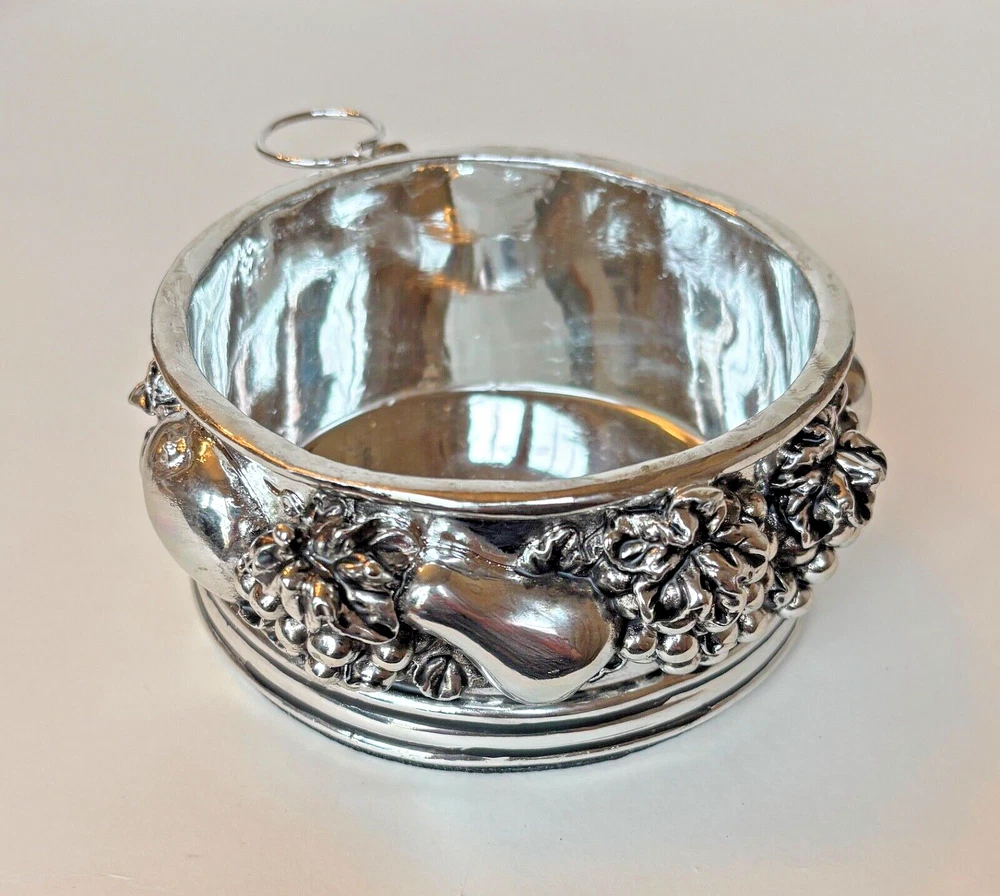 Pier 1 Imports Wine Bottle Coaster & Bottle Stopper. Ornate, 2 piece set. Sculptural 3D design of fruit: grapes, apples, pears, etc. Shiny, silver tone. Would make a lovely gift with a special bottle of wine! Dimensions: Wine Coaster 6" long, 5" wide, 2 1/4" high. Stopper 2 1/2" long, 1 1/4" diameter. Condition: Pre-owned, but new & unused in original box. Please see pictures. Shipping: USPS Ground Advantage.
