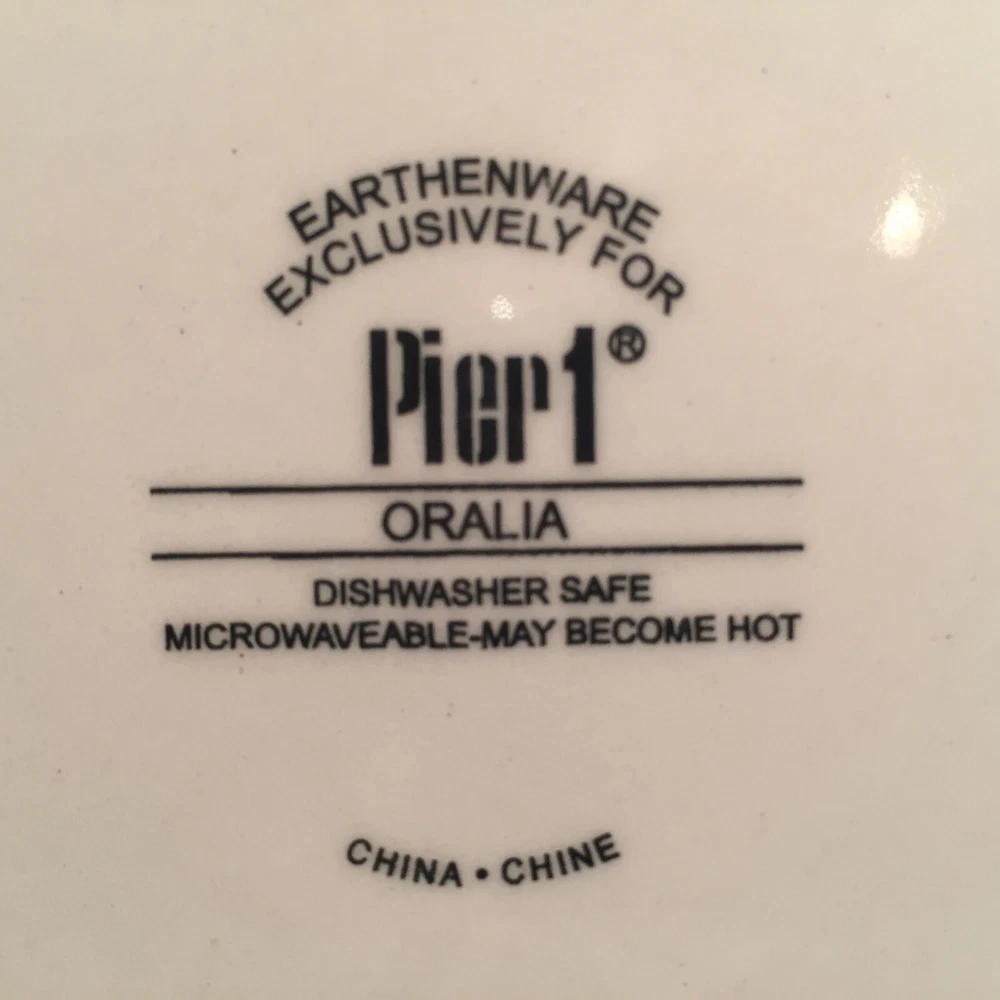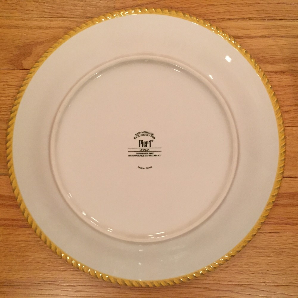 Pier 1 Oralia Earthenware Dinner Plate Scrolls Flowers Embossed Rope Edge ~ NWOB Description : Deep dish profile with scrolls, flowers and gold / yellow embossed rope rim Condition : NEW display stock from now OOB retailer. There are NO scuffs, chips, cracks, crazing, fleabites, scratches, stains, water / mineral marks, discoloration, repairs or any other cosmetic / structural issues. Even the kiln foot which is the first indication of prolonged display / use remains factory fresh. The black bottomstamp is crisp, clear and certifies: " Earthenware Exclusively For ~ [Logo] Pier 1 ® ~ Oralia ~ Dishwasher Safe ~ Microwaveable - May Become Hot ~ China • Chine " Status : Discontinued. Actual: 2008 - 2008 Measures : 11-3/4" diameter rim x 1-5/8" high x 1" deep w/ 7" dia kiln foot Please Be Aware : There is NOT a retail box, factory packing and/or COA / literature available on this offering Weighs : 2 lbs 3.4 oz plus packaging Notes : Unless NIB, factory sealed or otherwise impractical, all items are washed and sanitized prior to photography. Moisture exposes crazing that otherwise may be invisible. All items are stored in a smoke and pet free environment. I invest the time to provide accurate and concise descriptions which include images, measurements, weights, condition and any other relevant or interesting information. Please review and clarify any questions before purchasing. Will be bubble wrapped and/or otherwise packaged so as to ensure an incident free delivery In the unlikely event of shipping damage, I will process the carrier claim. However, if the tracking number confirms delivery i.e., "Lost", it shall be the buyer's responsibility to work through the claim process with the carrier and/or eBay. I will post your buyer feedback immediately upon receipt of my seller feedback. Thank you for looking