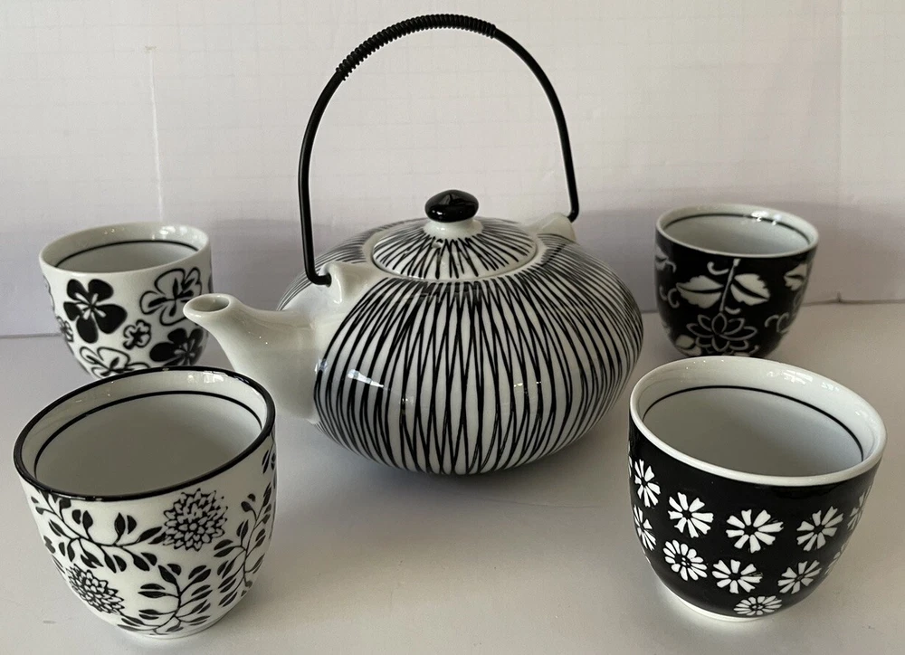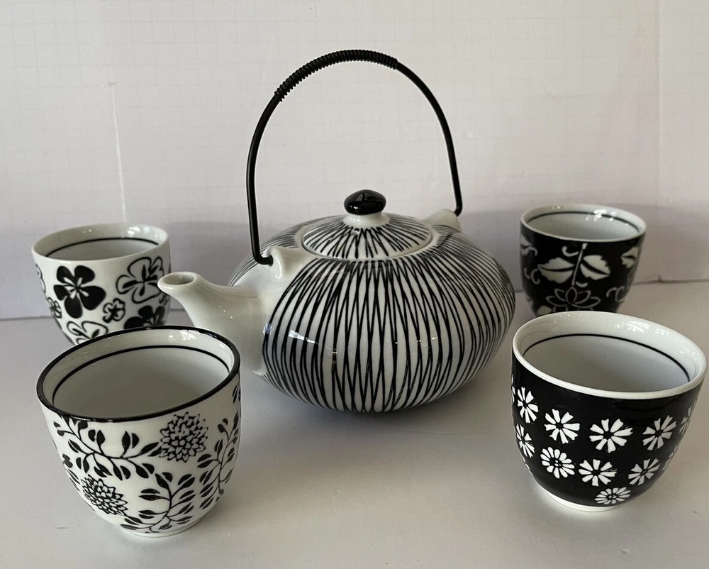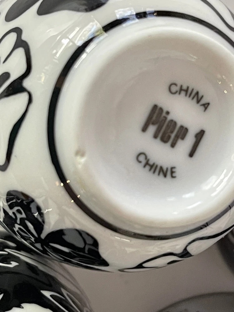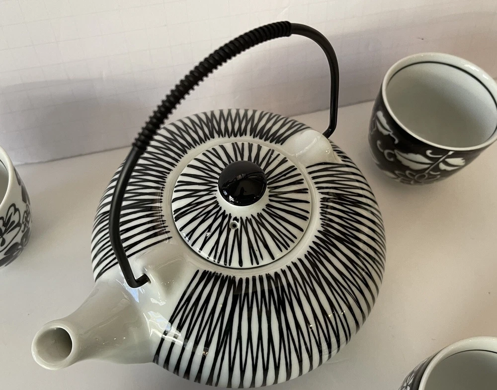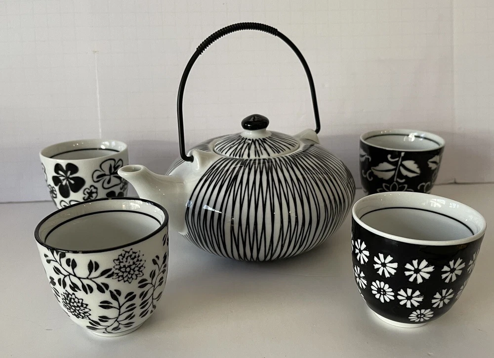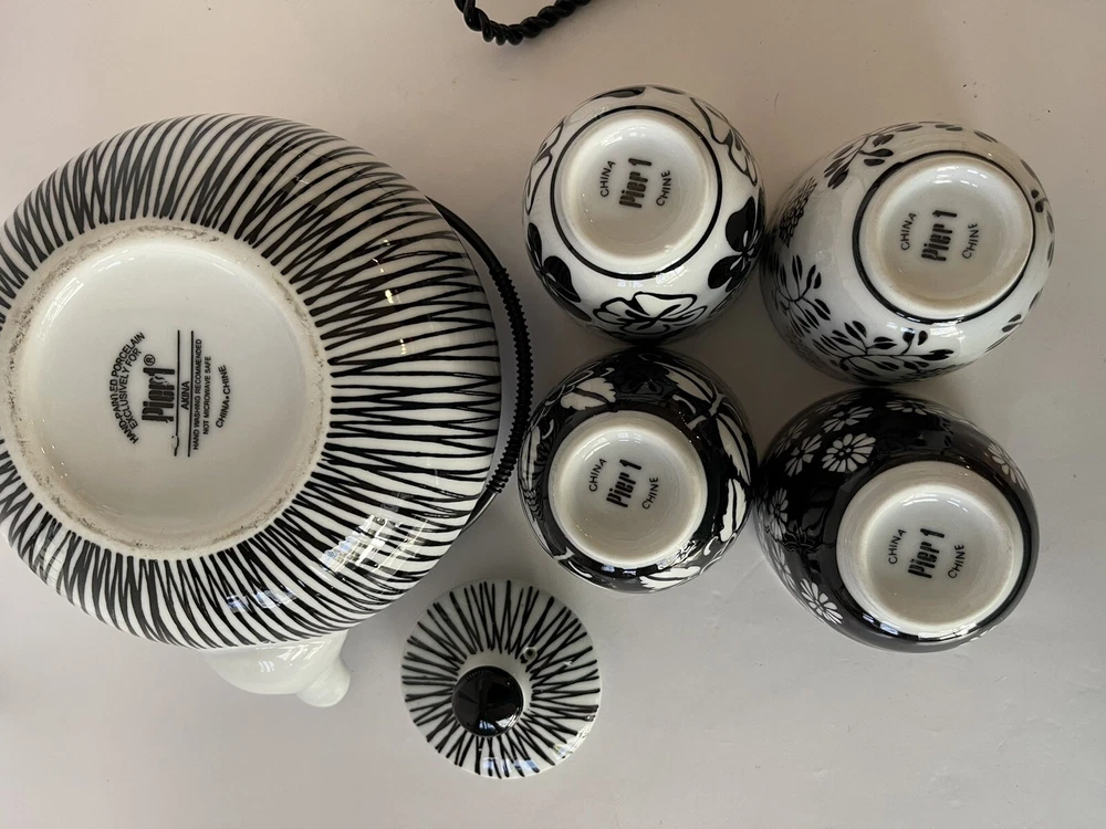 Pier 1 Imports teapot set: 1 Akina white with black diamond striping pattern Teapot and a metal handle. Four coordinating cups: white and black designs to complement the design of the teapot. All five pieces are made of porcelain and is handpainted. Looking at the cups and the teapot, they look unused. I did find one tiny chip on the bottom of one of the cups. The chip is not noticeable unless she picked the cup up and examine it closely under a light.